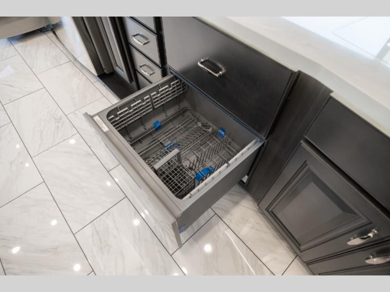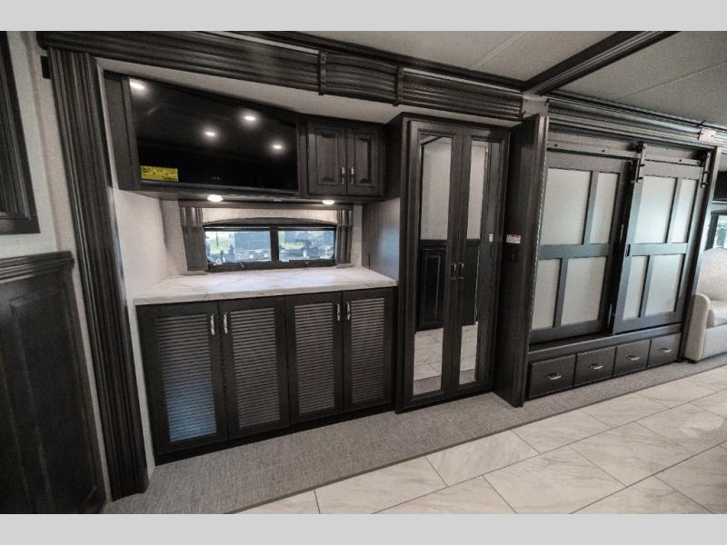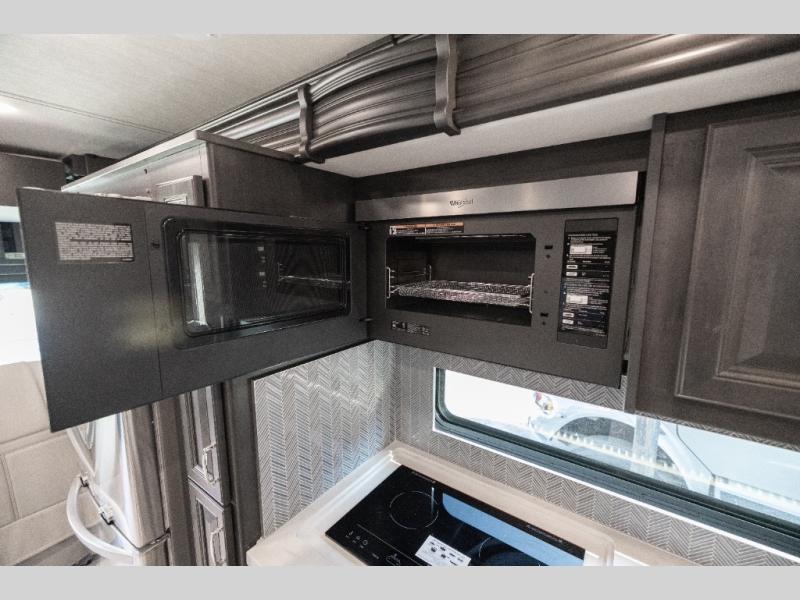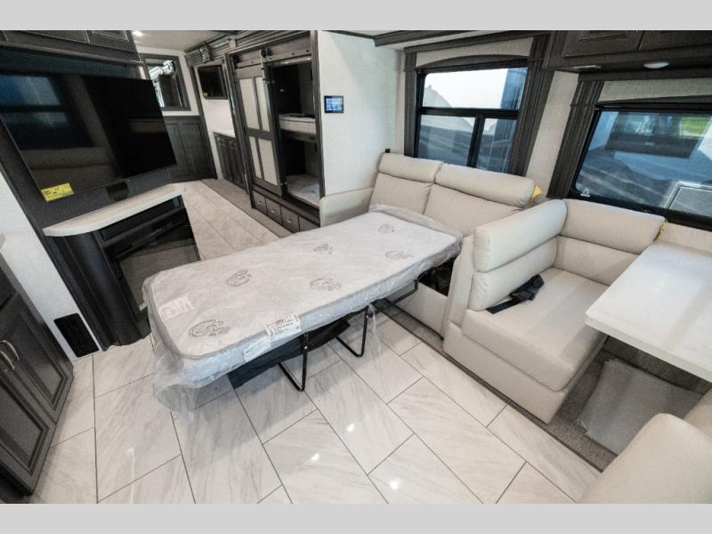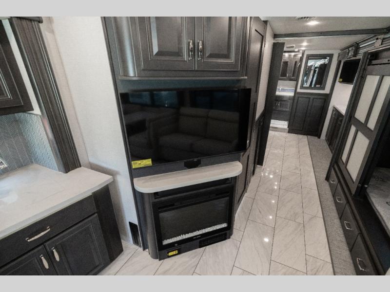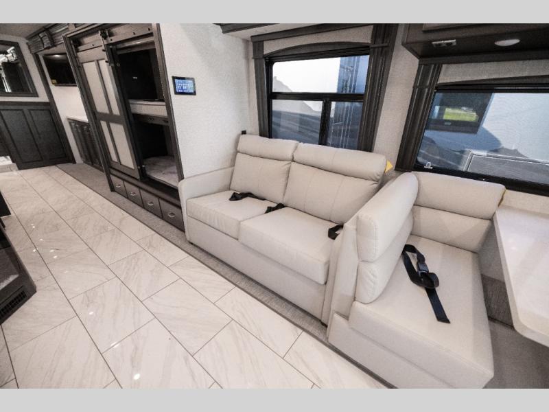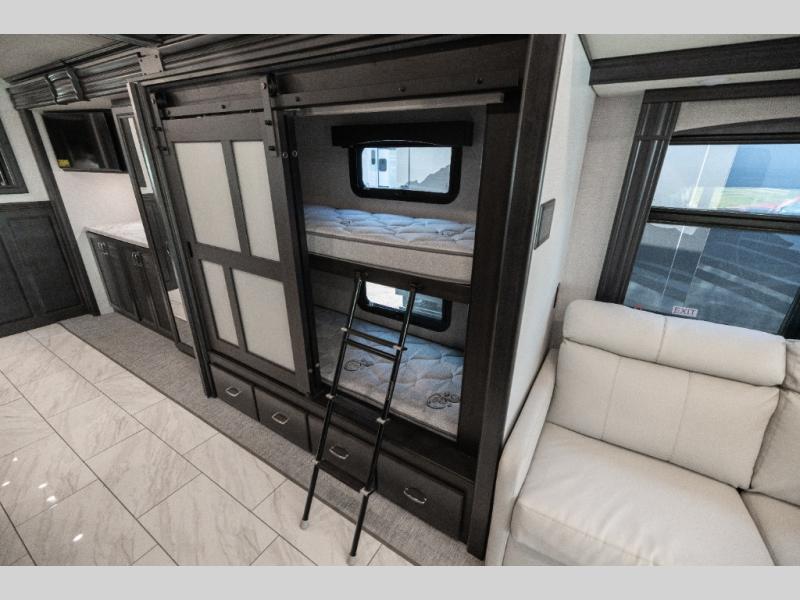 This coach offers a family or a couple that enjoys entertaining overnight guests plenty of sleeping space with the convertible bunk beds with barn doors. You can sleep even more guests when the optional Hide-A-Bed power drop-down overhead bunk is added, plus the sofa sleeper with pull-out twin bed and the booth dinette. The main living area also has an LED TV with a fireplace below and an LED TV over the cab to watch. The two full bathrooms shorten the waiting lines, and are convenient for all. The rear bathroom that is attached to the master bedroom even has a bedroom wardrobe. The bedroom provides a king bed slide for more floor space, and a side-by-side washer/dryer to keep everything clean while on the road, an LED TV to watch before bedtime, and more clothing storage. The kitchen offers stainless steel appliances, a convection microwave, an induction cooktop and so much more!