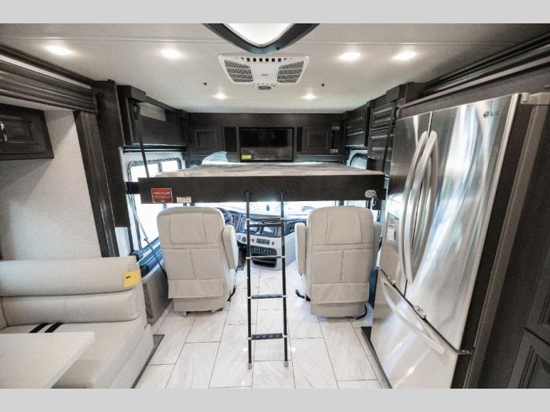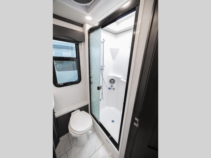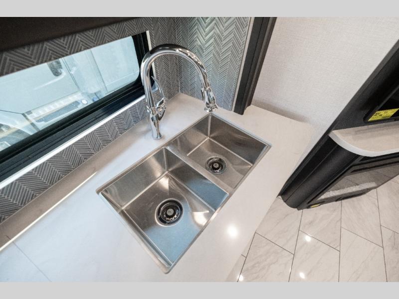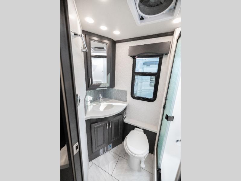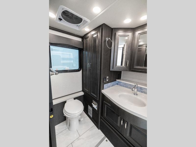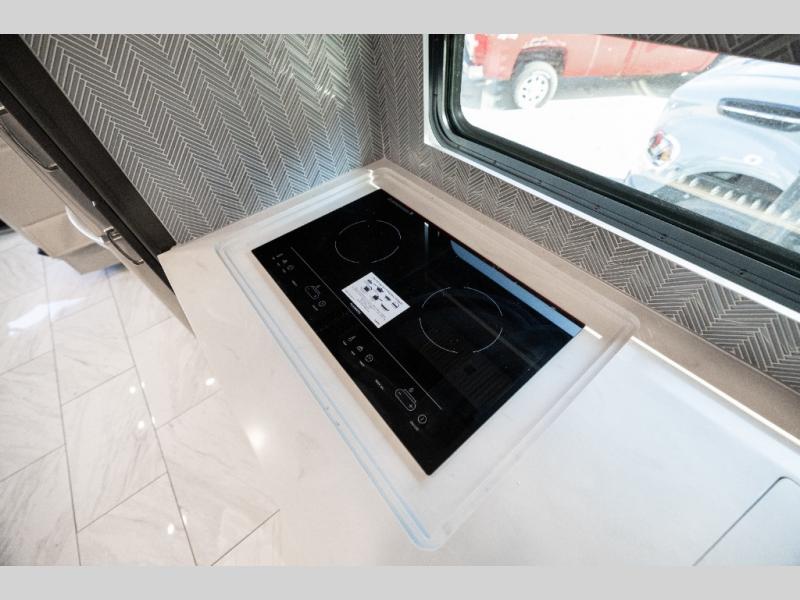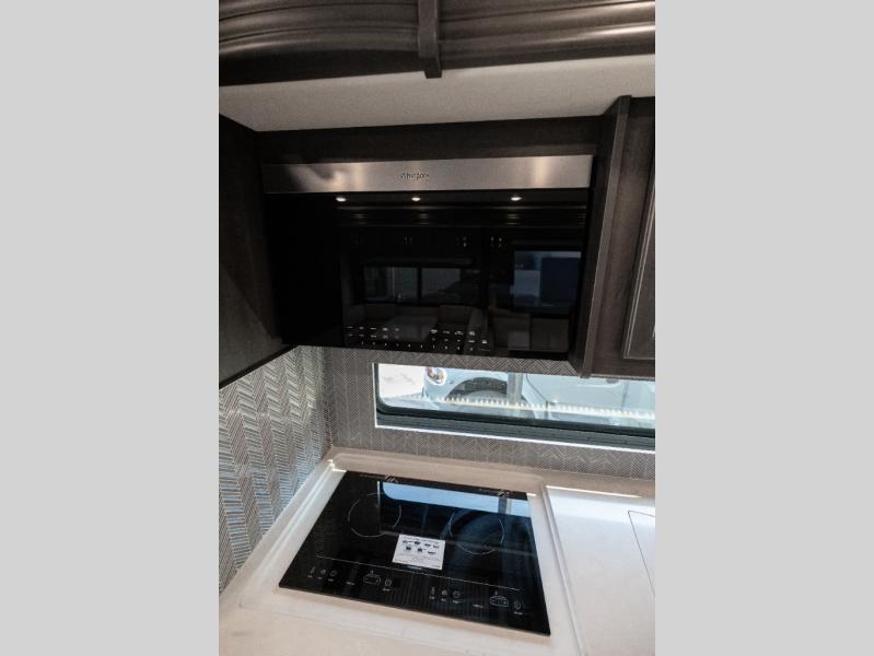 This coach offers a family or a couple that enjoys entertaining overnight guests plenty of sleeping space with the convertible bunk beds with barn doors. You can sleep even more guests when the optional Hide-A-Bed power drop-down overhead bunk is added, plus the sofa sleeper with pull-out twin bed and the booth dinette. The main living area also has an LED TV with a fireplace below and an LED TV over the cab to watch. The two full bathrooms shorten the waiting lines, and are convenient for all. The rear bathroom that is attached to the master bedroom even has a bedroom wardrobe. The bedroom provides a king bed slide for more floor space, and a side-by-side washer/dryer to keep everything clean while on the road, an LED TV to watch before bedtime, and more clothing storage. The kitchen offers stainless steel appliances, a convection microwave, an induction cooktop and so much more!