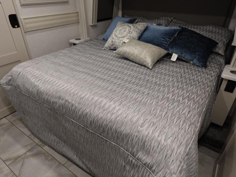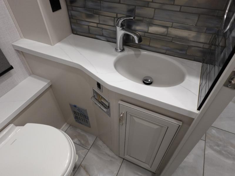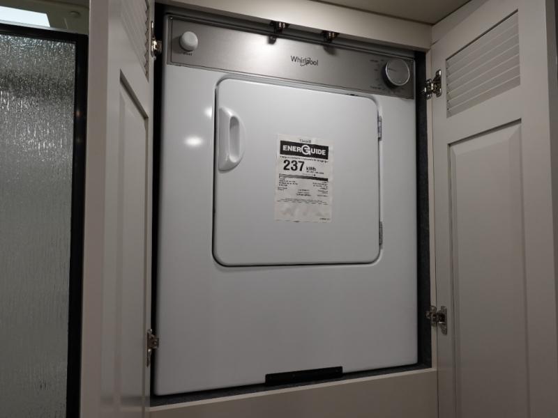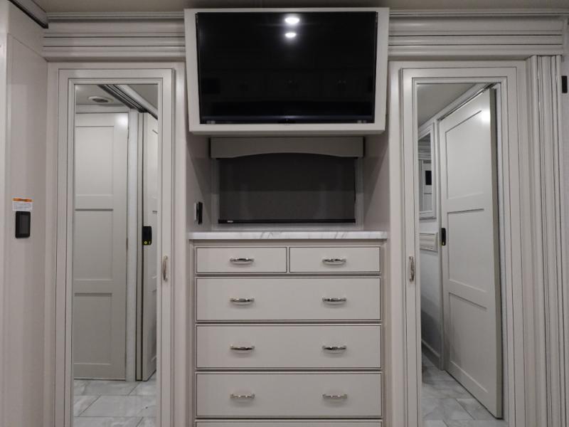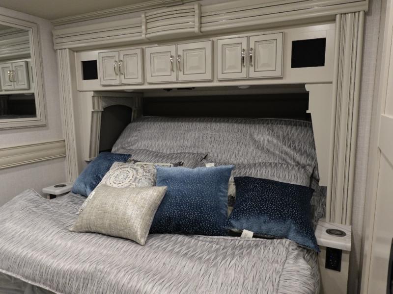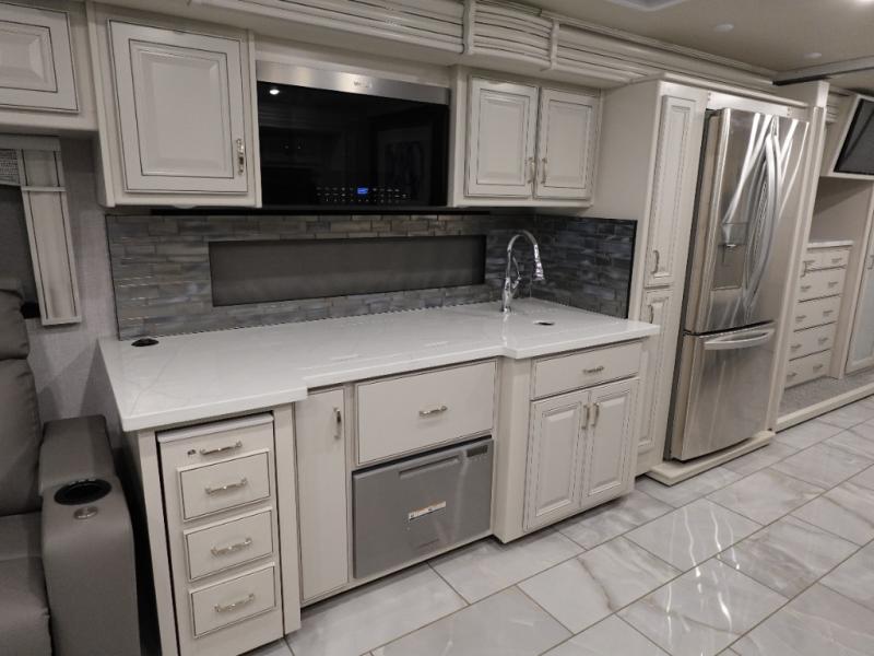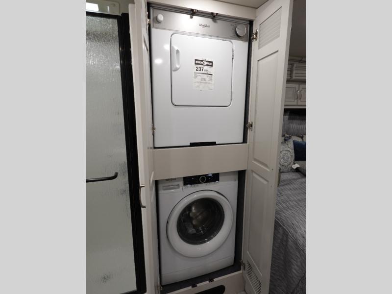Travel for the love of it, work while traveling, or drive across country to see family and friends! You can do it all in this coach with luxury and residential features throughout and with many conveniences and comforts to keep you on the road. You will love the spacious full bathroom off of the master bedroom that offers two sinks, a fiberglass shower with a seat, glass door and designer shower head assembly. You will be able to keep everything clean using the stackable washer/dryer, and there is a linen closet for fresh towels. The king bed slide provides more floor space, and the two wardrobes, dresser and LED TV are more highlights in the bedroom. The mid-coach half bath is convenient especially when you have guests, and the sofa sleeper with pull-out full bed and the loveseat offer more sleeping space. You might like to add the Hide-A-Bed power drop-down overhead bunk option so you can invite more overnight guests. And the kitchen is something to boast about with the convection microwave, the residential refrigerator and the style of the polished solid surface galley countertop with lighting.