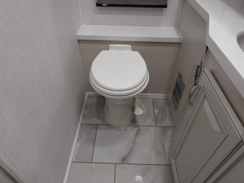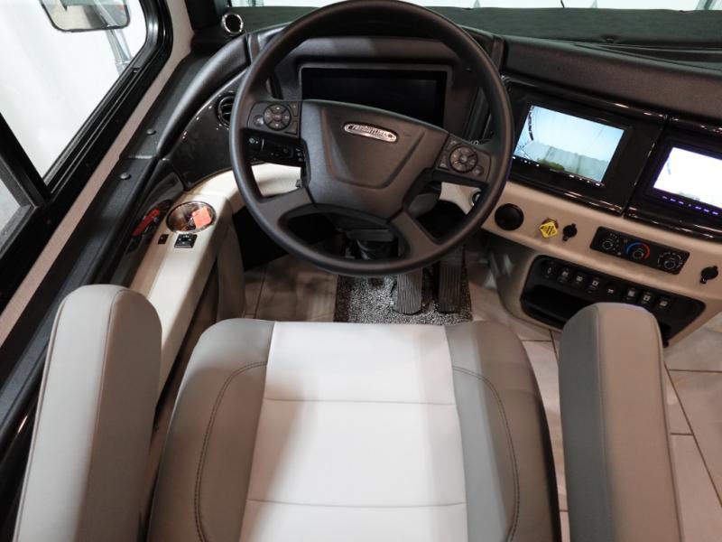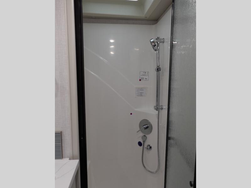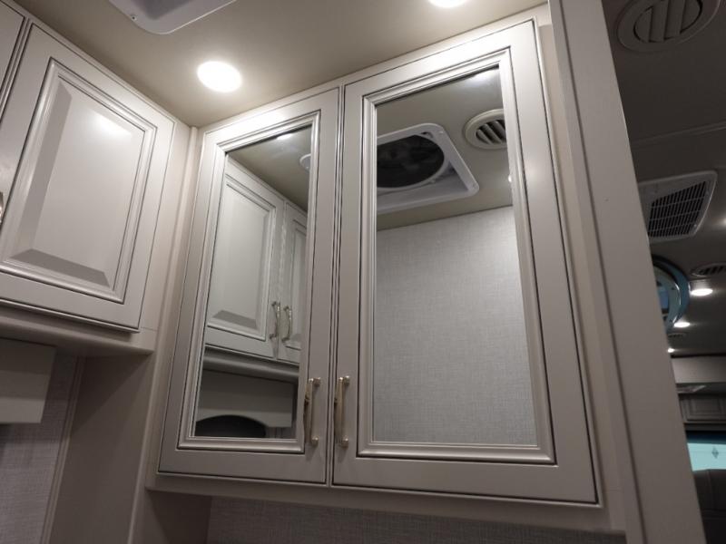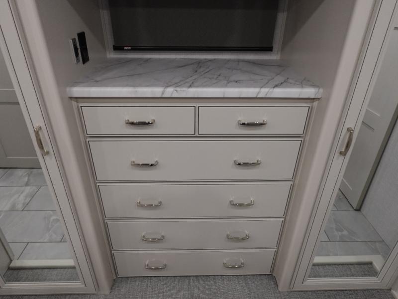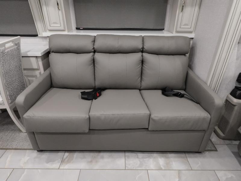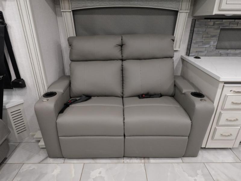 Travel for the love of it, work while traveling, or drive across country to see family and friends! You can do it all in this coach with luxury and residential features throughout and with many conveniences and comforts to keep you on the road. You will love the spacious full bathroom off of the master bedroom that offers two sinks, a fiberglass shower with a seat, glass door and designer shower head assembly. You will be able to keep everything clean using the stackable washer/dryer, and there is a linen closet for fresh towels. The king bed slide provides more floor space, and the two wardrobes, dresser and LED TV are more highlights in the bedroom. The mid-coach half bath is convenient especially when you have guests, and the sofa sleeper with pull-out full bed and the loveseat offer more sleeping space. You might like to add the Hide-A-Bed power drop-down overhead bunk option so you can invite more overnight guests. And the kitchen is something to boast about with the convection microwave, the residential refrigerator and the style of the polished solid surface galley countertop with lighting.