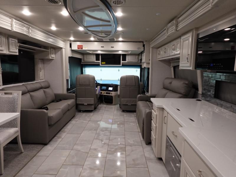 With any Fleetwood Discovery Class A diesel motorhome, the Freedom Bridge custom chassis, the V-Ride suspension, and the Cummins B6.7 engine offer a smooth and enjoyable ride to all your destinations. The construction also includes a one-piece fiberglass exterior roof with a sleek appearance, low maintenance, and long-lasting durability. The interior cabin includes full hand-laid porcelain flooring throughout and a heated floor in the living area, making traveling convenient. And you will love the residential-style furniture by Apex Custom Furniture interior decor. Additionally, these models feature three 15,000 BTU A/C units with rear heat pump, large holding tank capacities, and generous interior and exterior storage, making them ideal for storing all your gear. Choose to travel and live better in a Discovery!