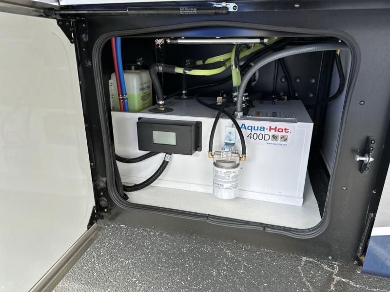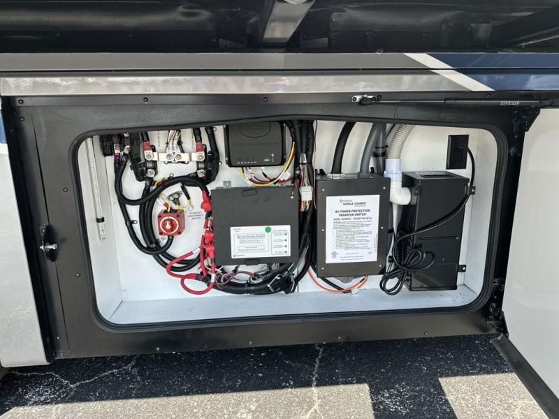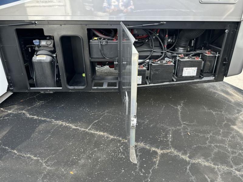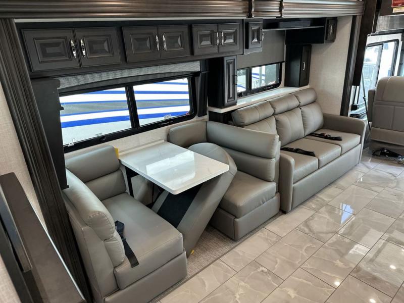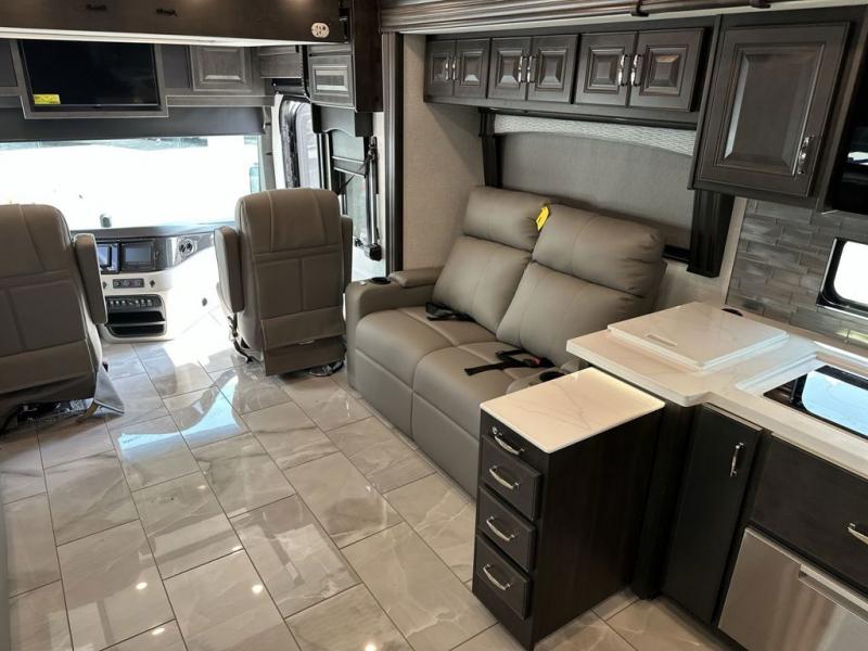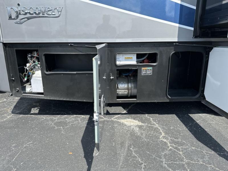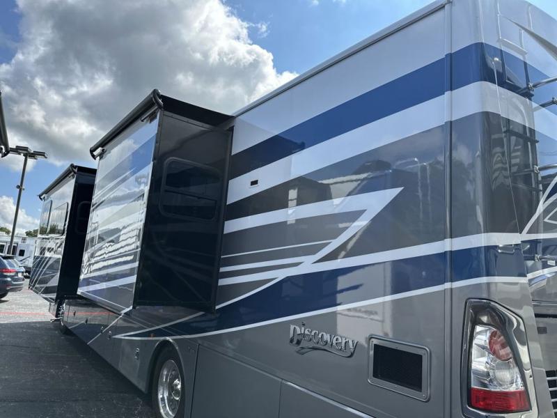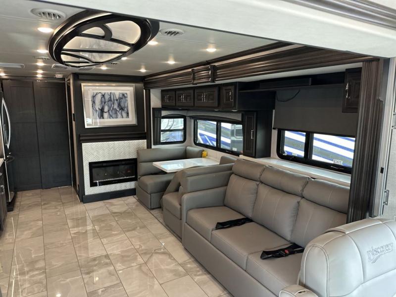 With any Fleetwood Discovery Class A diesel motorhome, the Freedom Bridge custom chassis, the V-Ride rear suspension, and the Cummins B6.7 engine offer a smooth and enjoyable ride to all your destinations. The construction also includes the Powerlock System with interlocking floor, walls and roof, heated fresh water and holding tank compartments, and a full coverage heavy duty undercoating. The interior cabin includes an LED OptiView instrument panel, an air suspension deflation system, and a 10.2" stereo touch screen with lots of functions making traveling easier. And you will love the style of the interior decor and cabinetry, energy efficient LED flush mount ceiling lighting, polished solid surface galley countertop with lighting, residential features throughout, and all the entertainment. Choose to travel and live better in a Discovery!