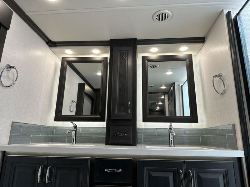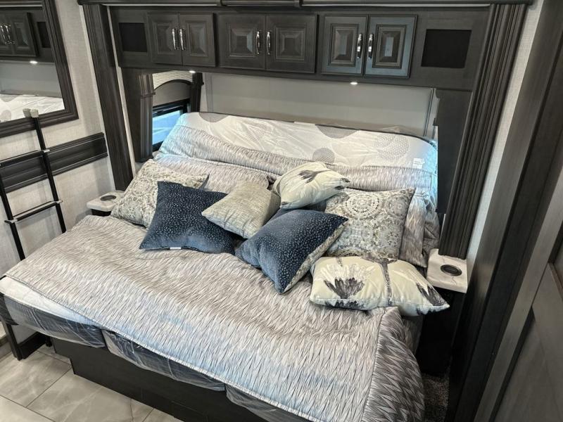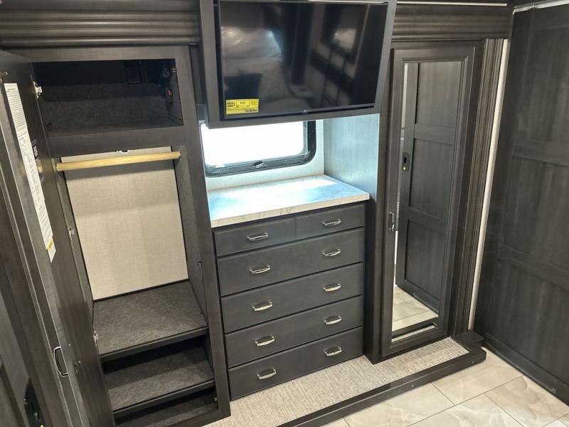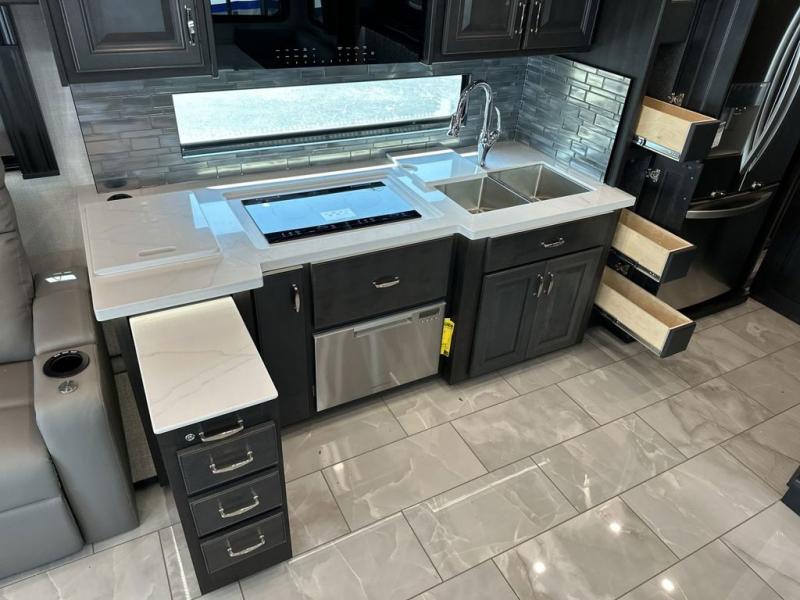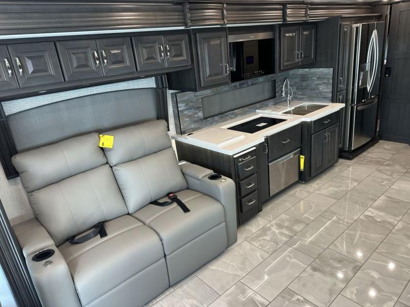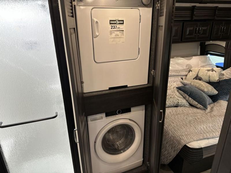Travel for the love of it, work while traveling, or drive across country to see family and friends! You can do it all in this coach with luxury and residential features throughout and with many conveniences and comforts to keep you on the road. You will love the spacious full bathroom off of the master bedroom that offers two sinks, a fiberglass shower with a seat, glass door and designer shower head assembly. You will be able to keep everything clean using the stackable washer/dryer, and there is a linen closet for fresh towels. The king bed slide provides more floor space, and the two wardrobes, dresser and LED TV are more highlights in the bedroom. The mid-coach half bath is convenient especially when you have guests, and the sofa sleeper with pull-out full bed and the loveseat offer more sleeping space. You might like to add the Hide-A-Bed power drop-down overhead bunk option so you can invite more overnight guests. And the kitchen is something to boast about with the convection microwave, the residential refrigerator and the style of the polished solid surface galley countertop with lighting.