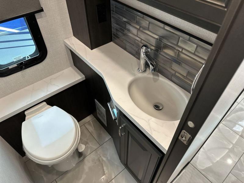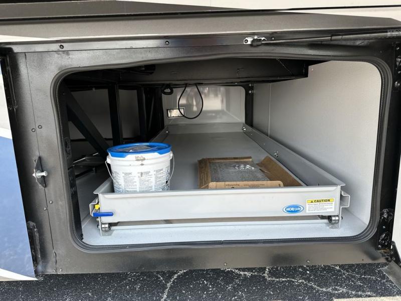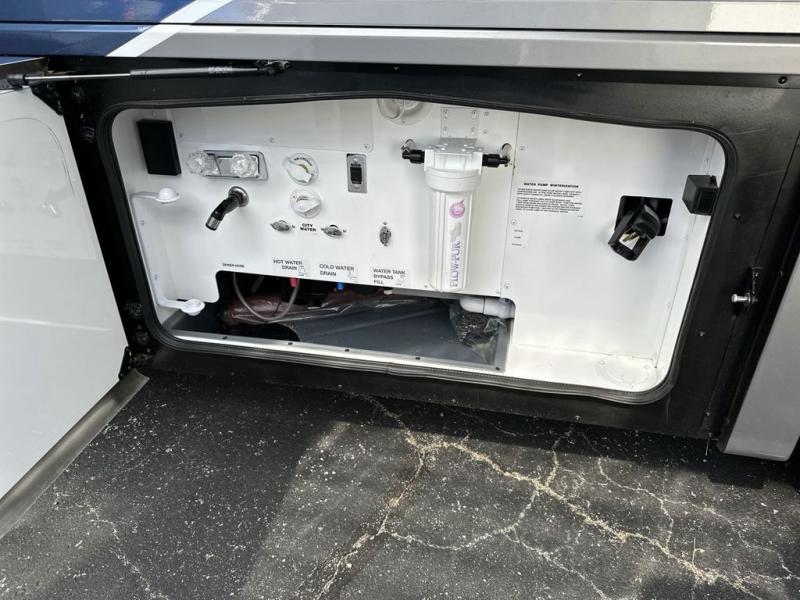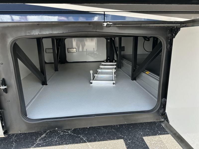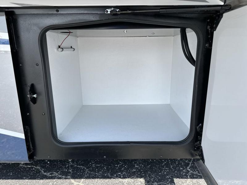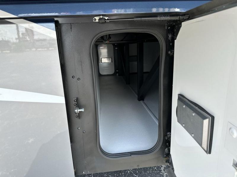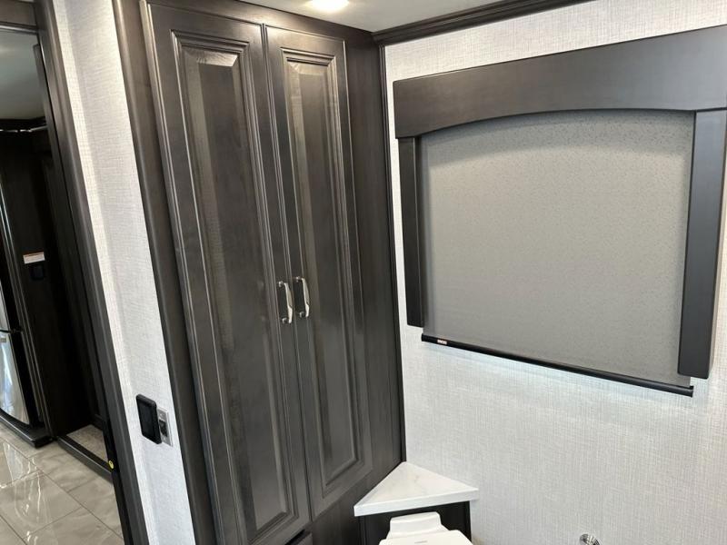 Travel for the love of it, work while traveling, or drive across country to see family and friends! You can do it all in this coach with luxury and residential features throughout and with many conveniences and comforts to keep you on the road. You will love the spacious full bathroom off of the master bedroom that offers two sinks, a fiberglass shower with a seat, glass door and designer shower head assembly. You will be able to keep everything clean using the stackable washer/dryer, and there is a linen closet for fresh towels. The king bed slide provides more floor space, and the two wardrobes, dresser and LED TV are more highlights in the bedroom. The mid-coach half bath is convenient especially when you have guests, and the sofa sleeper with pull-out full bed and the loveseat offer more sleeping space. You might like to add the Hide-A-Bed power drop-down overhead bunk option so you can invite more overnight guests. And the kitchen is something to boast about with the convection microwave, the residential refrigerator and the style of the polished solid surface galley countertop with lighting.