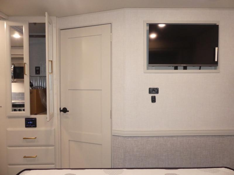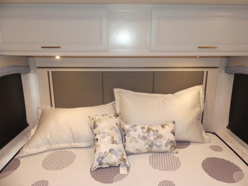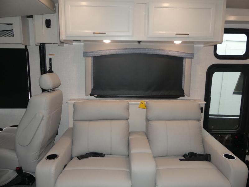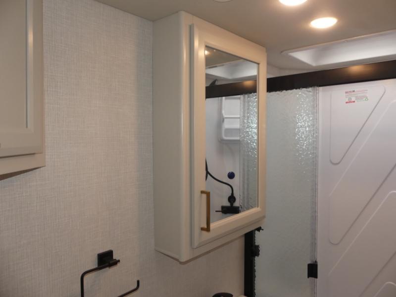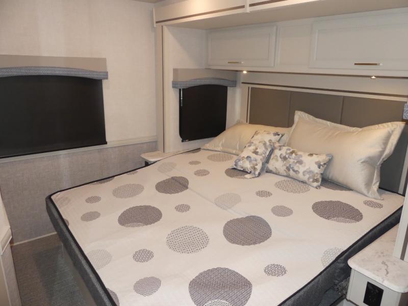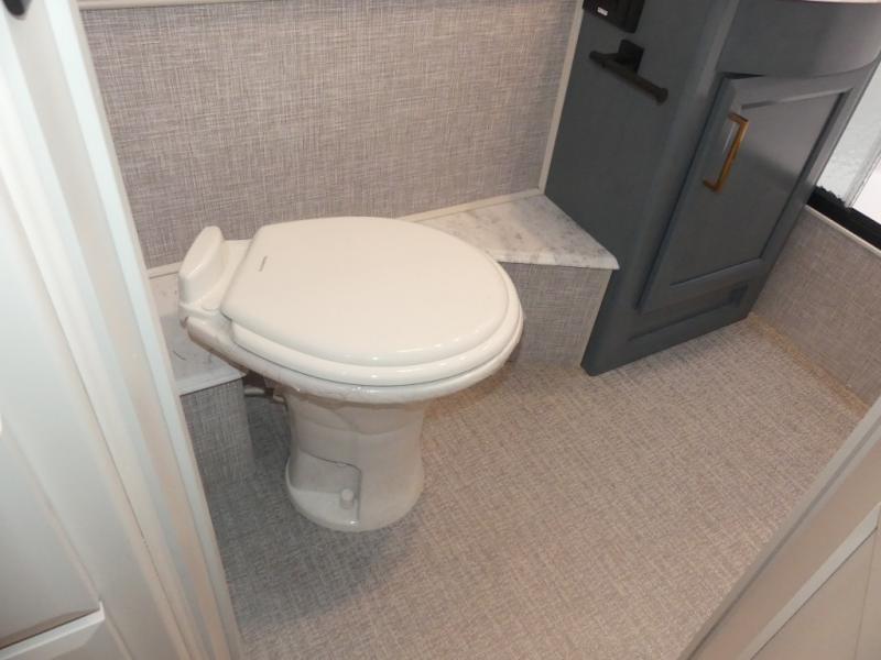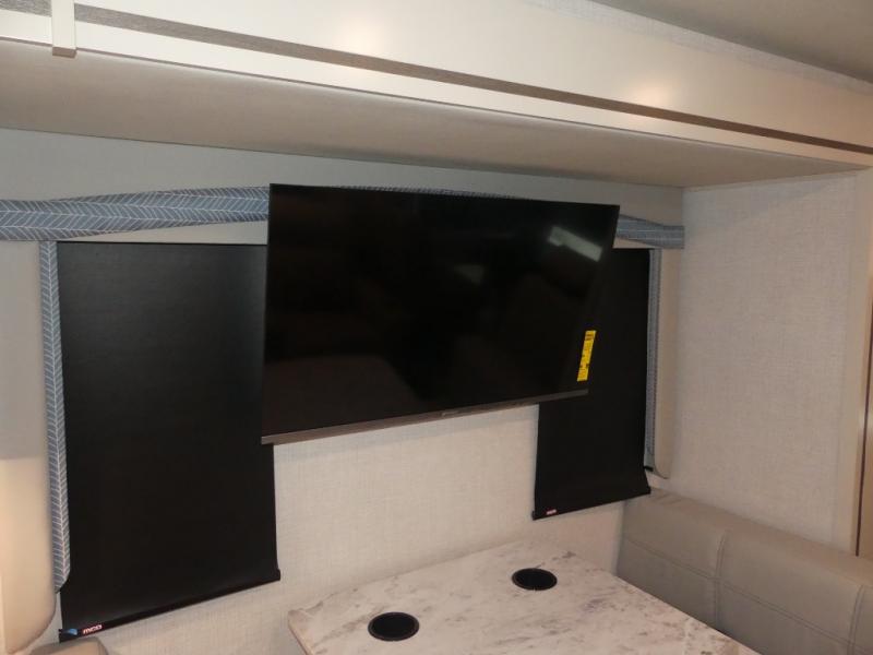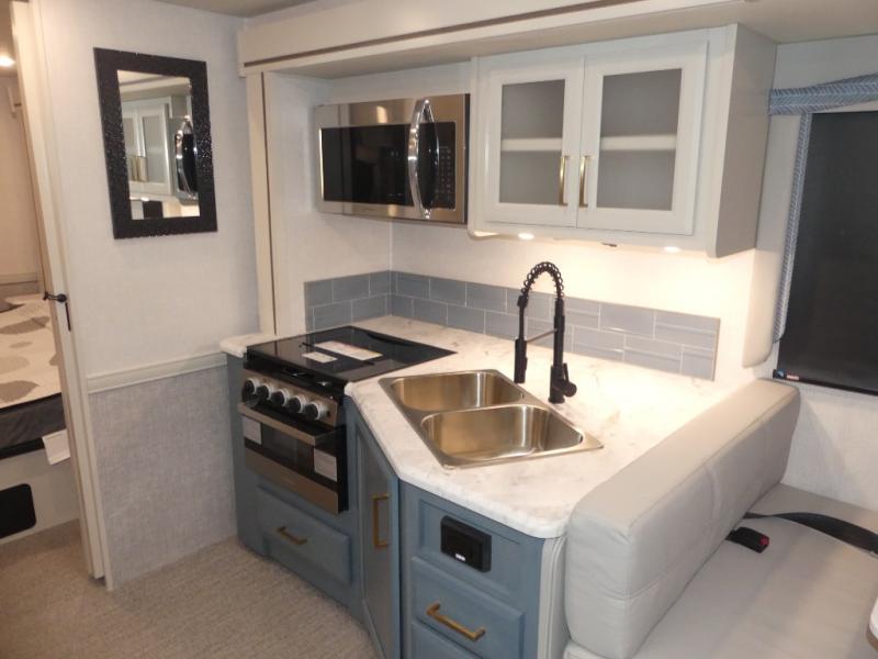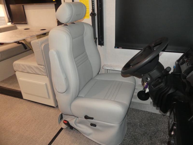 If you're hoping for a luxurious getaway, look no further than this Flair Class A gas motorhome! You can sleep in peace in your own private bedroom, and the full bathroom with shower skylight is directly connected to the bedroom for easy morning routines. Next to the residential refrigerator is a pantry, so you have great kitchen storage, and you also have a three-burner range to cook those foods on. A jackknife sofa gives you lounging and sleeping space, and you have a Wi-Fi Ranger Sky4 to keep connected to the modern world.