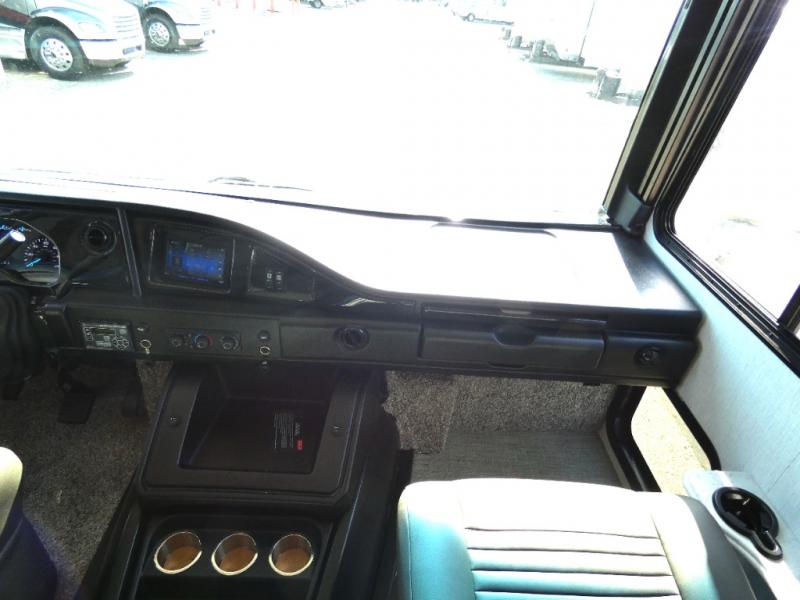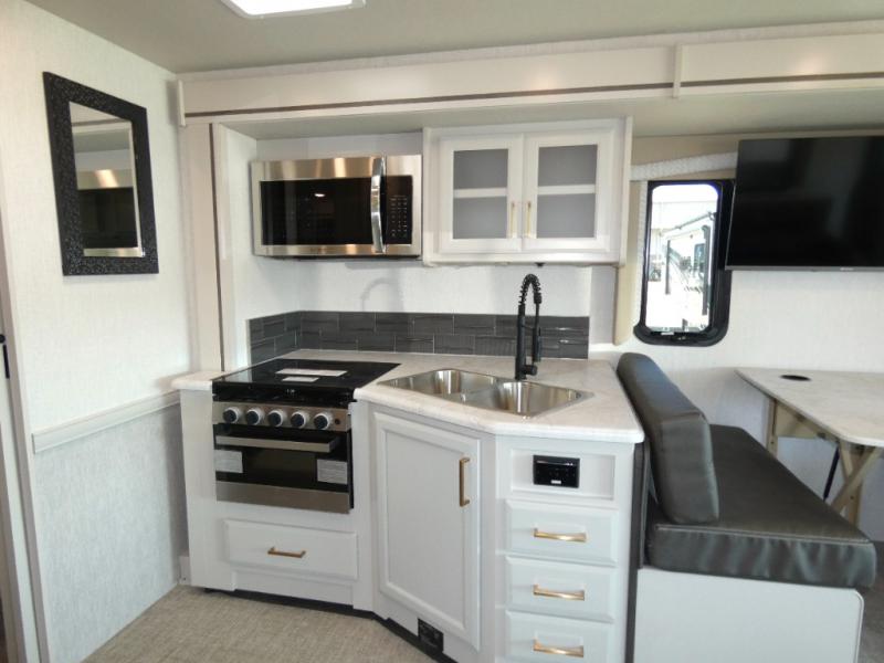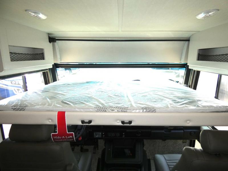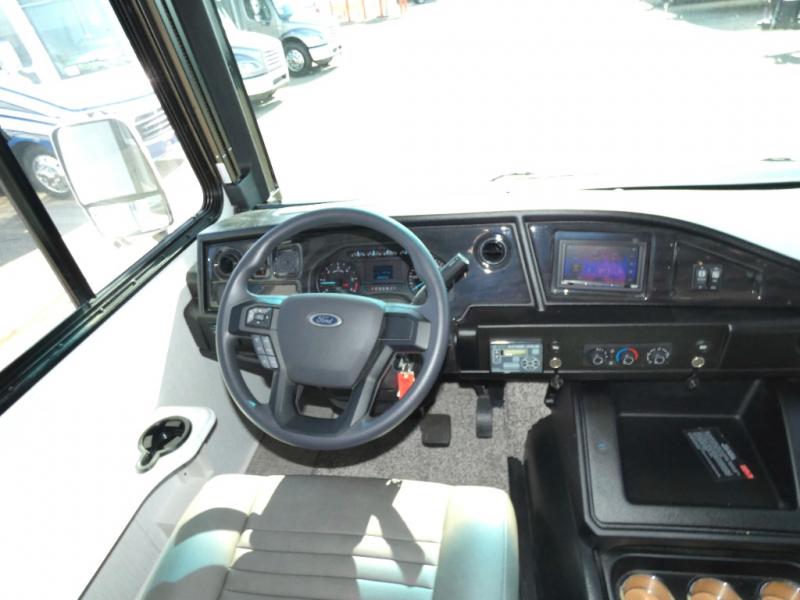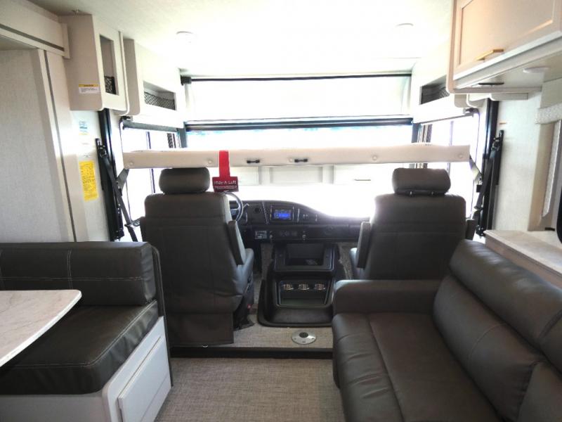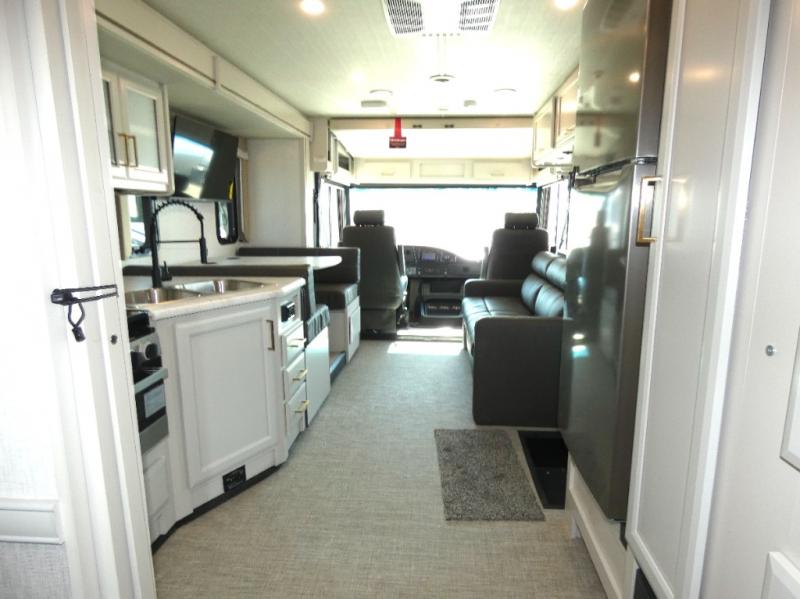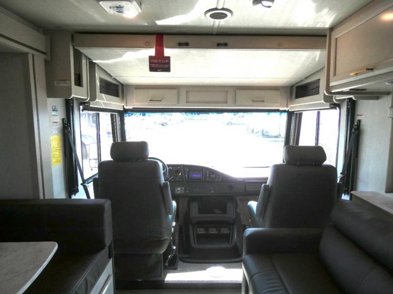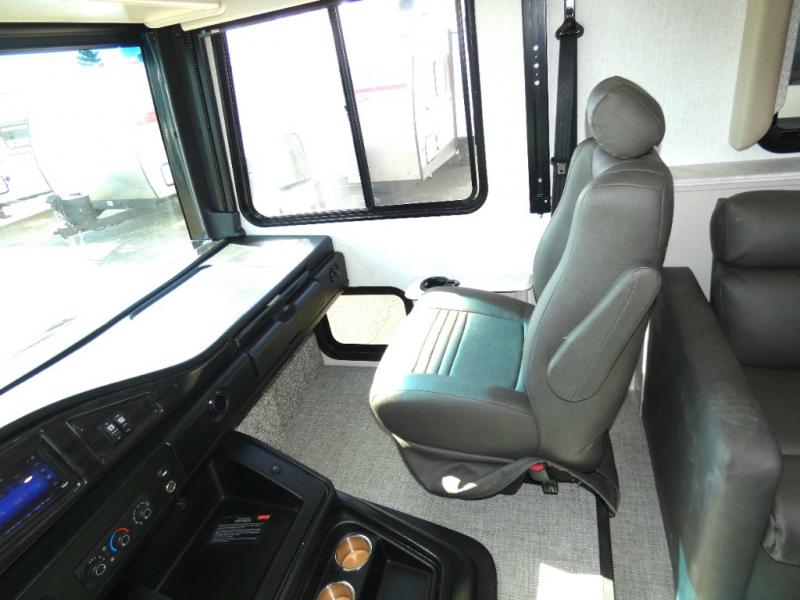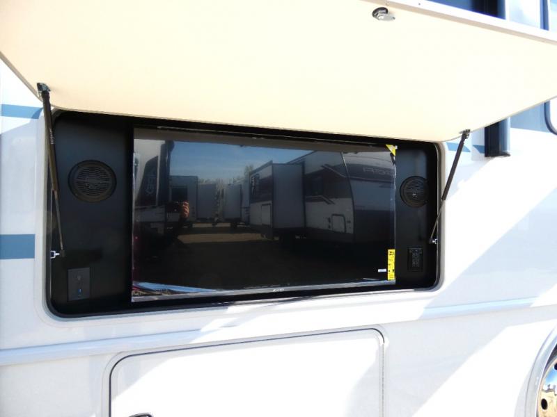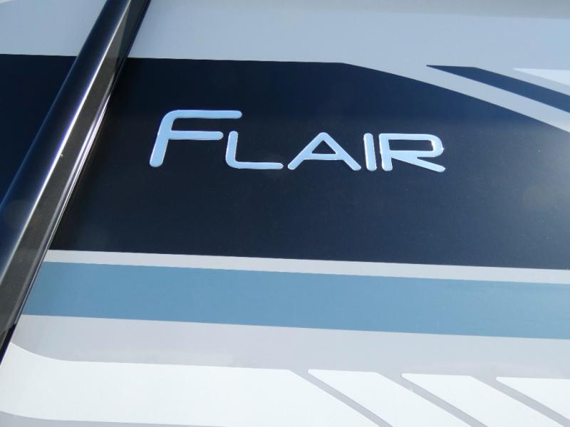 Step up your camping game by adding the Fleetwood Flair Class A gas motorhome to the line-up! The 7.3L 335HP engine with 468 LB/FT of torque forms the base, and the 8,000-LB towing capacity gives you the chance to bring a car with your coach. On the exterior you'll find an automotive, bonded one-piece windshield, exterior-mounted sideview cameras, and an exterior LED TV. The interior is decked out with a dash radio, an electronic instrument panel, and reclining/swivel cab chairs. There is also a workstation at the automotive-style dash, and the Bluetooth coach system in the bedroom has exterior speakers for fun party nights.