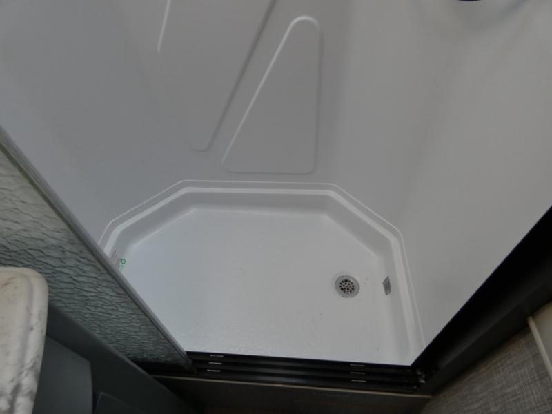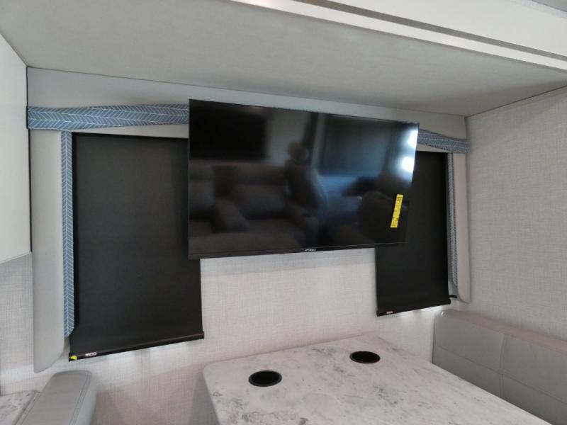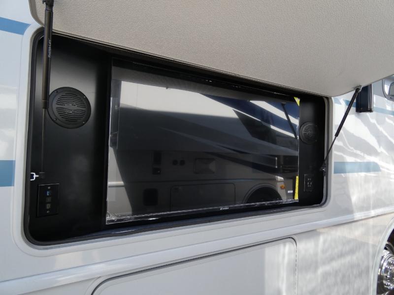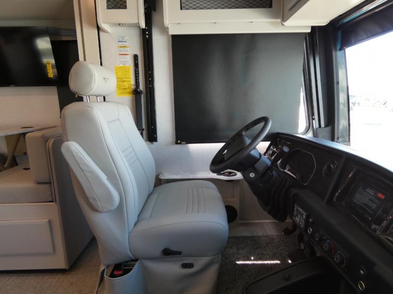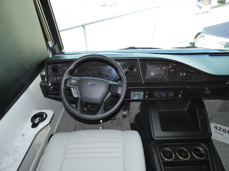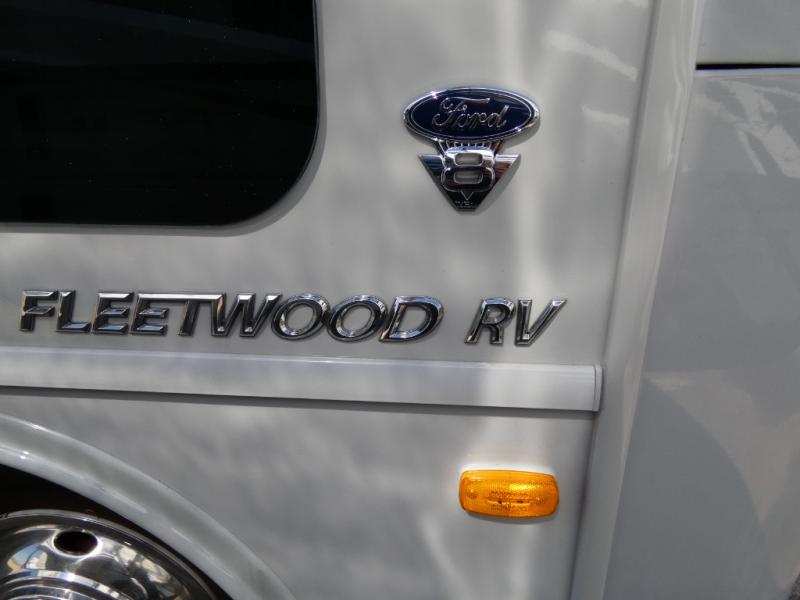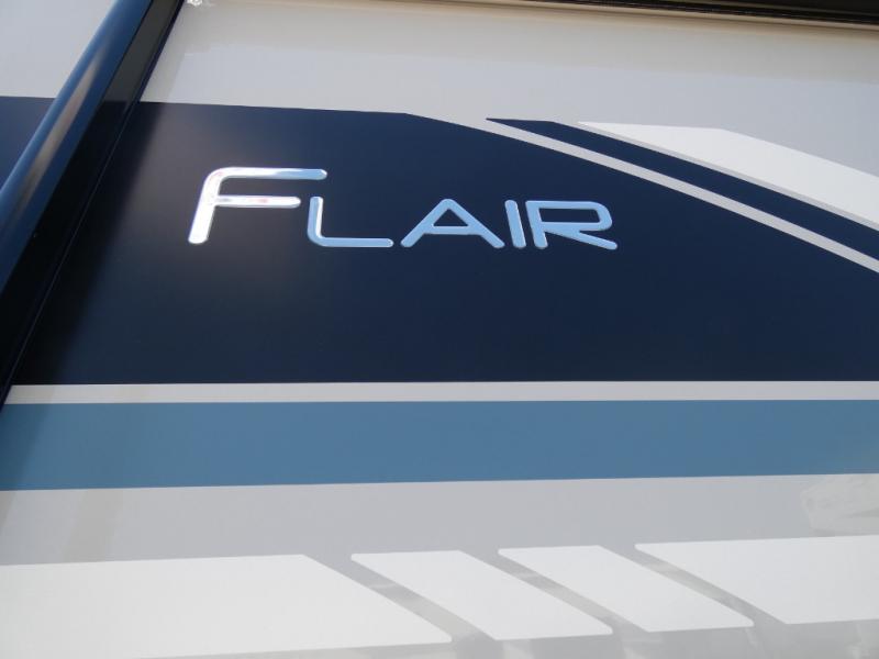 Step up your camping game by adding the Fleetwood Flair Class A gas motorhome to the line-up! The 7.3L 335HP engine with 468 LB/FT of torque forms the base, and the 8,000-LB towing capacity gives you the chance to bring a car with your coach. On the exterior you'll find an automotive, bonded one-piece windshield, exterior-mounted sideview cameras, and an exterior LED TV. The interior is decked out with a dash radio, an electronic instrument panel, and reclining/swivel cab chairs. There is also a workstation at the automotive-style dash, and the Bluetooth coach system in the bedroom has exterior speakers for fun party nights.