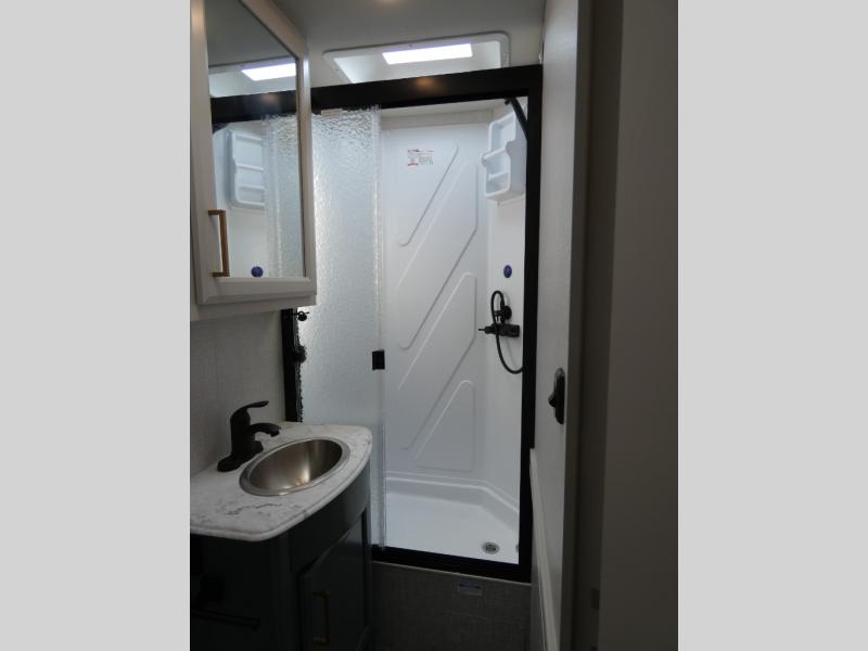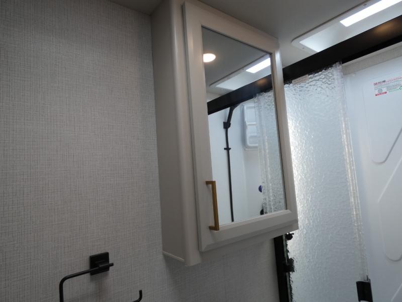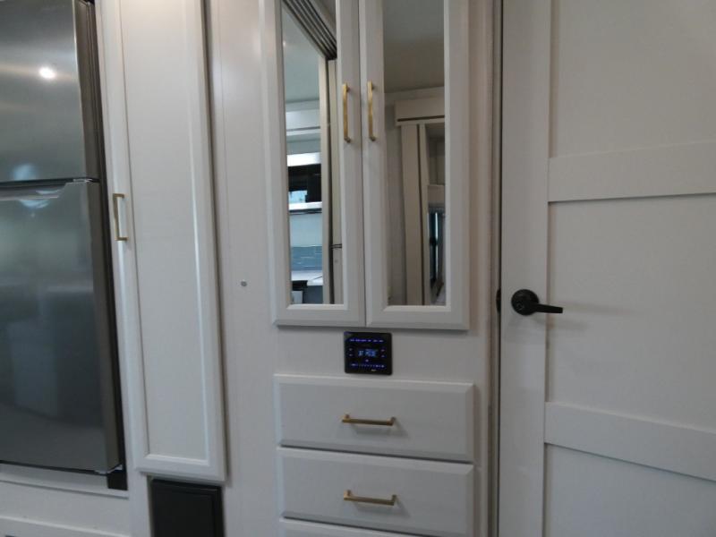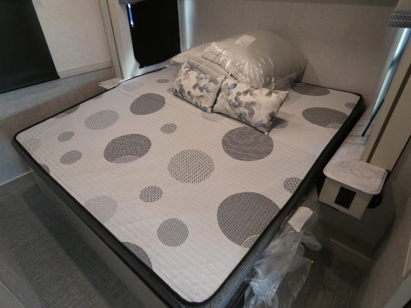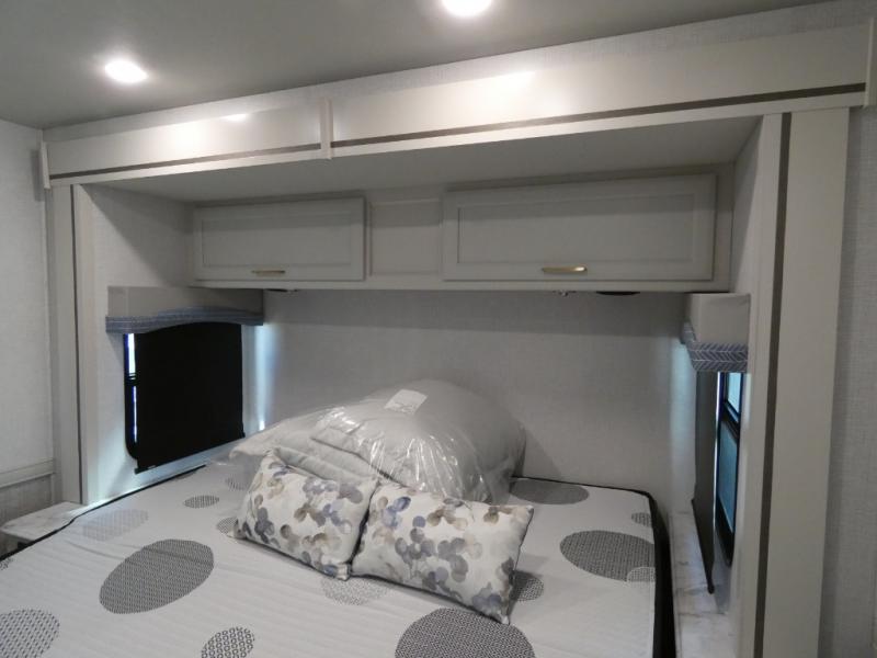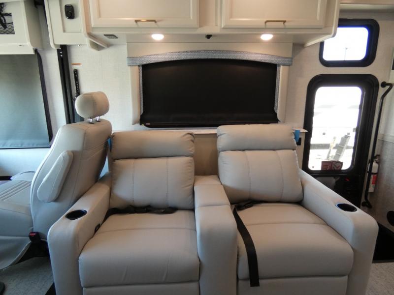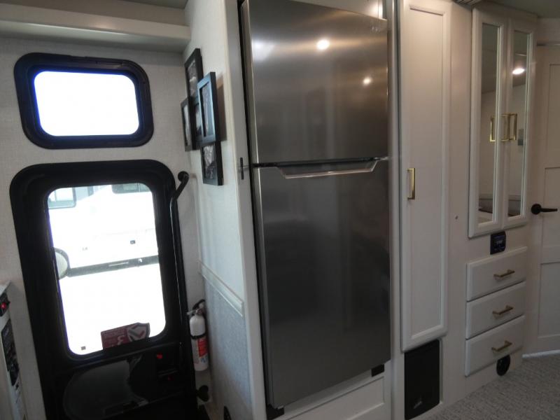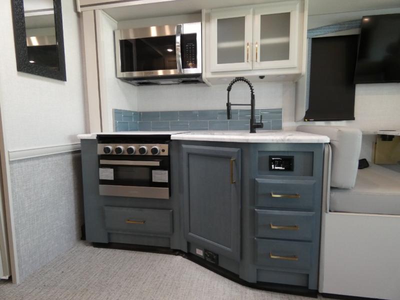 If you're hoping for a luxurious getaway, look no further than this Flair Class A gas motorhome! You can sleep in peace in your own private bedroom, and the full bathroom with shower skylight is directly connected to the bedroom for easy morning routines. Next to the residential refrigerator is a pantry, so you have great kitchen storage, and you also have a three-burner range to cook those foods on. Theater seating gives you lounging space, and you have a Wi-Fi Ranger Sky4 to keep connected to the modern world.