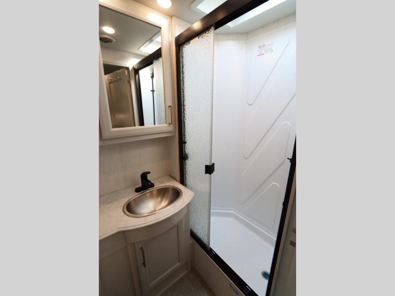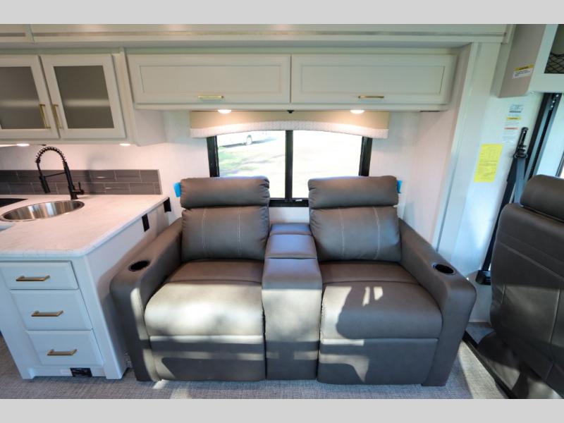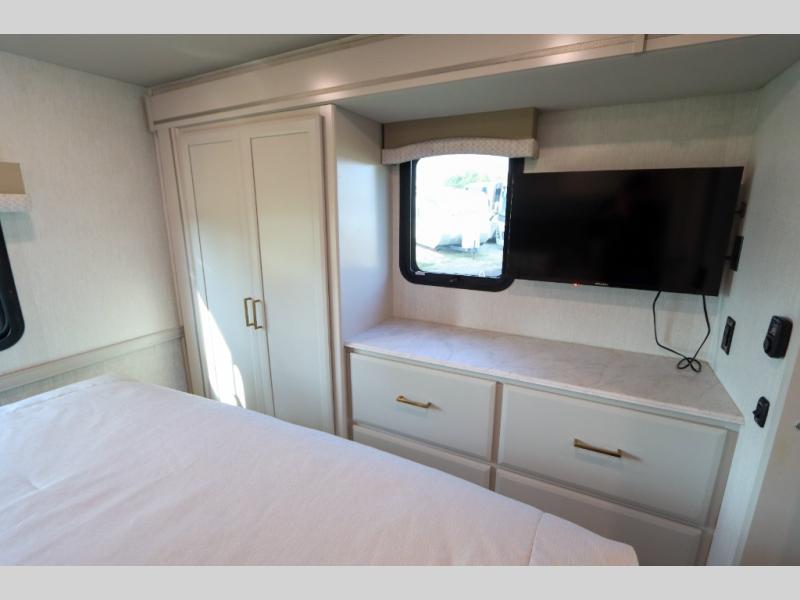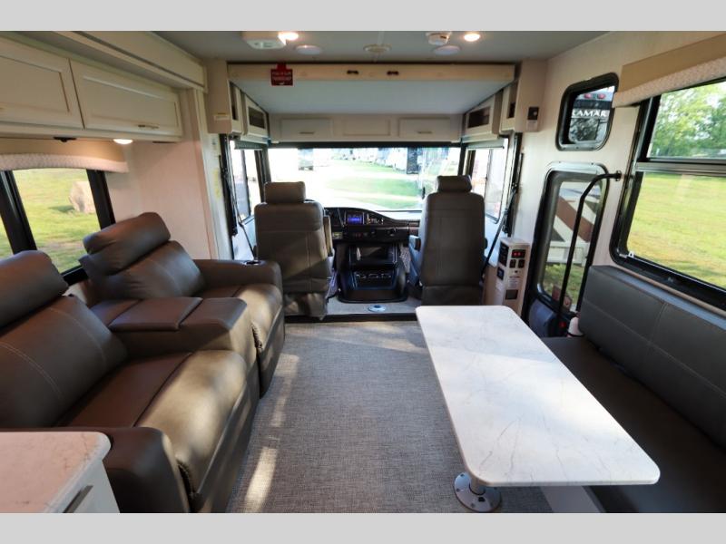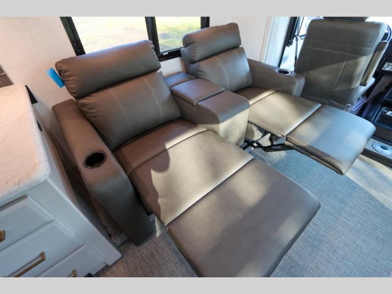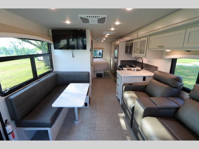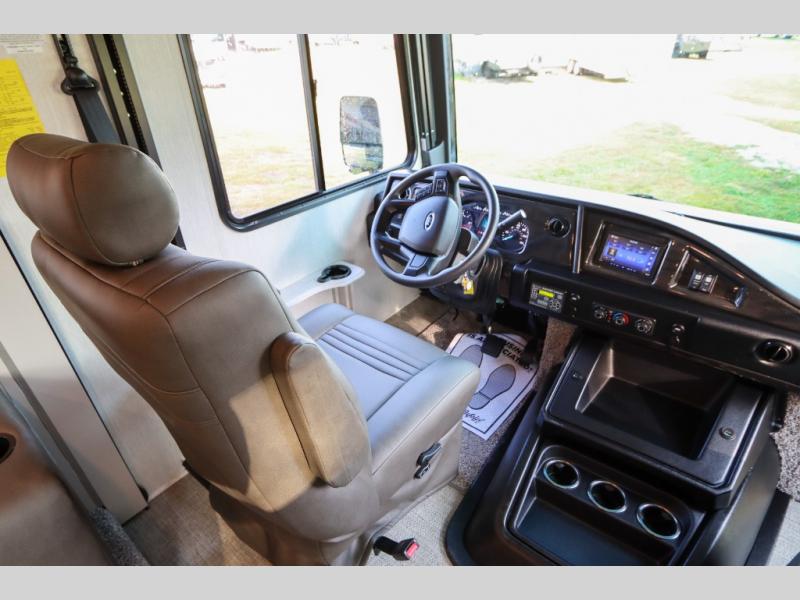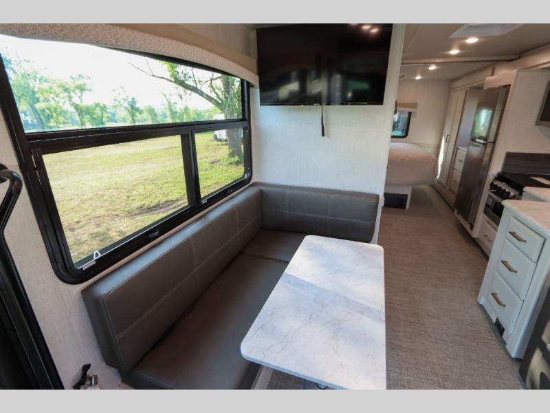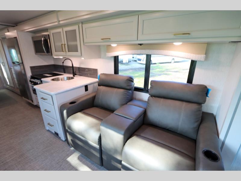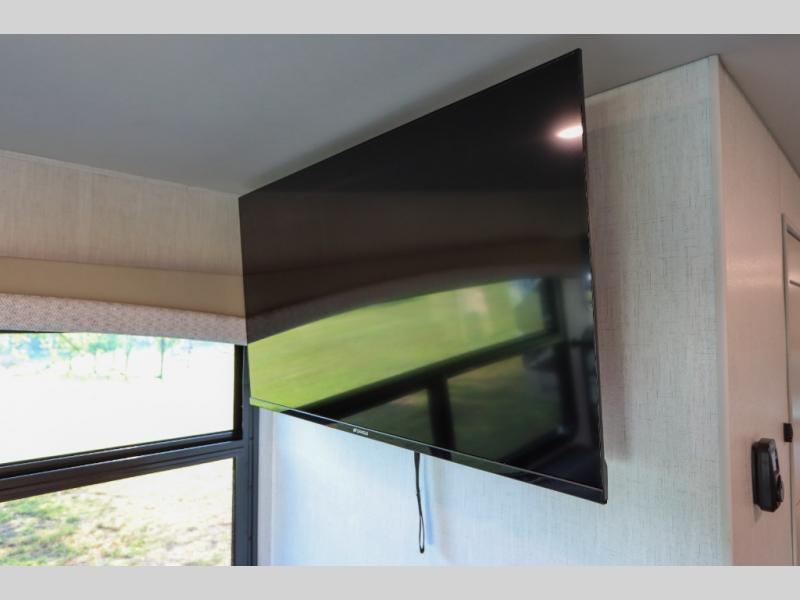 This Flair Class A gas motorhome is worth the investment! There is so much luxury and convenience included on this coach, like the Serenity Series RV king bed in the private bedroom, the residential refrigerator in the fully stocked kitchen, the Hide-A-Loft drop-down bunk above the cab, and the three LED TVs. You'll have a full bathroom with shower skylight so that you can keep clean while you're out adventuring, and the L-shaped dinette and jackknife sofa will both provide lounging and sleeping space. You can even turn the cab seats around to use the driver/passenger pedestal table as another lounge spot.