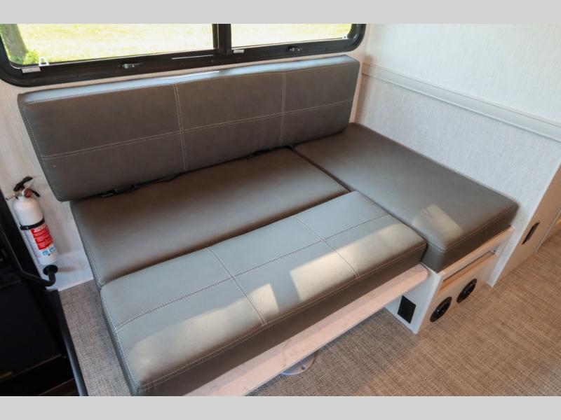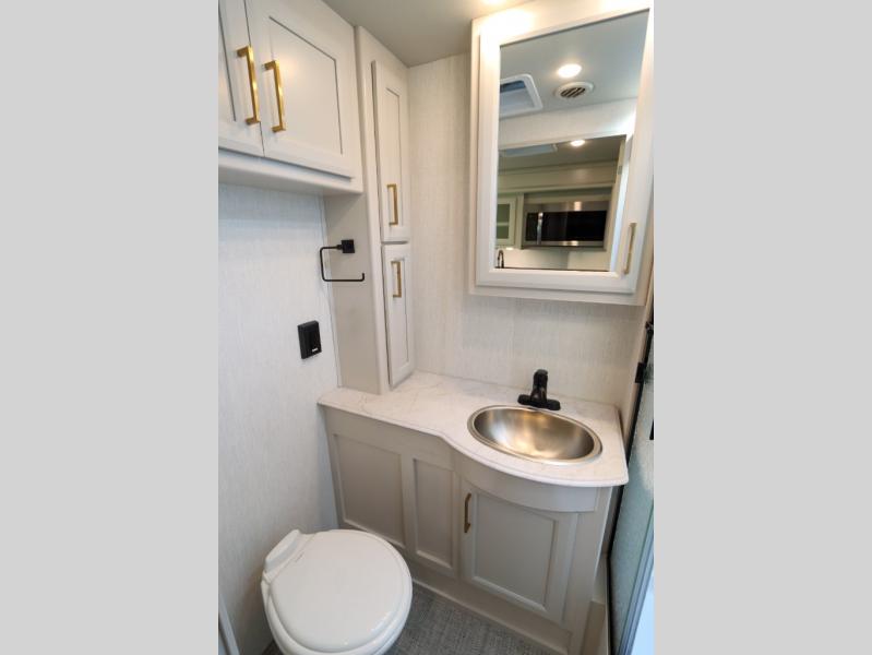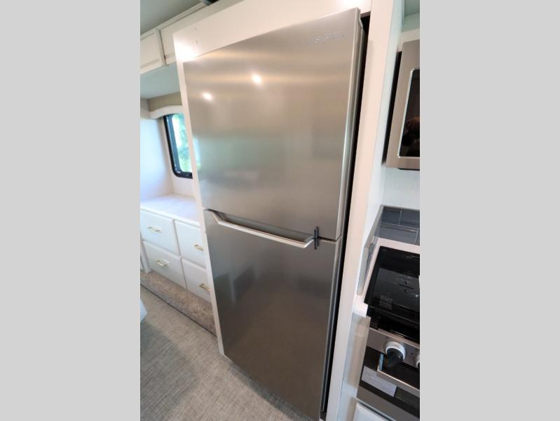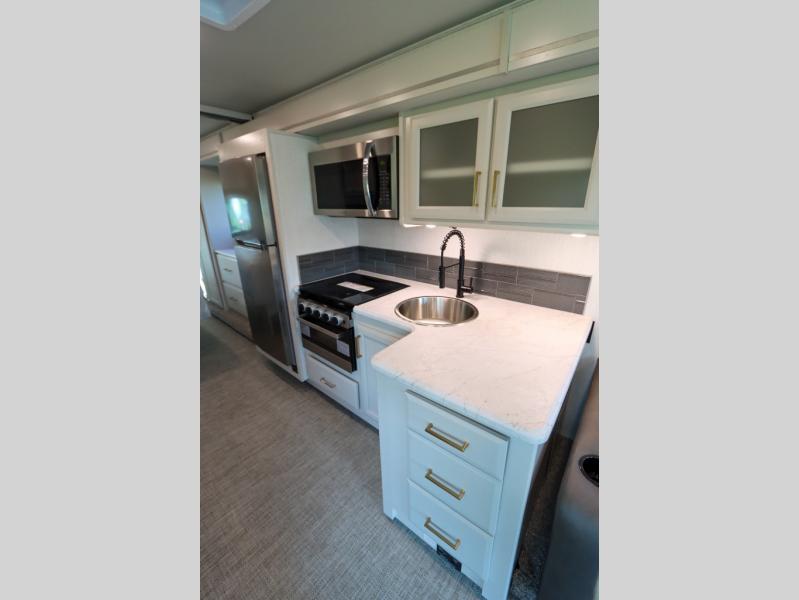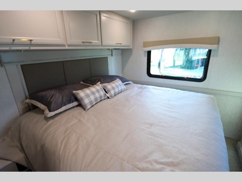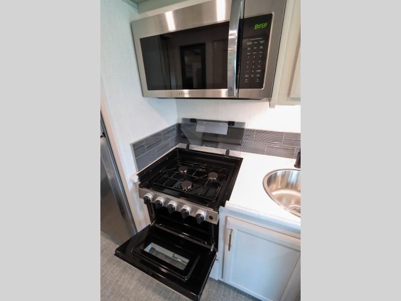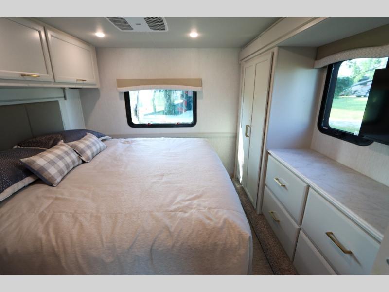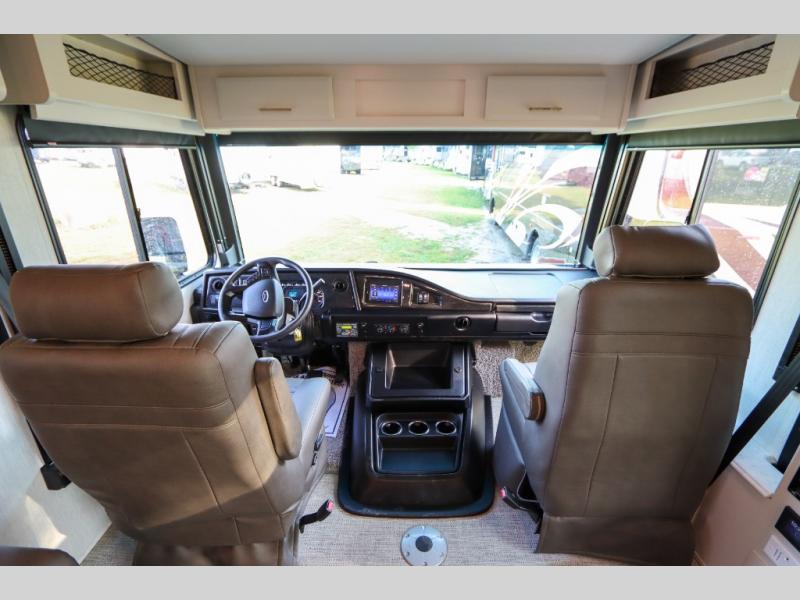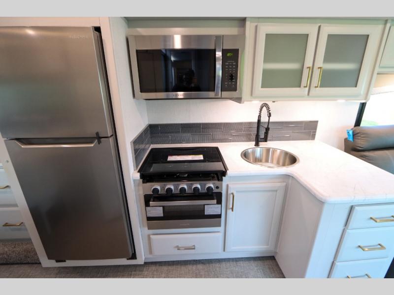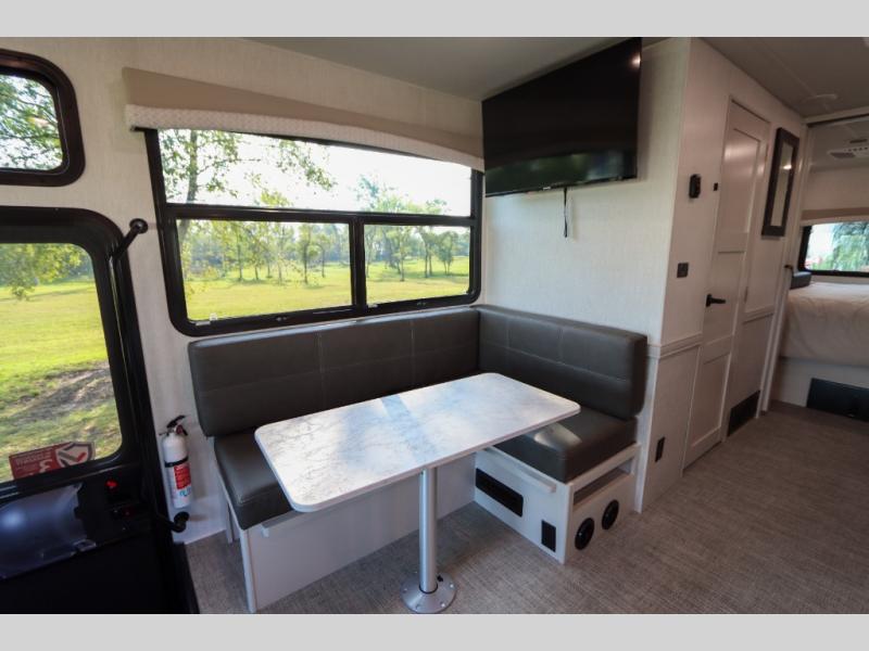 This Flair Class A gas motorhome is worth the investment! There is so much luxury and convenience included on this coach, like the Serenity Series RV king bed in the private bedroom, the residential refrigerator in the fully stocked kitchen, the Hide-A-Loft drop-down bunk above the cab, and the three LED TVs. You'll have a full bathroom with shower skylight so that you can keep clean while you're out adventuring, and the L-shaped dinette and jackknife sofa will both provide lounging and sleeping space. You can even turn the cab seats around to use the driver/passenger pedestal table as another lounge spot.