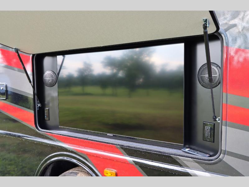 Step up your camping game by adding the Fleetwood Flair Class A gas motorhome to the line-up! The 7.3L 335HP engine with 468 LB/FT of torque forms the base, and the 8,000-LB towing capacity gives you the chance to bring a car with your coach. On the exterior you'll find an automotive, bonded one-piece windshield, exterior-mounted sideview cameras, and an exterior LED TV. The interior is decked out with a dash radio, an electronic instrument panel, and reclining/swivel cab chairs. There is also a workstation at the automotive-style dash, and the Bluetooth coach system in the bedroom has exterior speakers for fun party nights.