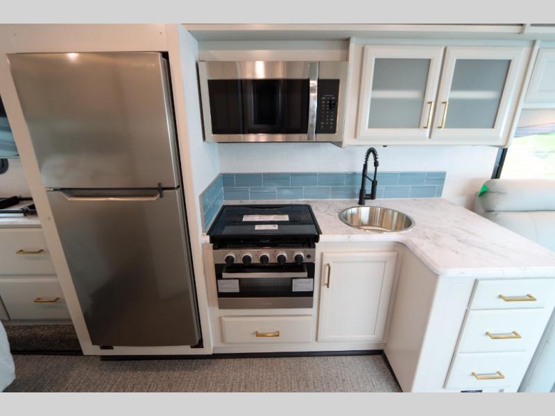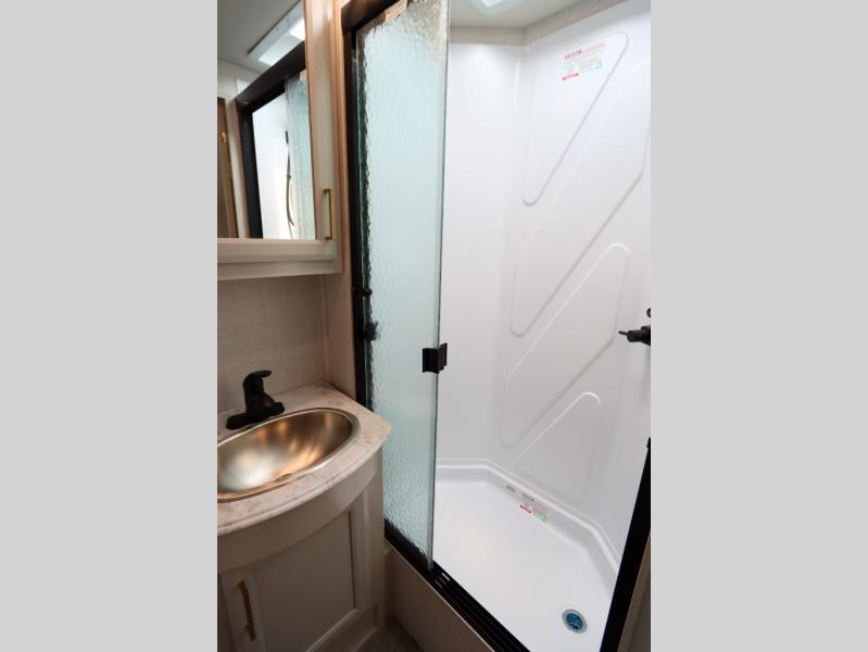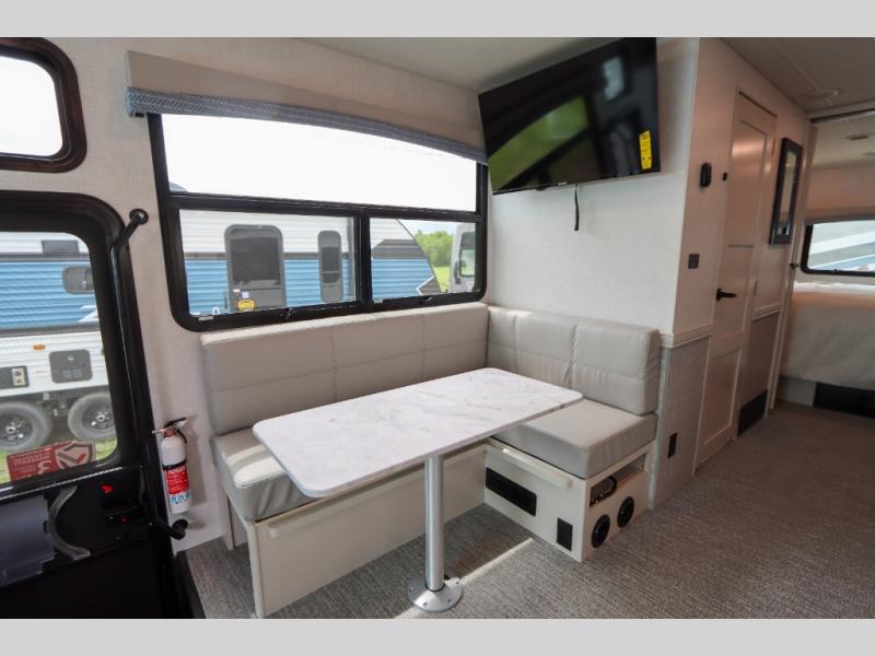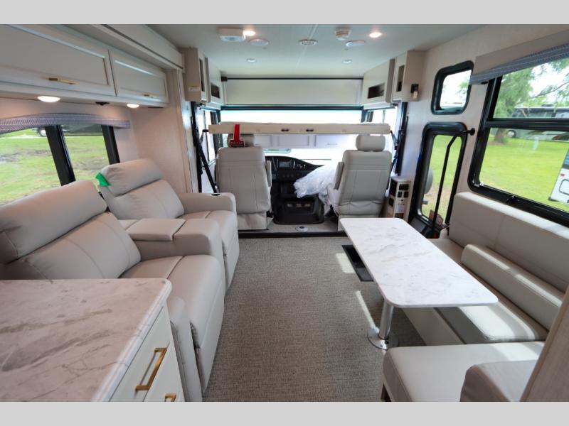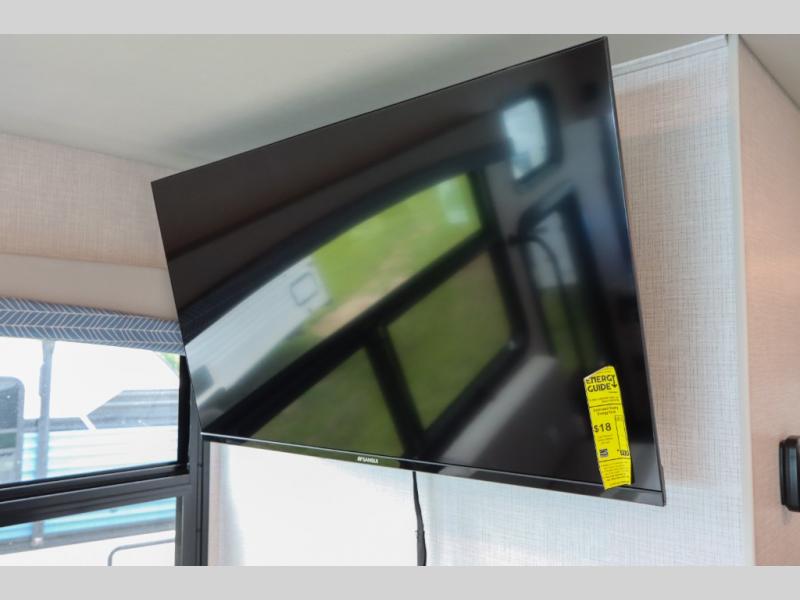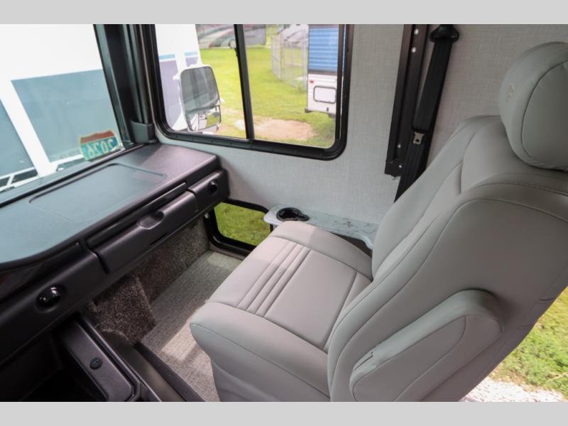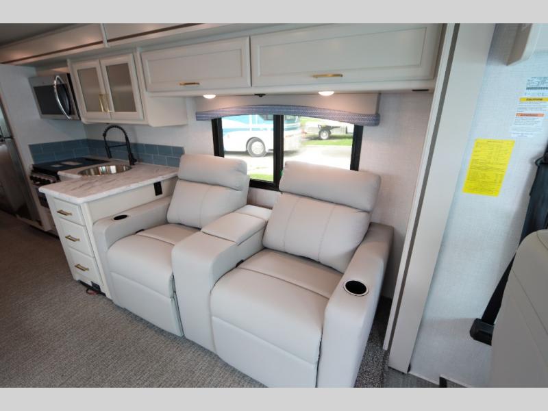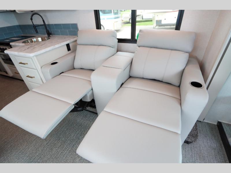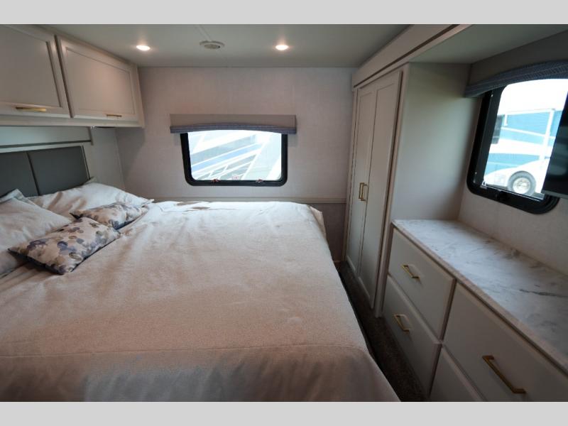This Flair Class A gas motorhome is worth the investment! There is so much luxury and convenience included on this coach, like the Serenity Series RV king bed in the private bedroom, the residential refrigerator in the fully stocked kitchen, the Hide-A-Loft drop-down bunk above the cab, and the three LED TVs. You'll have a full bathroom with shower skylight so that you can keep clean while you're out adventuring, and the L-shaped dinette and jackknife sofa will both provide lounging and sleeping space. You can even turn the cab seats around to use the driver/passenger pedestal table as another lounge spot.