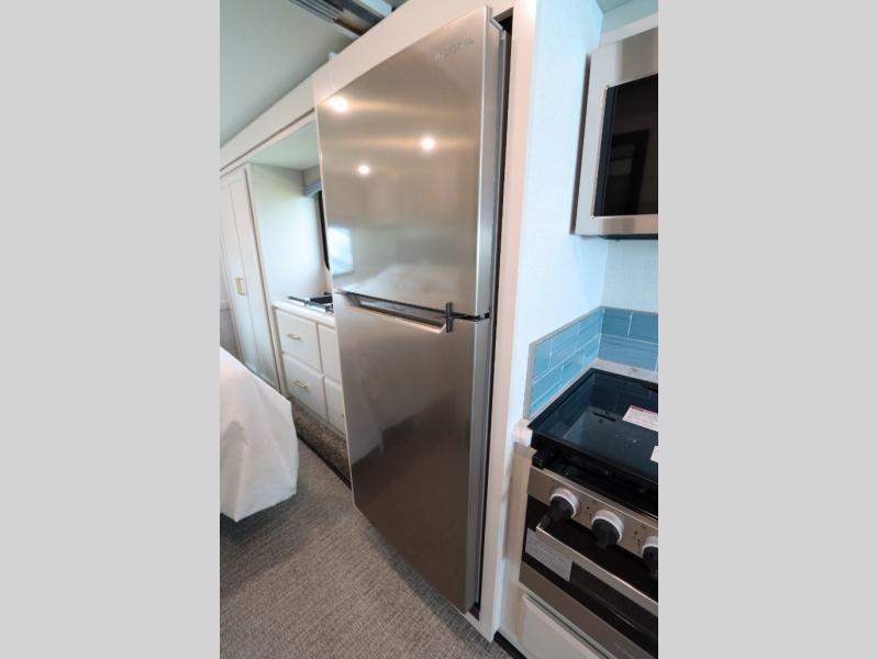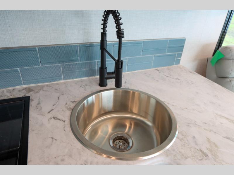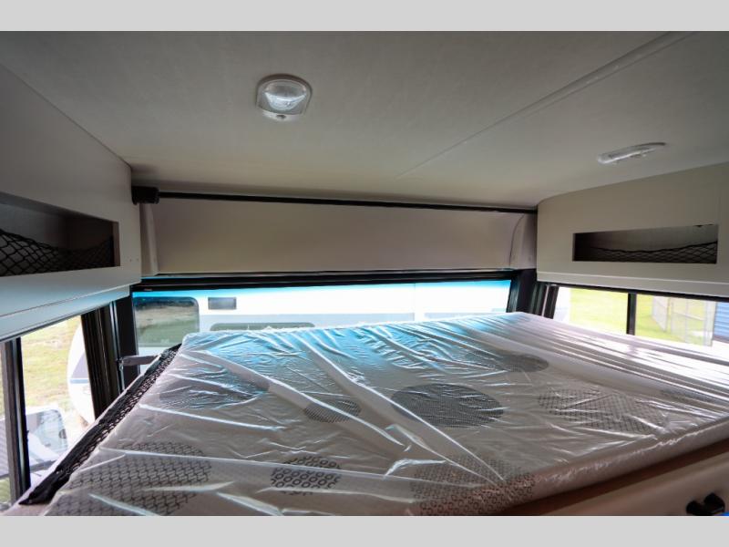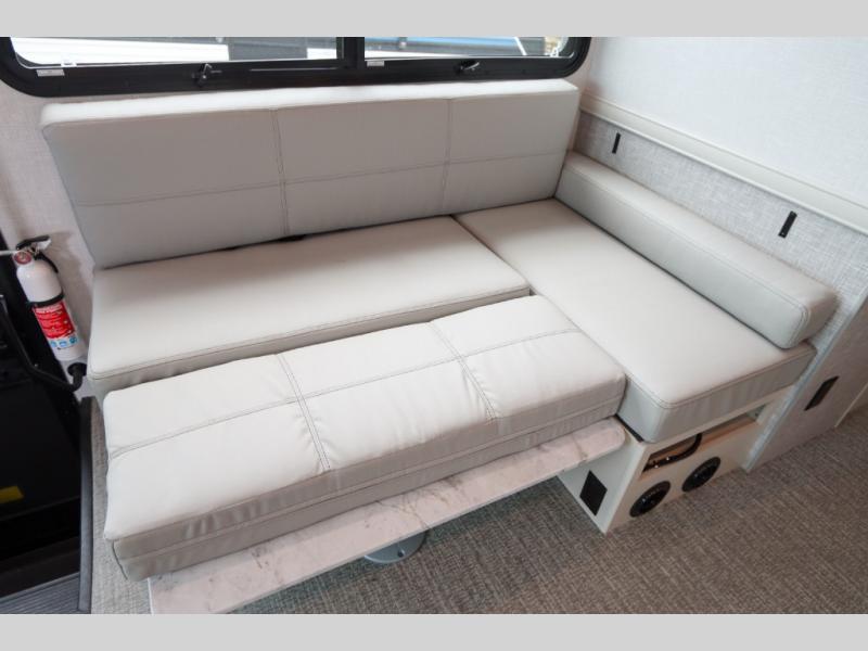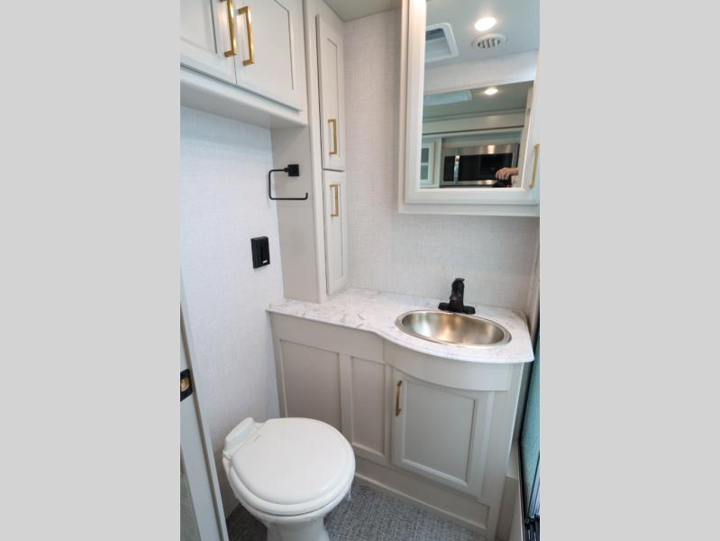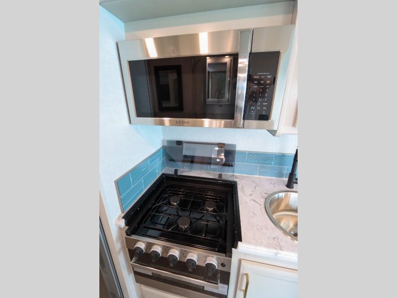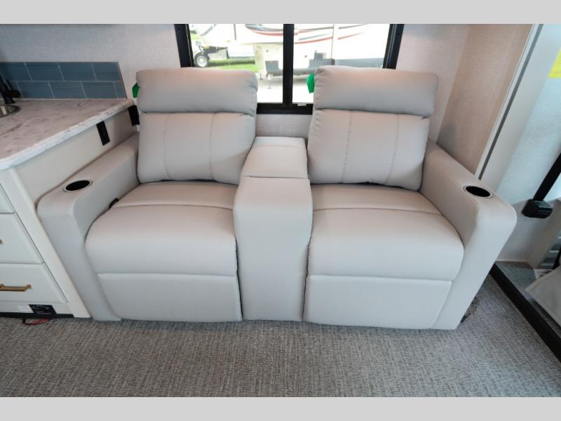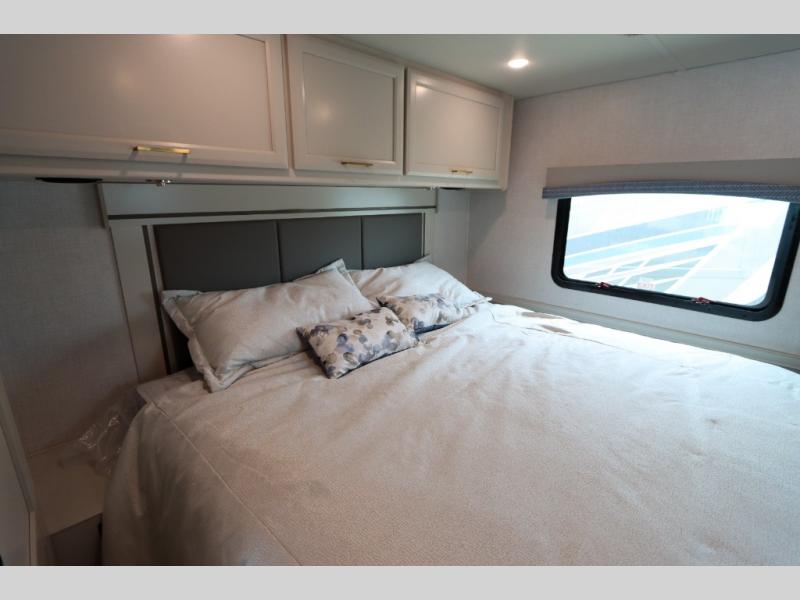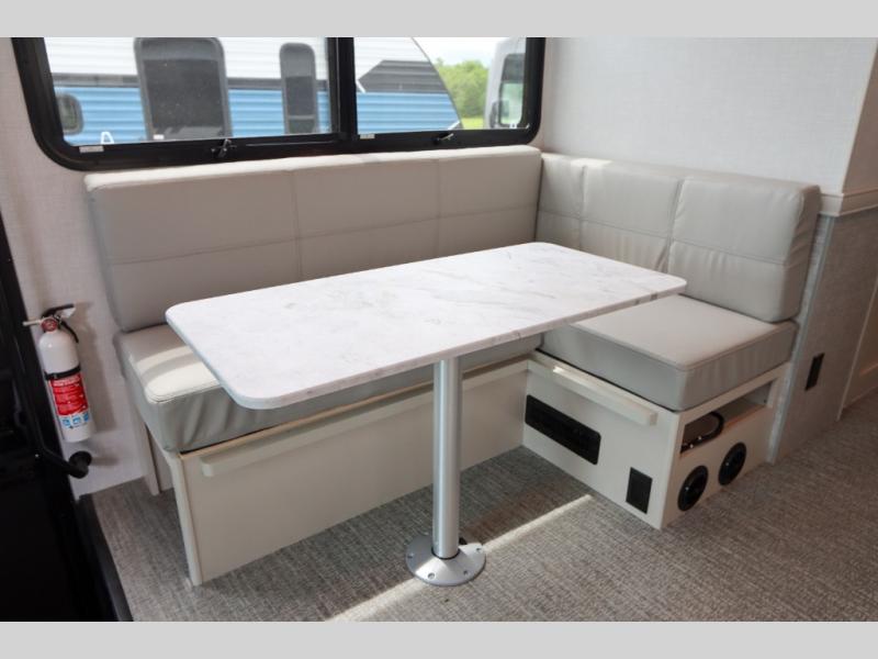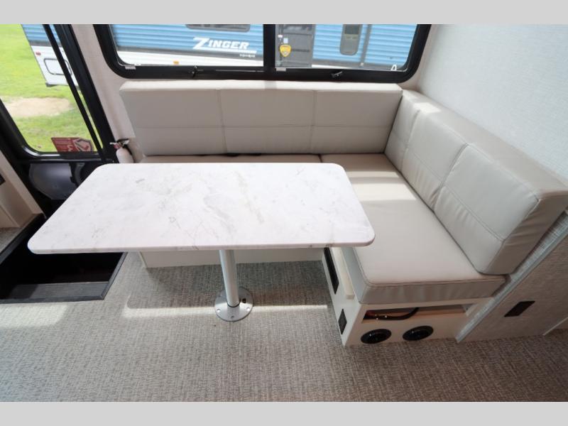 This Flair Class A gas motorhome is worth the investment! There is so much luxury and convenience included on this coach, like the Serenity Series RV king bed in the private bedroom, the residential refrigerator in the fully stocked kitchen, the Hide-A-Loft drop-down bunk above the cab, and the three LED TVs. You'll have a full bathroom with shower skylight so that you can keep clean while you're out adventuring, and the L-shaped dinette and jackknife sofa will both provide lounging and sleeping space. You can even turn the cab seats around to use the driver/passenger pedestal table as another lounge spot.