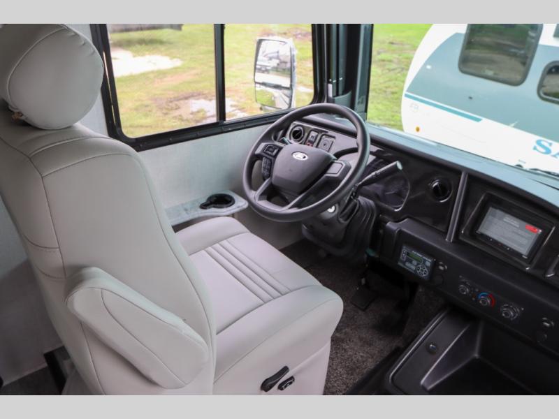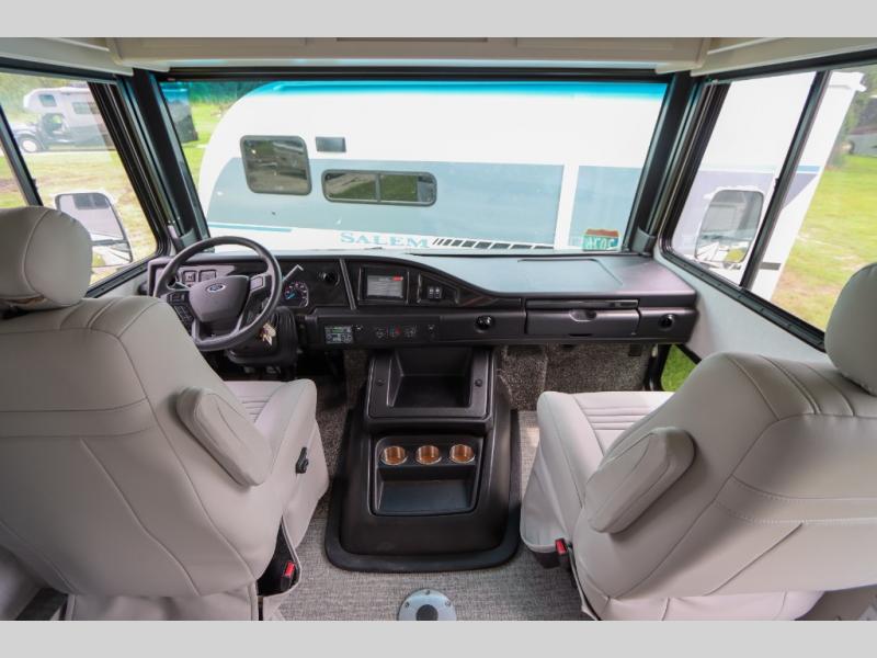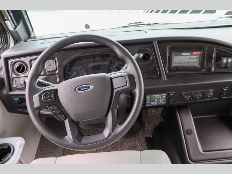 Step up your camping game by adding the Fleetwood Flair Class A gas motorhome to the line-up! The 7.3L 335HP engine with 468 LB/FT of torque forms the base, and the 8,000-LB towing capacity gives you the chance to bring a car with your coach. On the exterior you'll find an automotive, bonded one-piece windshield, exterior-mounted sideview cameras, and an exterior LED TV. The interior is decked out with a dash radio, an electronic instrument panel, and reclining/swivel cab chairs. There is also a workstation at the automotive-style dash, and the Bluetooth coach system in the bedroom has exterior speakers for fun party nights.