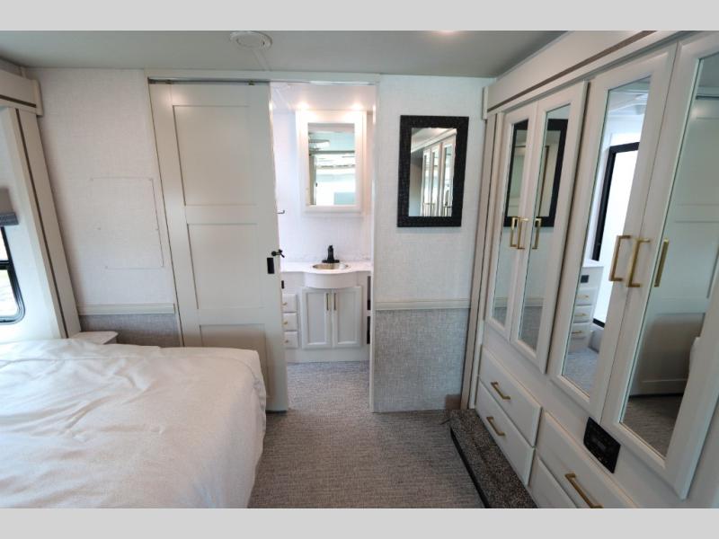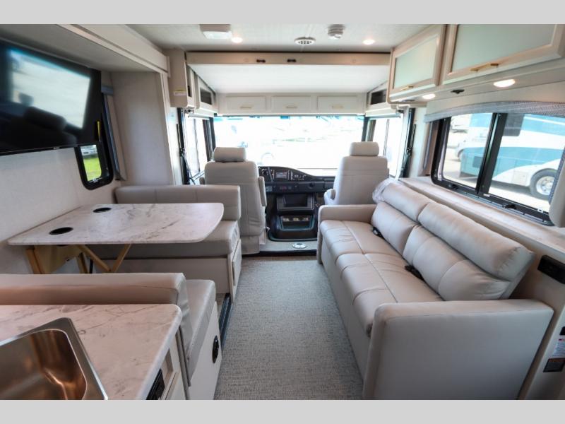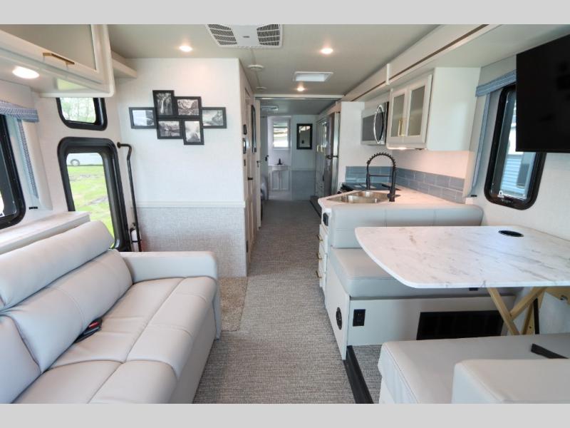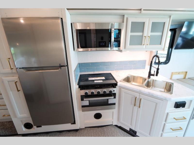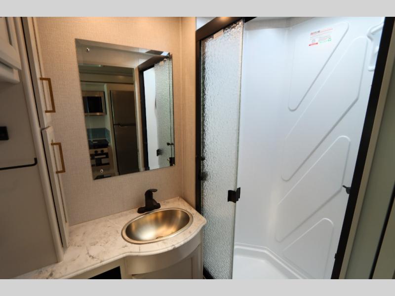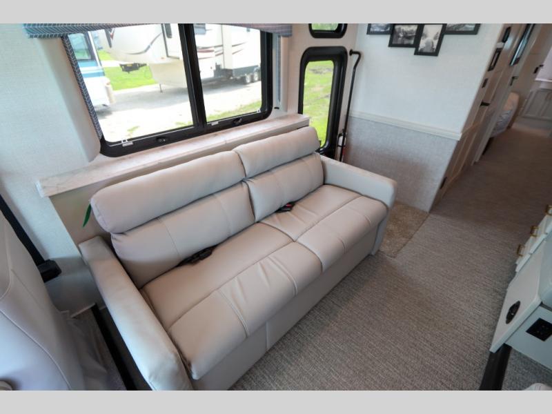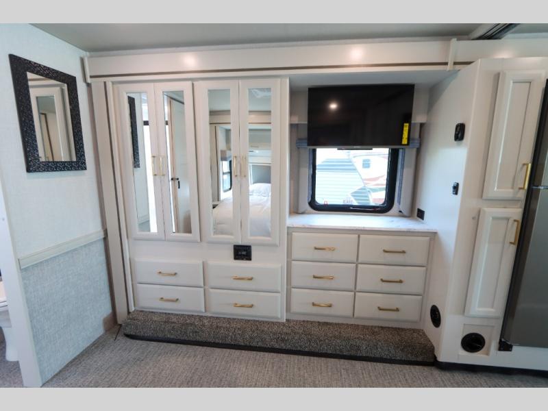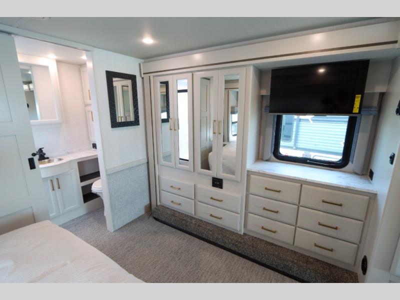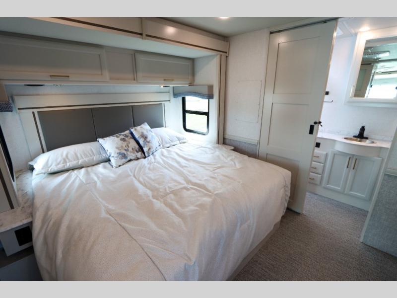 Experience your best vacations in this Flair Class A gas motorhome! The full rear bathroom has a 30" x 36" shower to start your mornings off feeling fresh. Now that you're nice and clean, you can get ready in the master suite with your clothes hanging in the wardrobe and stored in the dresser with an LED TV above it, plus there is a Serenity Series 72" x 74" king bed slide so you know you will get a good night's rest. The chef will have an easy time preparing home cooked meals with the three burner cooktop and residential refrigerator which can be switched out for an optional LP-RV style refrigerator. The half bathroom is conveniently next to the kitchen for quick bathroom breaks while cooking and has a wardrobe/storage and a linen closet with exterior storage below it. Relax each evening either indoors on the jackknife sofa and Dream Dinette or in front of the exterior LED TV!