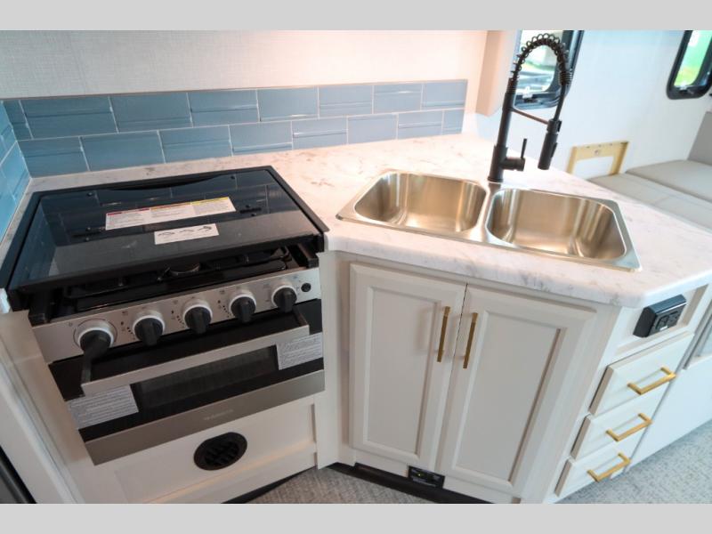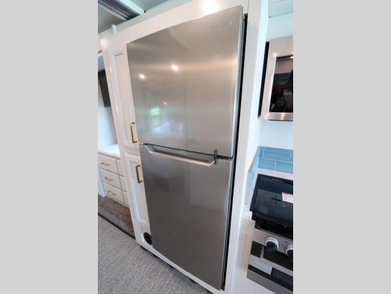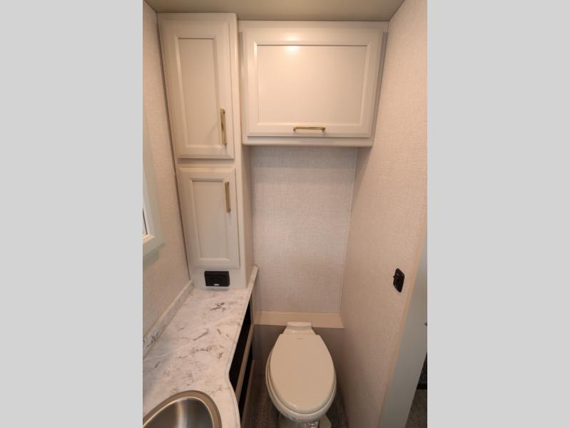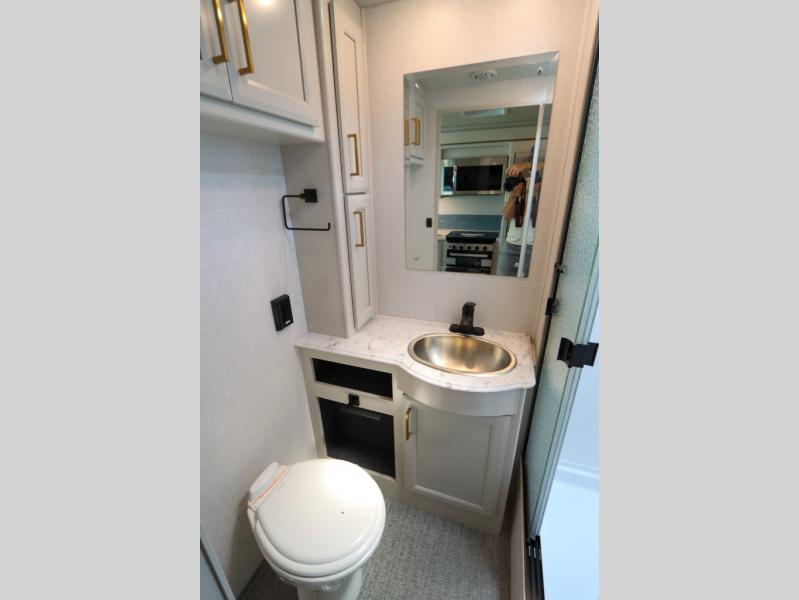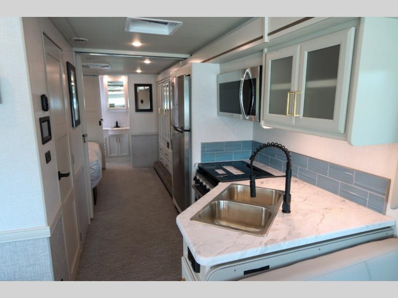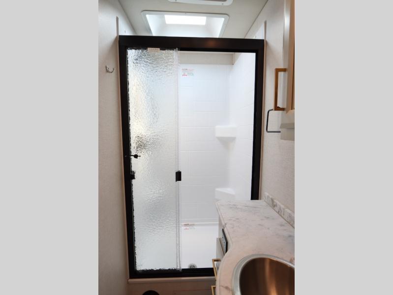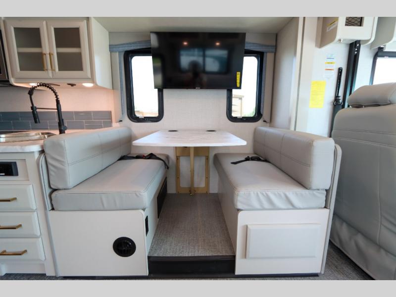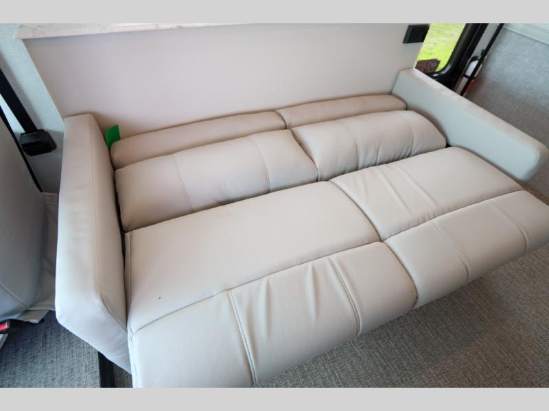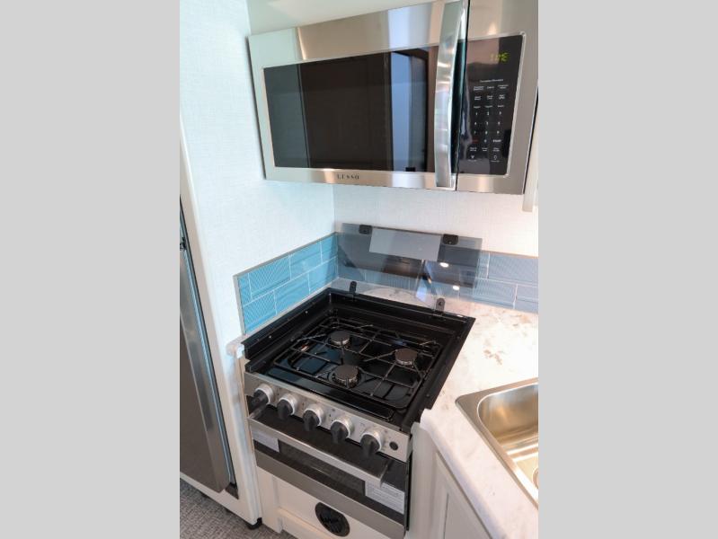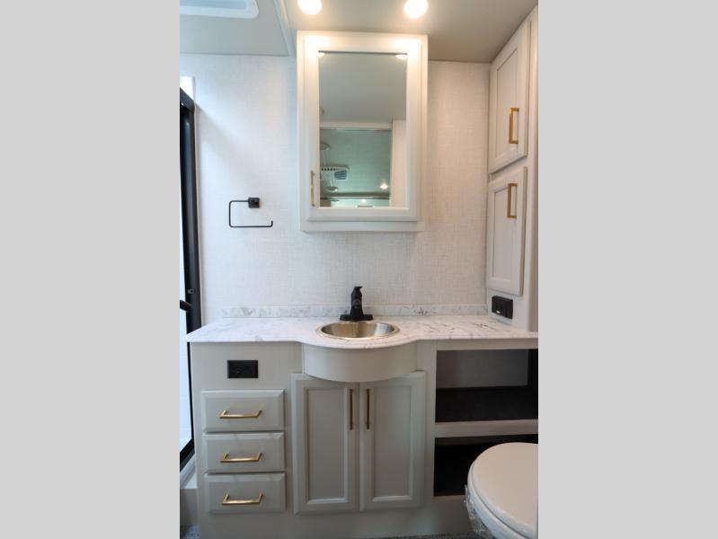 Experience your best vacations in this Flair Class A gas motorhome! The full rear bathroom has a 30" x 36" shower to start your mornings off feeling fresh. Now that you're nice and clean, you can get ready in the master suite with your clothes hanging in the wardrobe and stored in the dresser with an LED TV above it, plus there is a Serenity Series 72" x 74" king bed slide so you know you will get a good night's rest. The chef will have an easy time preparing home cooked meals with the three burner cooktop and residential refrigerator which can be switched out for an optional LP-RV style refrigerator. The half bathroom is conveniently next to the kitchen for quick bathroom breaks while cooking and has a wardrobe/storage and a linen closet with exterior storage below it. Relax each evening either indoors on the jackknife sofa and Dream Dinette or in front of the exterior LED TV!