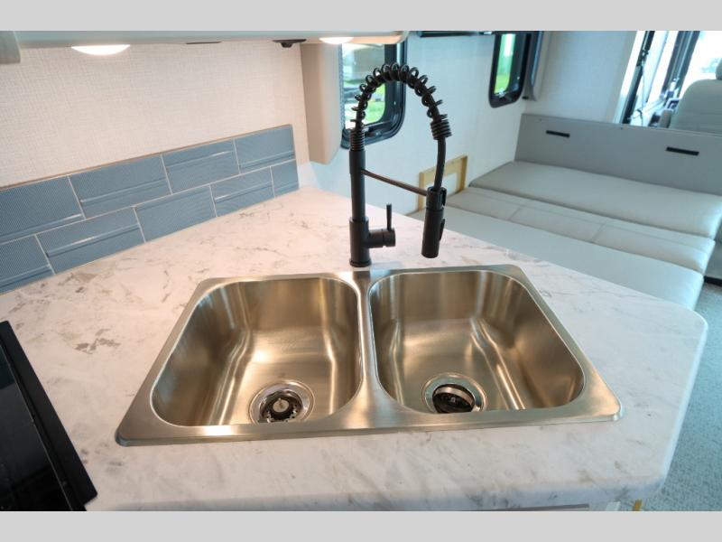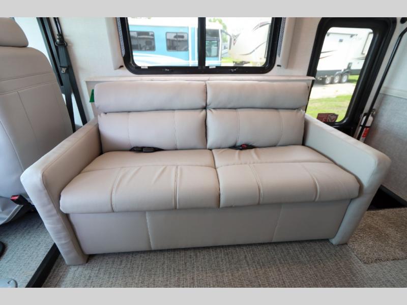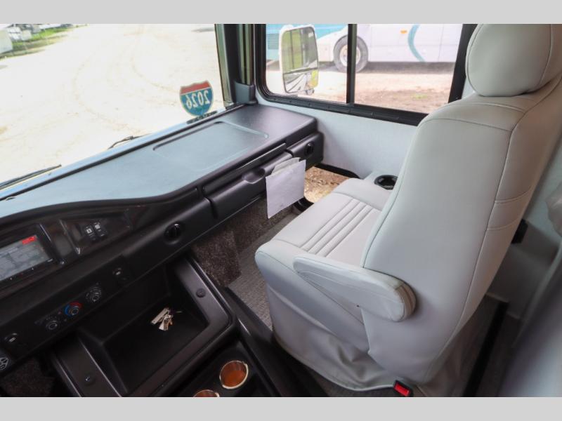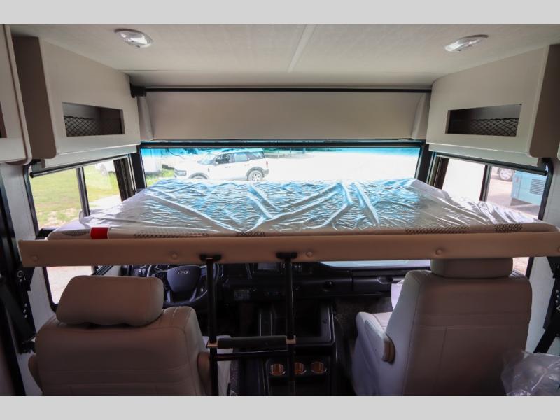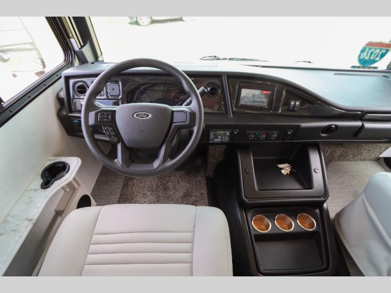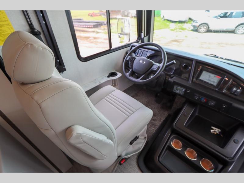 Step up your camping game by adding the Fleetwood Flair Class A gas motorhome to the line-up! The 7.3L 335HP engine with 468 LB/FT of torque forms the base, and the 8,000-LB towing capacity gives you the chance to bring a car with your coach. On the exterior you'll find an automotive, bonded one-piece windshield, exterior-mounted sideview cameras, and an exterior LED TV. The interior is decked out with a dash radio, an electronic instrument panel, and reclining/swivel cab chairs. There is also a workstation at the automotive-style dash, and the Bluetooth coach system in the bedroom has exterior speakers for fun party nights.