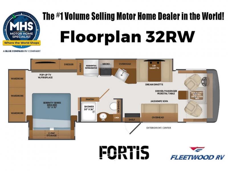 MSRP $240,218. 2026 Fleetwood Fortis 32RW is approximately 34 feet 6 inches in length and is built on the Power Platform chassis for a strong foundation, smooth ride, and incredible exterior storage. The 2026 Fortis abounds in new standard features which include water accumulation system, redesigned exterior entertainment center, reinforced exterior storage and much more. When you step inside, the lavish amenities continue with convenience in the form of a Hide-A-Loft™ drop down queen bed, decorative touches like a stainless steel farmhouse sink, Android Auto and Apple CarPlay with Navigation integrated with the large display and a LED smart TV. Options include the ford driver assist tech package, stackable washer/dryer, theater seating lounge, power driver seat, dual glazed windows, sumo springs, steering stabilizer system and collision mitigation. For additional details on this unit and our entire inventory including brochures, window sticker, videos, photos, reviews & testimonials as well as additional information about Motor Home Specialist and our manufacturers please visit us at MHSRV.com or call 800-335-6054. At Motor Home Specialist, we DO NOT charge any prep or orientation fees like you will find at other dealerships. All sale prices include a 200-point inspection, interior & exterior wash, detail service and a fully automated high-pressure rain booth test and coach wash that is a standout service unlike that of any other in the industry. You will also receive a thorough coach orientation with an MHSRV technician, a night stay in our delivery park featuring landscaped and covered pads with full hook-ups and much more! Read Thousands upon Thousands of 5-Star Reviews at MHSRV.com and See What They Had to Say About Their Experience at Motor Home Specialist. WHY PAY MORE? WHY SETTLE FOR LESS?