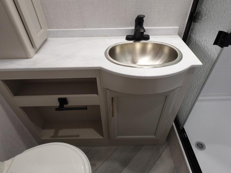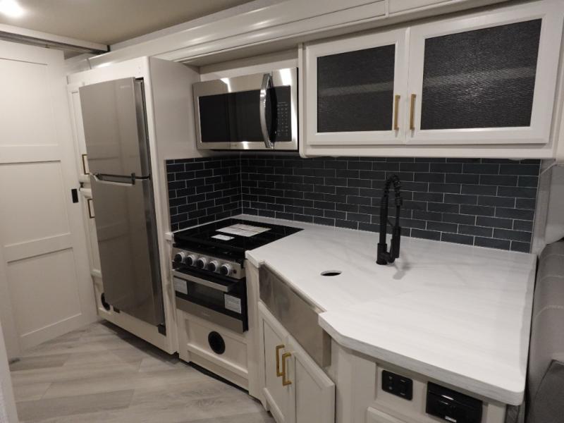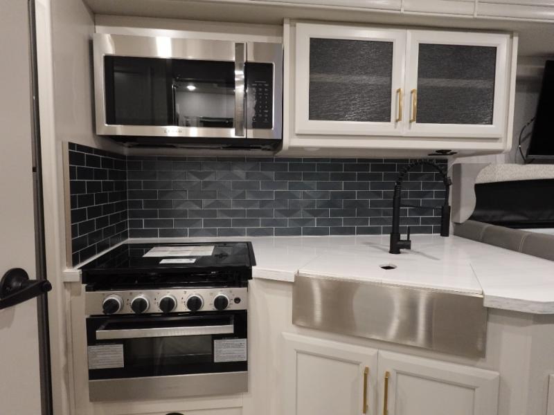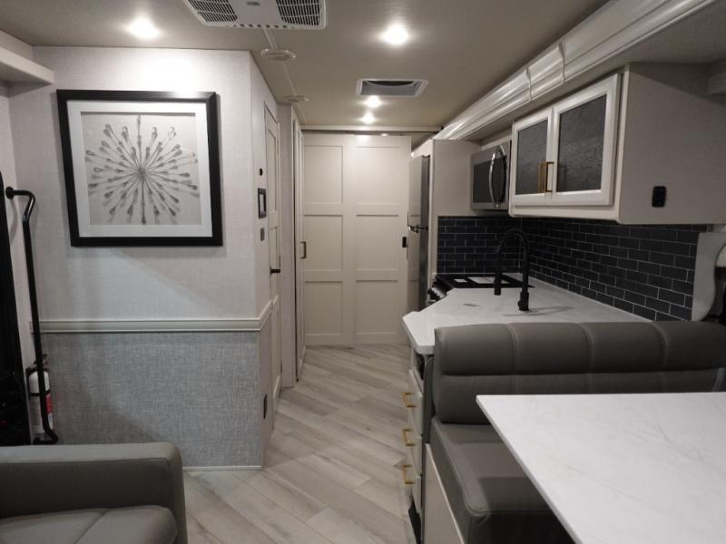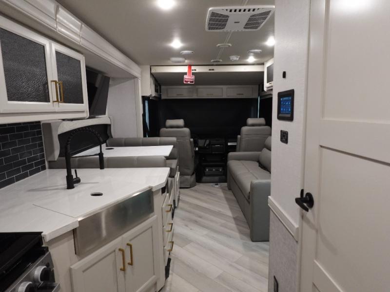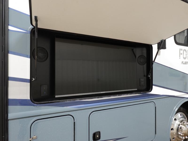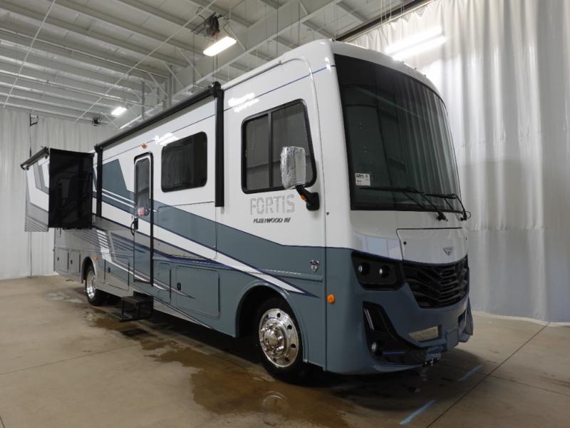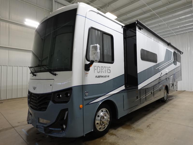 The Fleetwood Fortis Class A gas motorhome is a powerhouse of luxury and convenience, and it also is quite literally a powerhouse with its Ford 7.3L V8 335HP engine with 468 LB/FT of torque. The construction includes a Dryseal edge coating for all ceilings, walls, and floor, and the Powerlock System 2 has interlocking walls to the roof for stability. Automatic hydraulic leveling jacks make the set-up process easier, and you'll love the new captain's seats by Villa. You will find vinyl tile flooring all throughout the interior, as well as full-extension drawer guides with latches, coordinating window treatments, and energy-efficient LED flush-mount ceiling lighting.