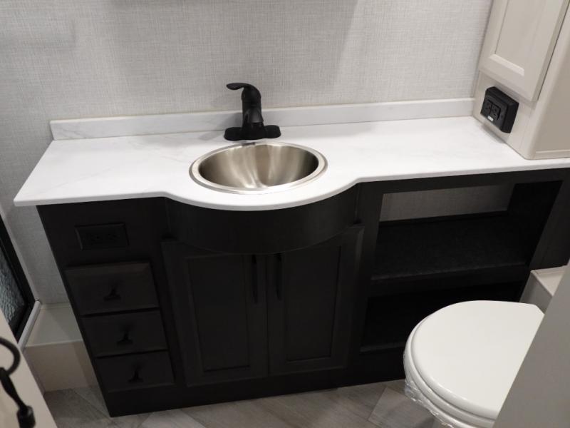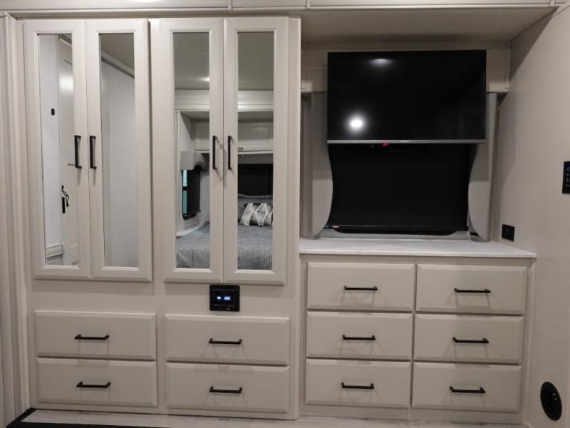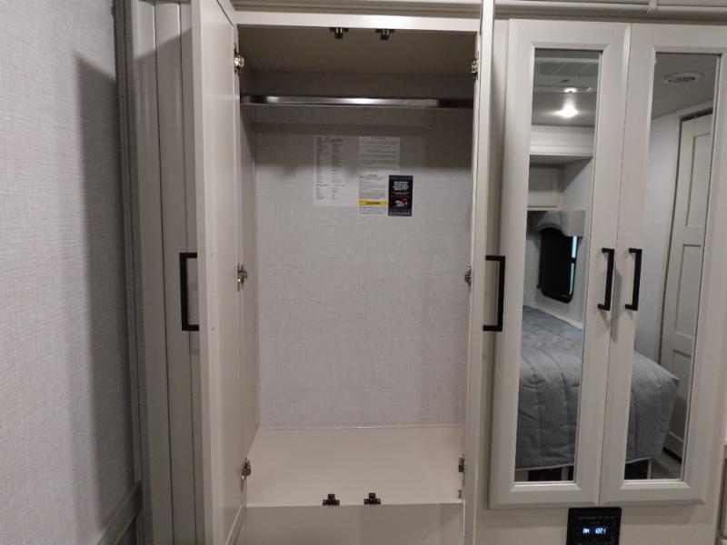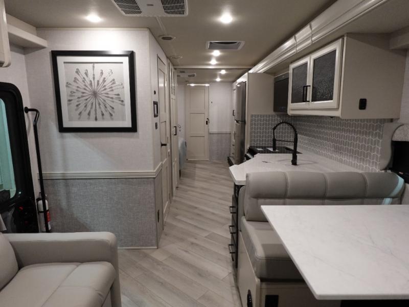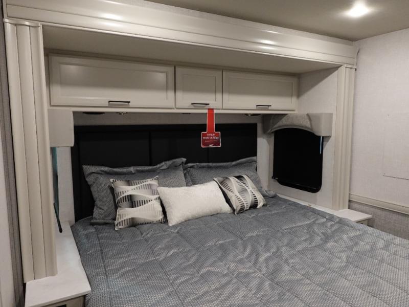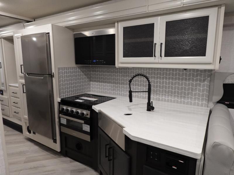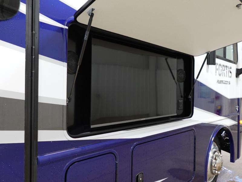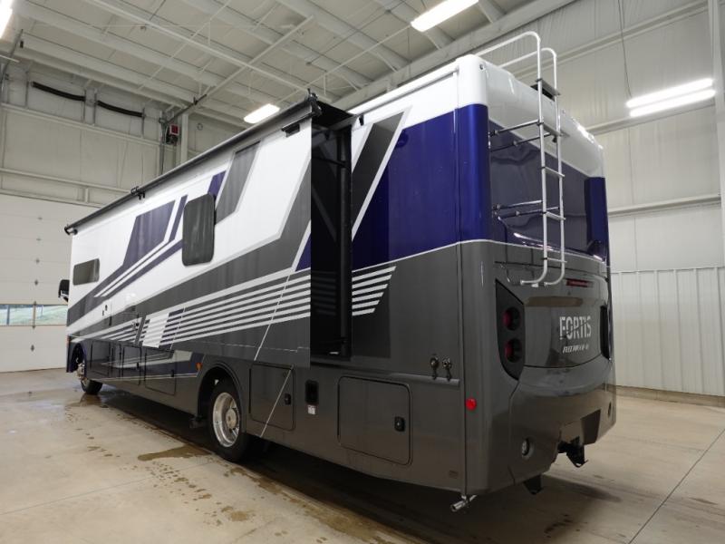 The Fleetwood Fortis Class A gas motorhome is a powerhouse of luxury and convenience, and it also is quite literally a powerhouse with its Ford 7.3L V8 335HP engine with 468 LB/FT of torque. The construction includes a Dryseal edge coating for all ceilings, walls, and floor, and the Powerlock System 2 has interlocking walls to the roof for stability. Automatic hydraulic leveling jacks make the set-up process easier, and you'll love the new captain's seats by Villa. You will find vinyl tile flooring all throughout the interior, as well as full-extension drawer guides with latches, coordinating window treatments, and energy-efficient LED flush-mount ceiling lighting.