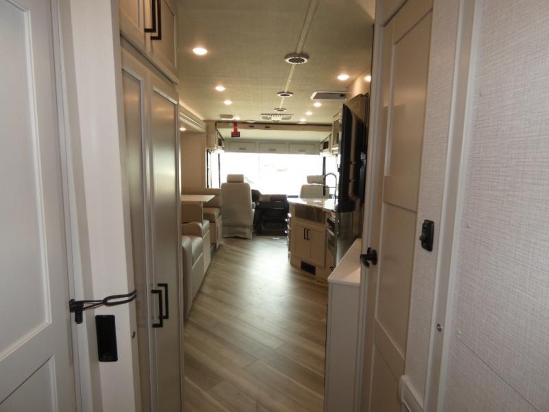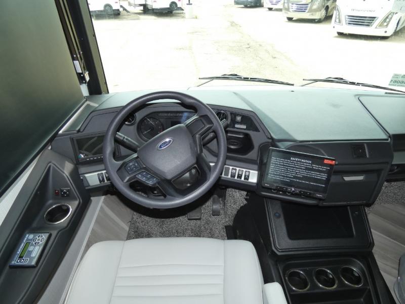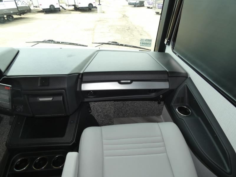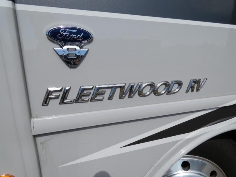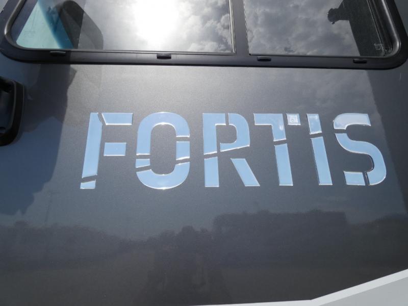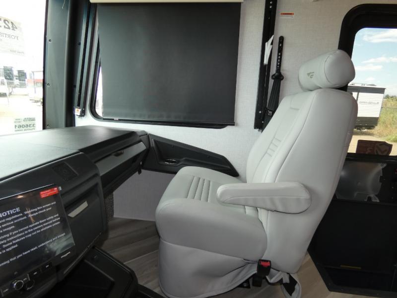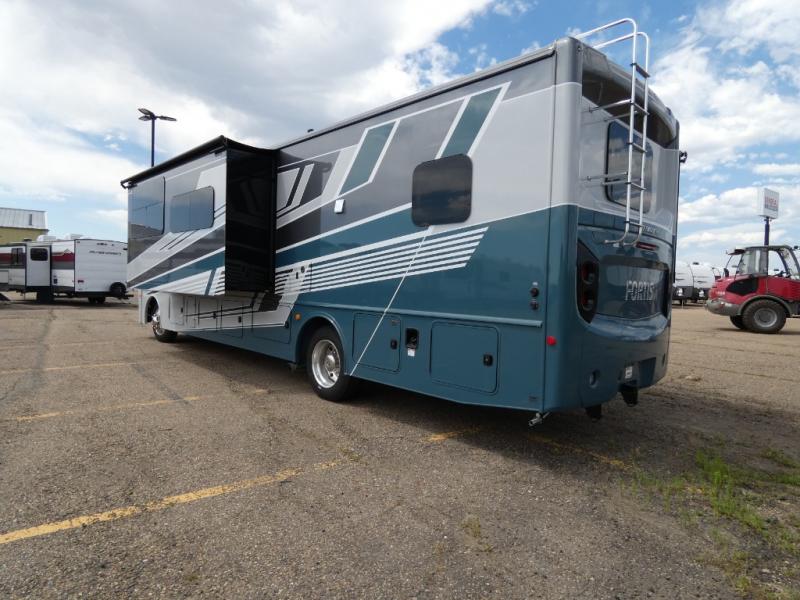 The Fleetwood Fortis Class A gas motorhome is a powerhouse of luxury and convenience, and it also is quite literally a powerhouse with its Ford 7.3L V8 335HP engine with 468 LB/FT of torque. The construction includes a Dryseal edge coating for all ceilings, walls, and floor, and the Powerlock System 2 has interlocking walls to the roof for stability. Automatic hydraulic leveling jacks make the set-up process easier, and the cab has excellent features, like a 9" stereo with AM/FM/Bluetooth, backup camera, reclining/swivel cab seats, driver/passenger center table, and an automotive-style dash with dual monitors and workstation. You will find vinyl tile flooring all throughout the interior, as well as full-extension drawer guides with latches, coordinating window treatments, and energy-efficient LED flush-mount ceiling lighting.