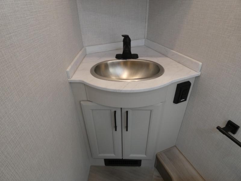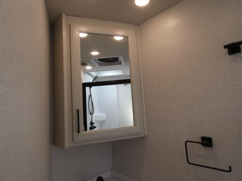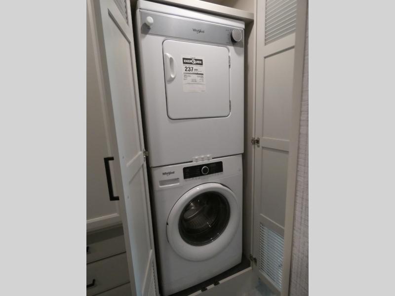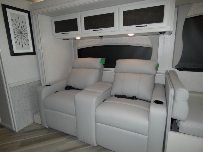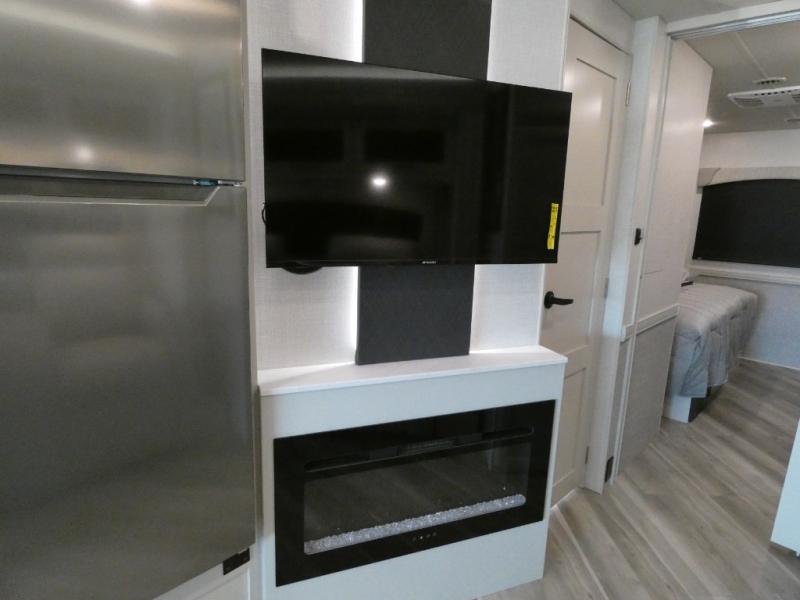 There is great convenience found in this Fortis Class A gas motorhome! But don't take our word for it; come check it out for yourself. You'll find that the private bedroom is one of your favorite spots with the Serenity Series RV king bed that sits on a slide out, the large wardrobe/dresser, and the LED TV across from the bed. Another great location is the kitchen because it has a pantry with swing and fixed shelves, a residential refrigerator, a convection microwave, and a three-burner cooktop. As you rest on the theater seats or dream dinette, you'll enjoy entertainment from the LED TV, and you will also enjoy some added coziness from the fireplace.