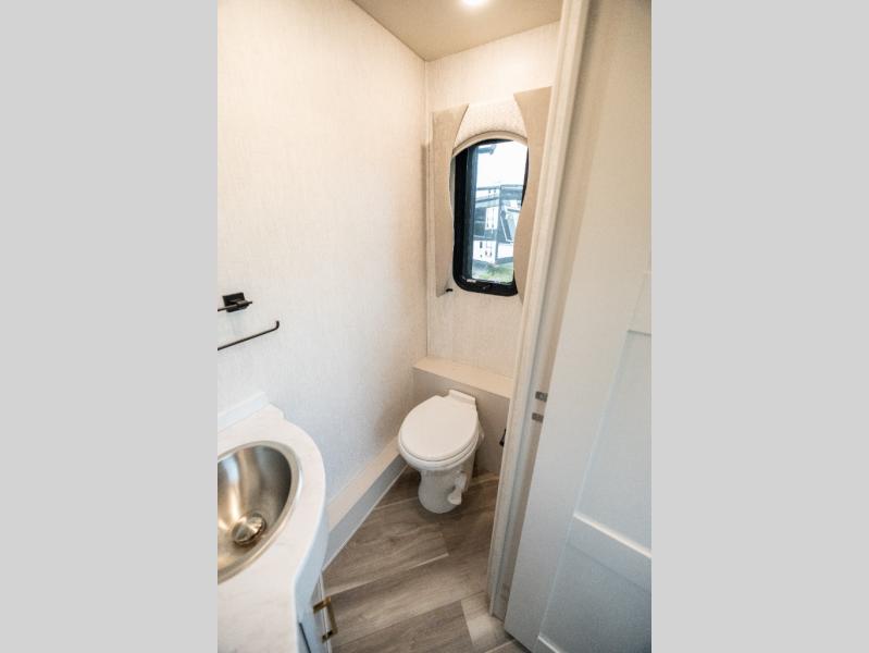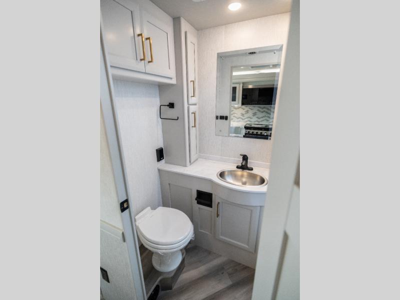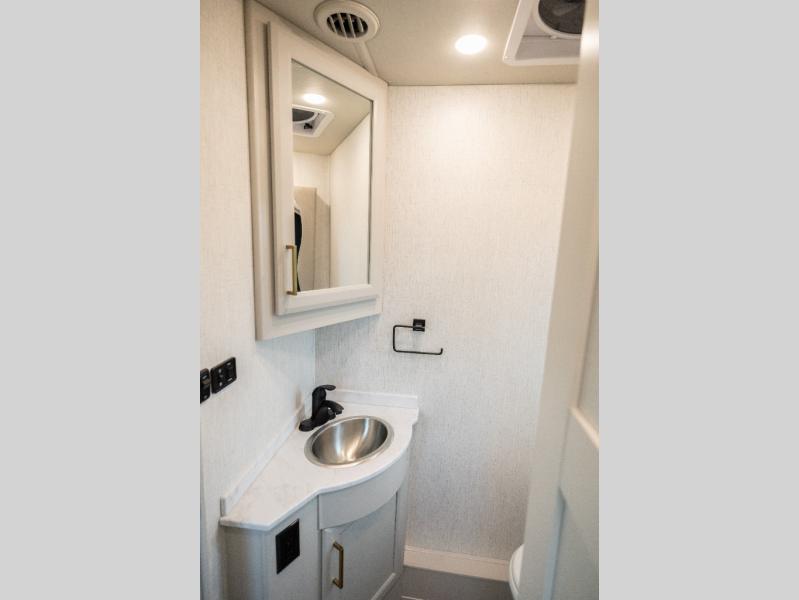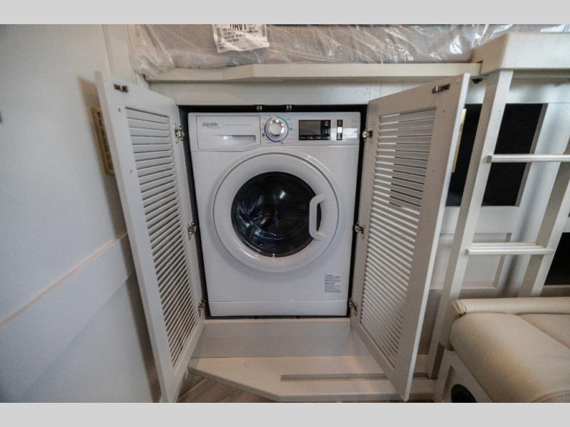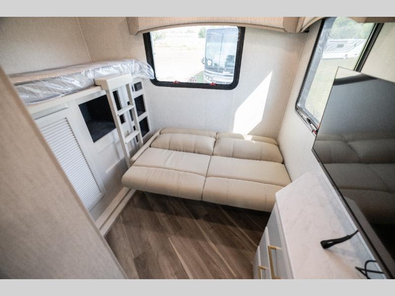 Your crew of eight to nine will love this spacious coach! There is a full-wall slide plus a queen bed slide out that will provide ample space for everyone to stretch out. The little ones will love the Kid Kave/bunkhouse suite that includes a jack knife sofa, balcony loft, a swing LED TV, a wardrobe, plus their own half bath; how convenient! You will have the private bedroom all to yourselves with a Serenity Series RV queen bed, dual wardrobes, and a bedroom LED TV with a dresser to keep your clothes tidy. After a day of traveling, everyone can relax in the main living area on the jackknife sofa or at the L-shaped dinette. There is a third LED TV here plus a Hide-A-Loft electric drop-down bunk for one or two guests. The kitchen includes everything you need to prepare meals each day, including a three burner cooktop, a stainless steel convection microwave, a residential refrigerator, plus a pantry for snacks and paper goods. And don't overlook the exterior with its exterior kitchen that includes a mini-fridge and pull-out griddle, plus a quick connect spray down hose and storage!