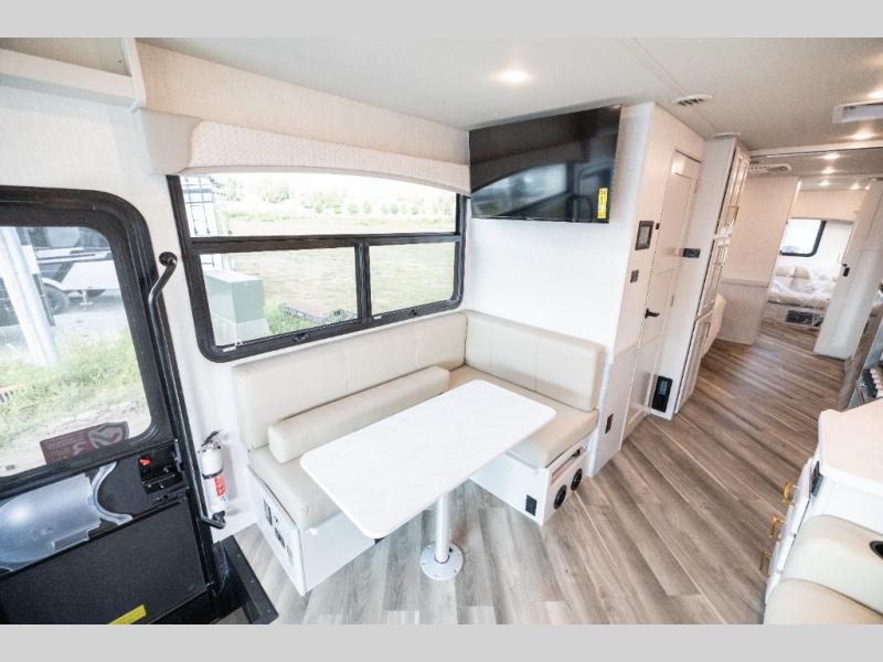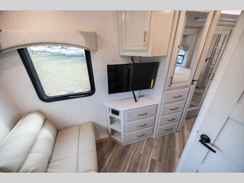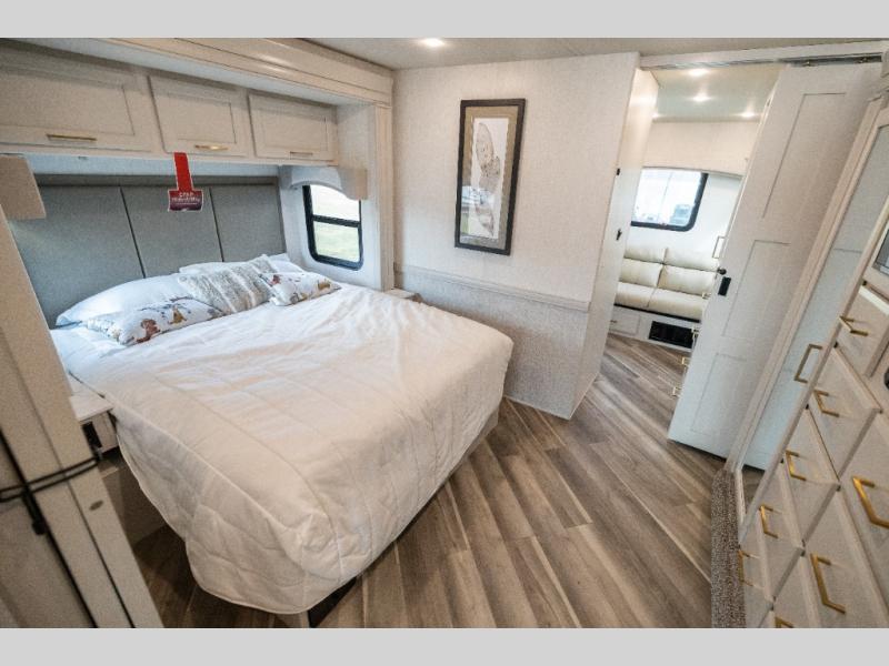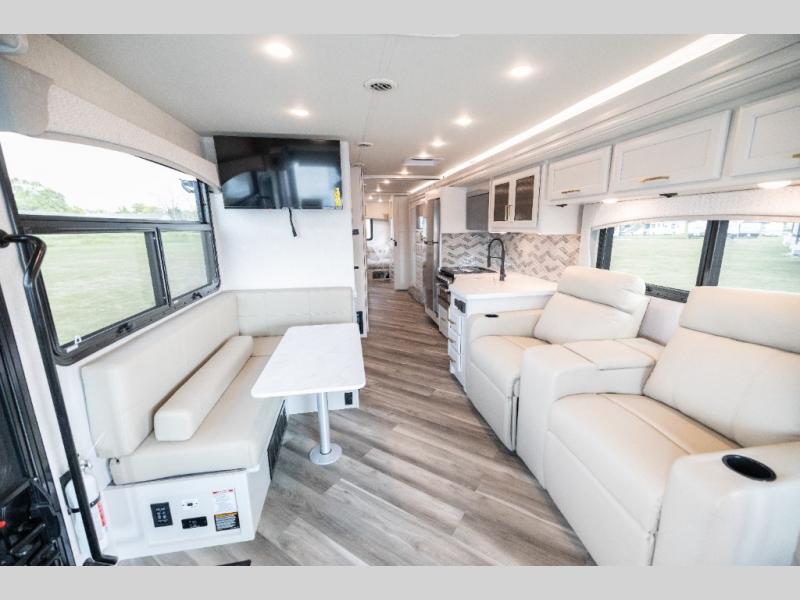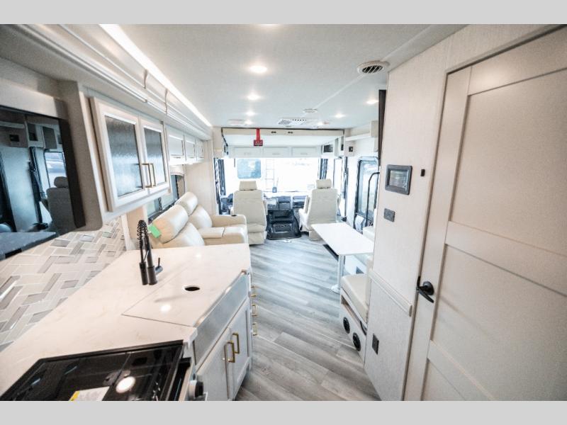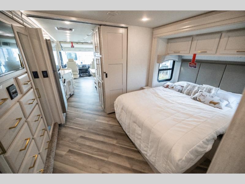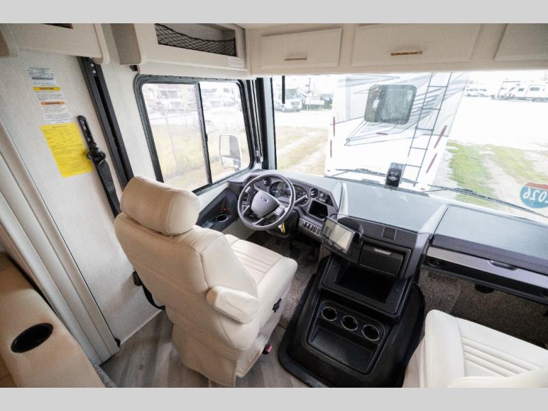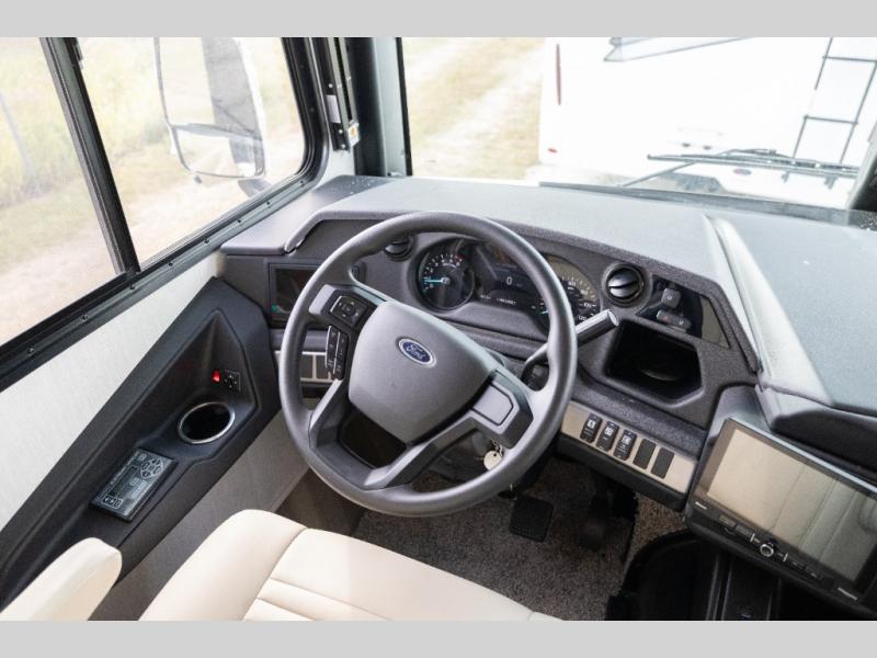 The Fleetwood Fortis Class A gas motorhome is a powerhouse of luxury and convenience, and it also is quite literally a powerhouse with its Ford 7.3L V8 335HP engine with 468 LB/FT of torque. The construction includes a Dryseal edge coating for all ceilings, walls, and floor, and the Powerlock System 2 has interlocking walls to the roof for stability. Automatic hydraulic leveling jacks make the set-up process easier, and the cab has excellent features, like a 9" stereo with AM/FM/Bluetooth, backup camera, reclining/swivel cab seats, driver/passenger center table, and an automotive-style dash with dual monitors and workstation. You will find vinyl tile flooring all throughout the interior, as well as full-extension drawer guides with latches, coordinating window treatments, and energy-efficient LED flush-mount ceiling lighting.