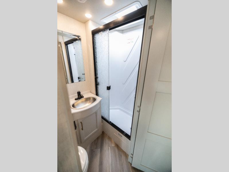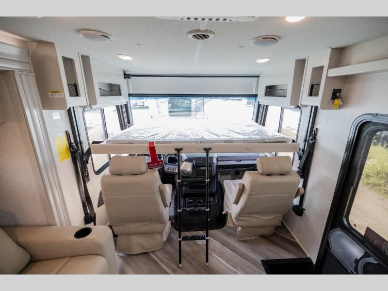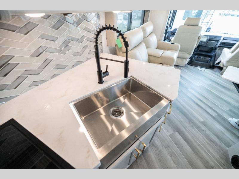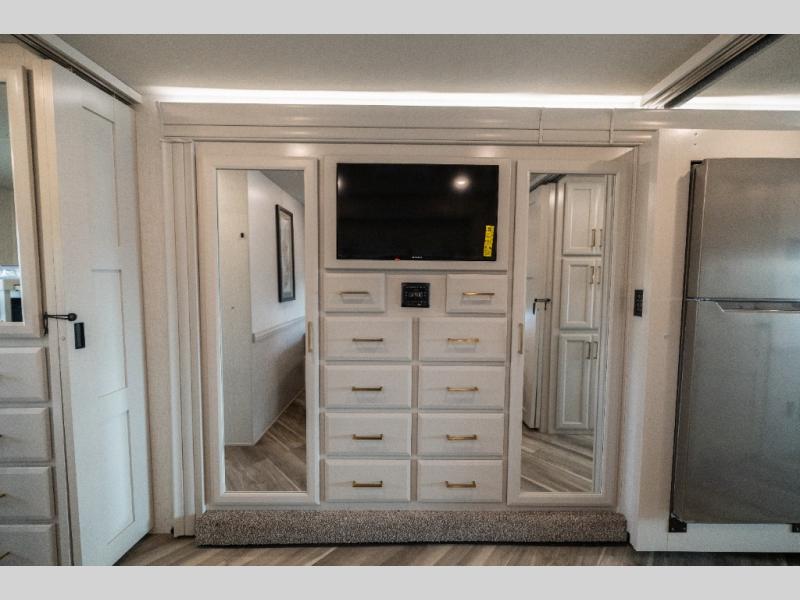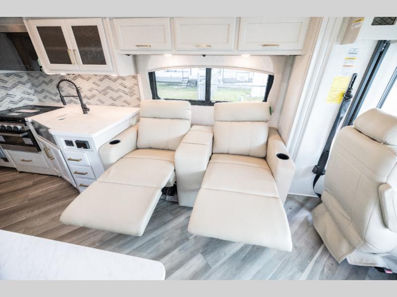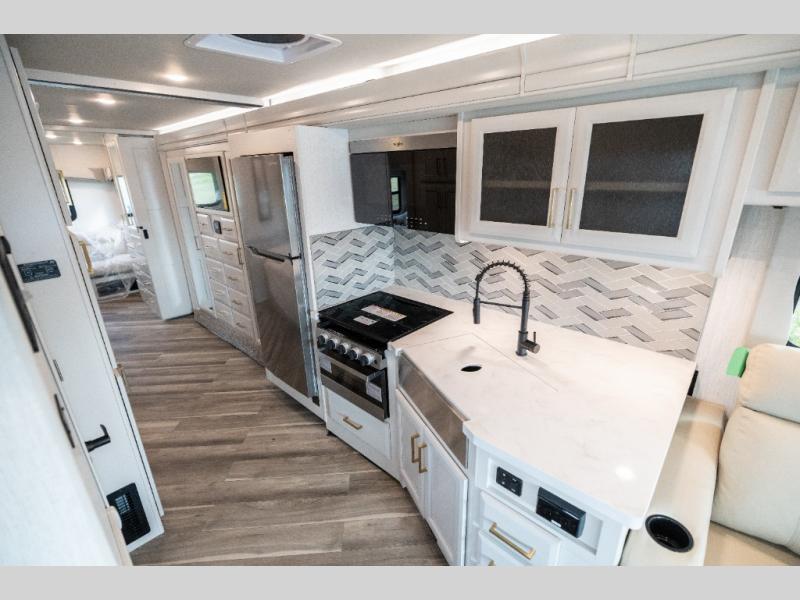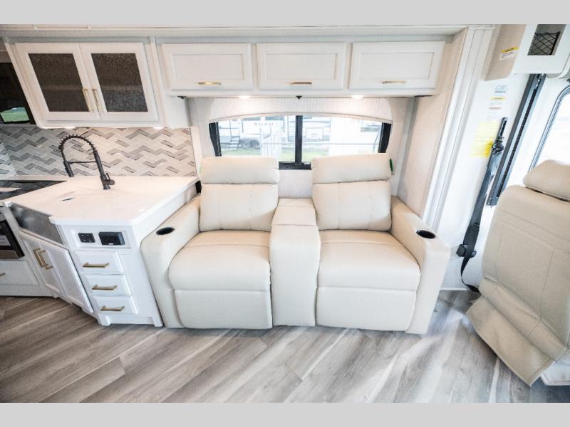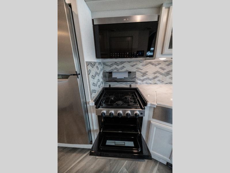 The Fleetwood Fortis Class A gas motorhome is a powerhouse of luxury and convenience, and it also is quite literally a powerhouse with its Ford 7.3L V8 335HP engine with 468 LB/FT of torque. The construction includes a Dryseal edge coating for all ceilings, walls, and floor, and the Powerlock System 2 has interlocking walls to the roof for stability. Automatic hydraulic leveling jacks make the set-up process easier, and the cab has excellent features, like a 9" stereo with AM/FM/Bluetooth, backup camera, reclining/swivel cab seats, driver/passenger center table, and an automotive-style dash with dual monitors and workstation. You will find vinyl tile flooring all throughout the interior, as well as full-extension drawer guides with latches, coordinating window treatments, and energy-efficient LED flush-mount ceiling lighting.