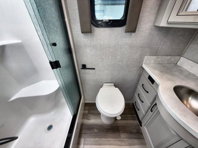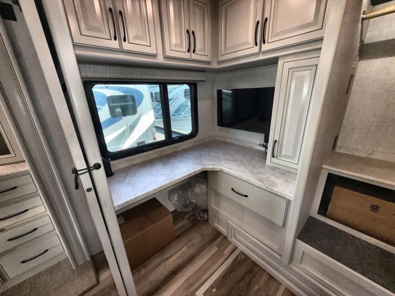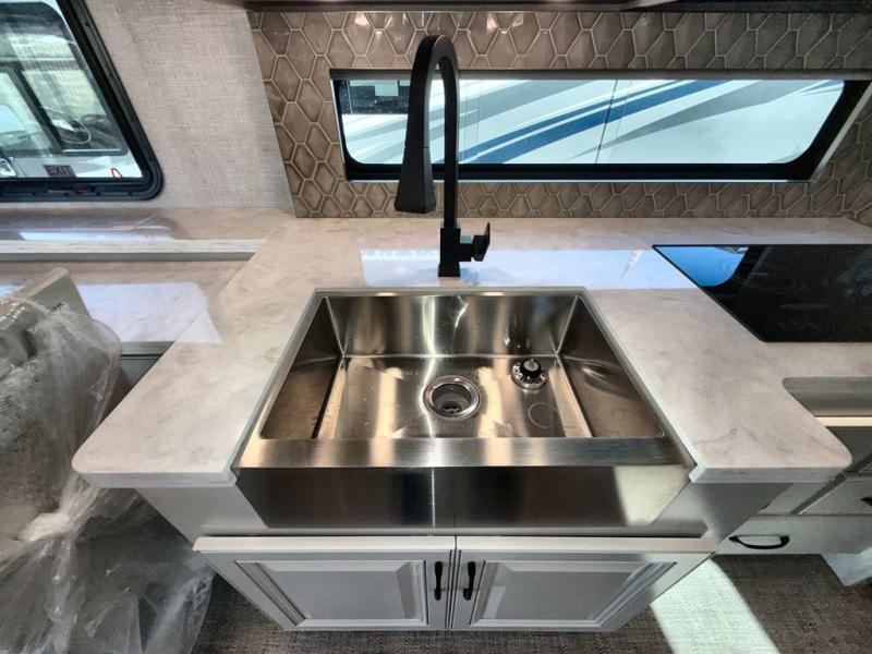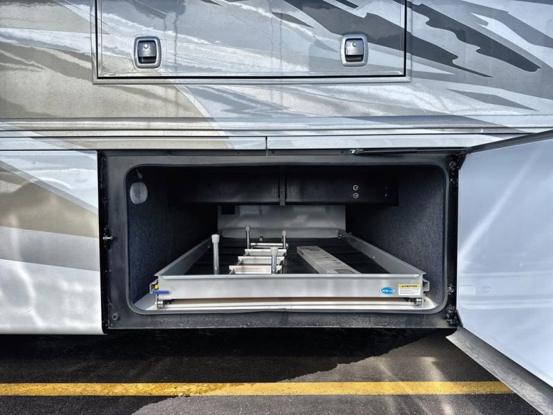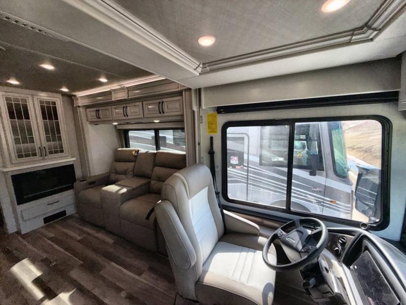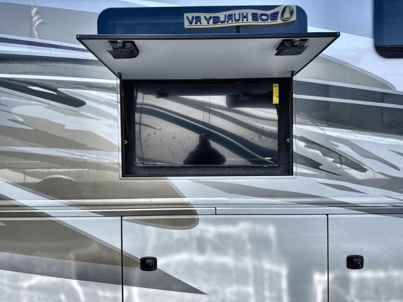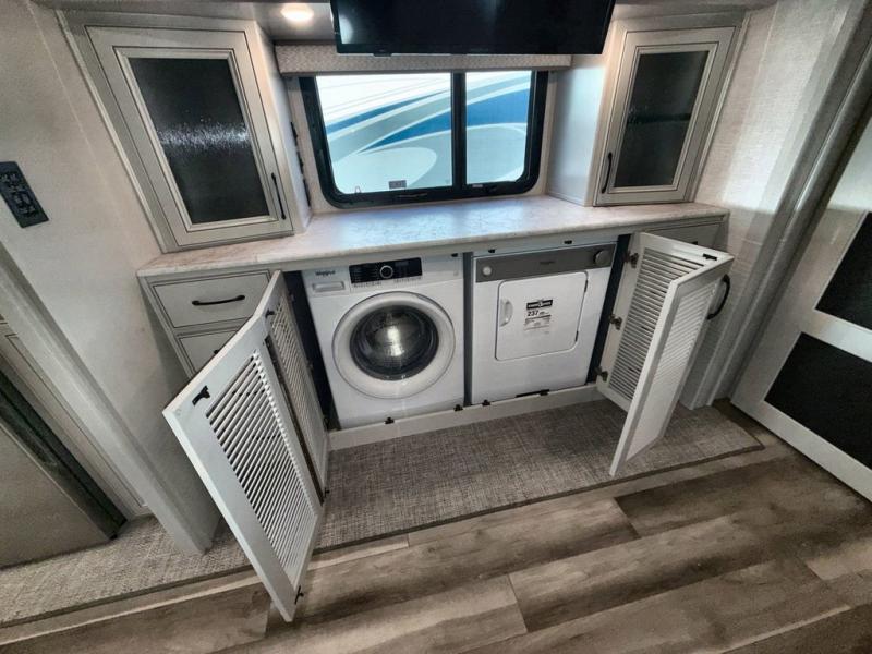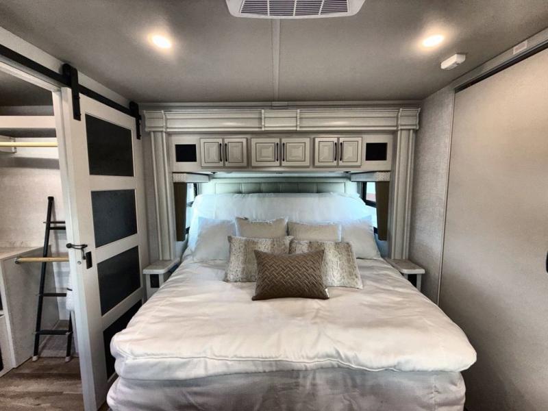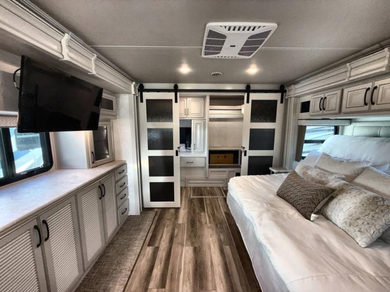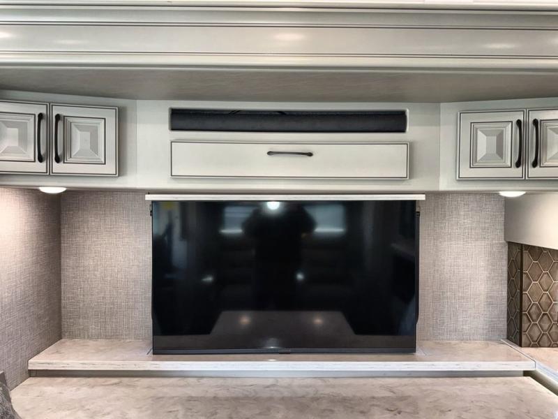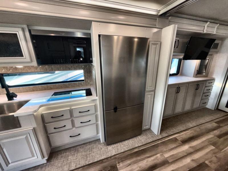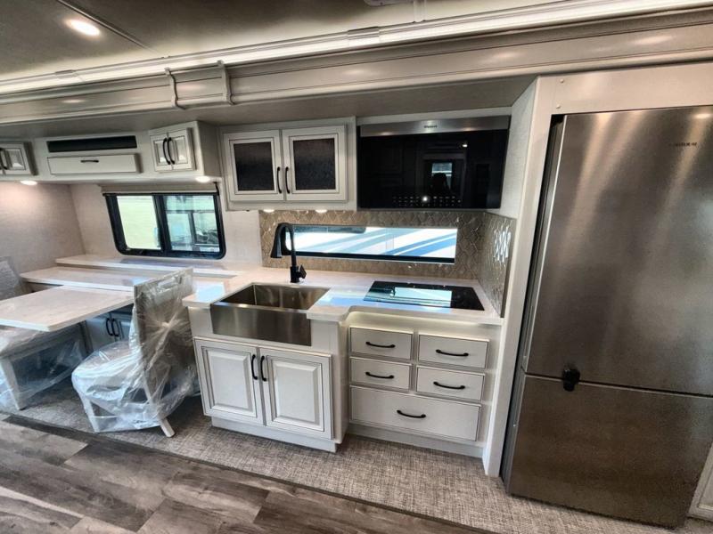 So much room to relax in this coach with triple slides! A spacious front living area offers a cozy fireplace with a sofa sleeper with queen mattress plus a Dream Dinette. Mid-coach you'll find a full bath with shower across from a well-equipped kitchen with a residential refrigerator, convection microwave, induction cooktop, and a pantry to hold all of your supplies. At night you'll sleep well on the king bed, with dedicated CPAP storage overhead. Bedroom storage abounds with a dresser unit with overhead storage plus an LED TV. This model comes standard with a rear walk-in closet with tons of storage, two dressers, a bench, and a pull-out hamper, all behind sliding doors.