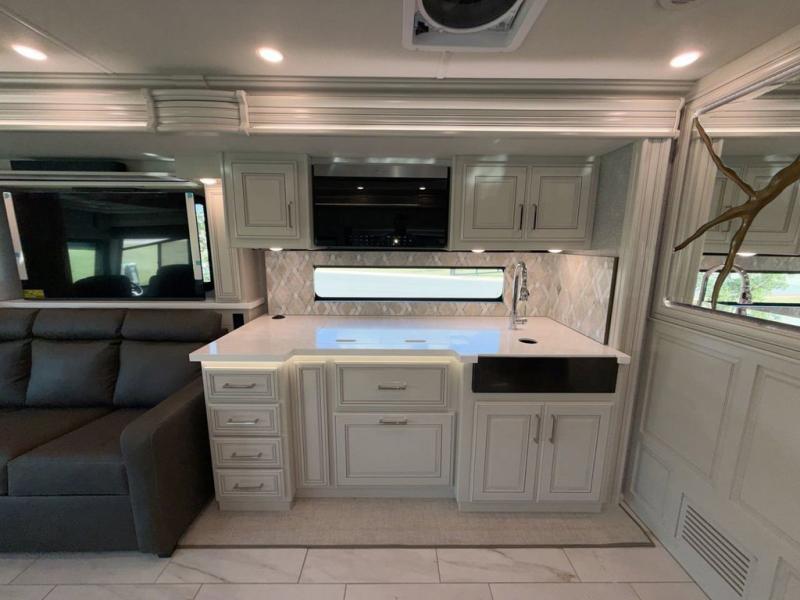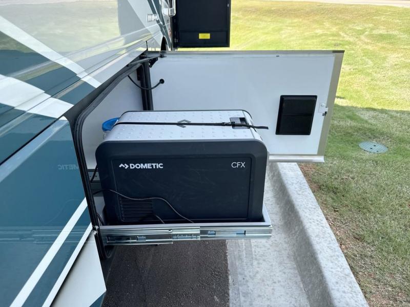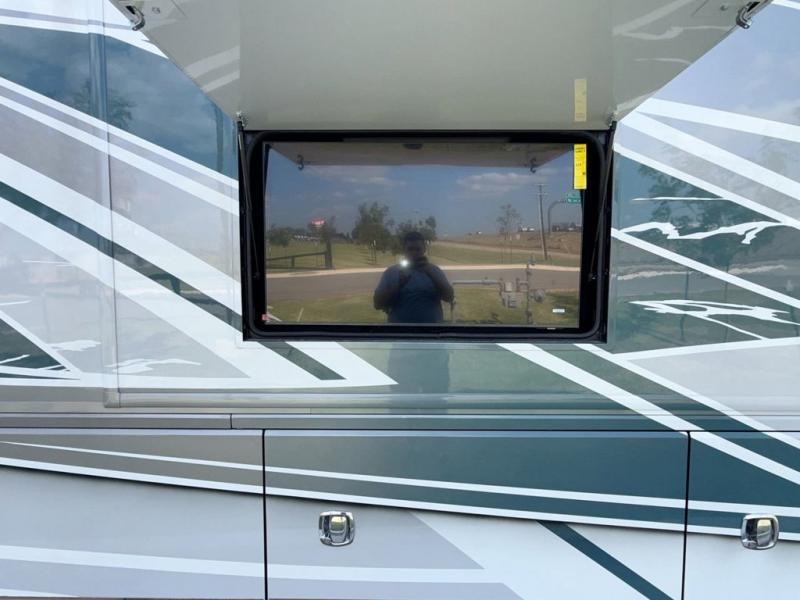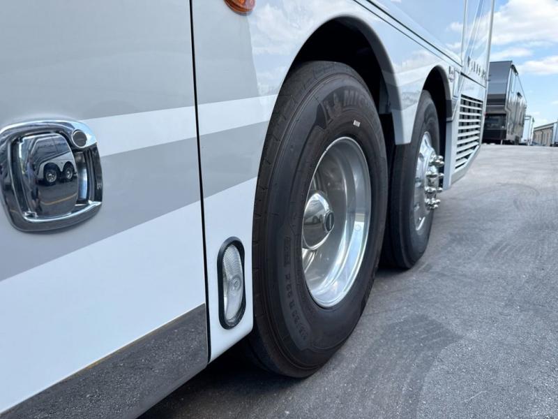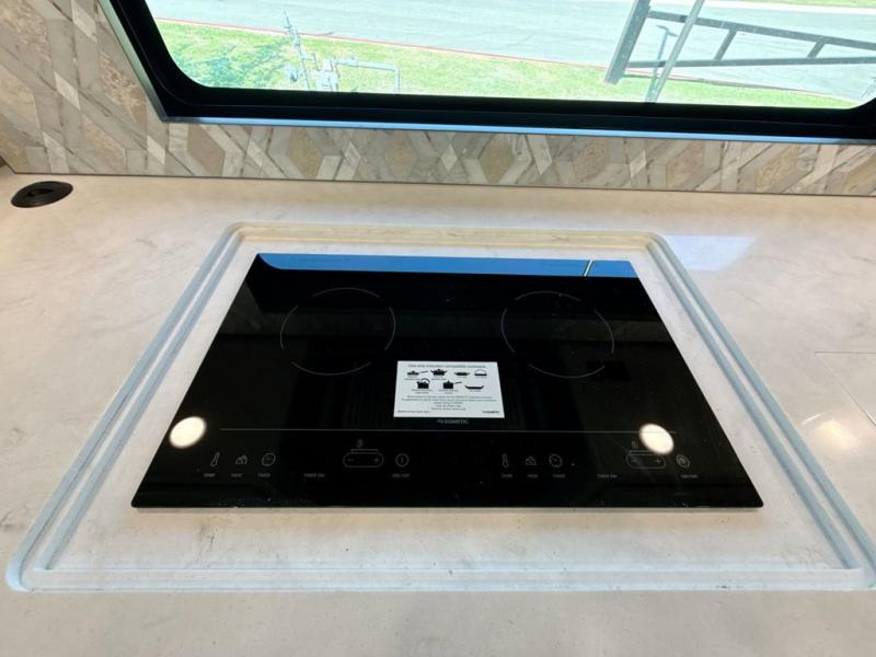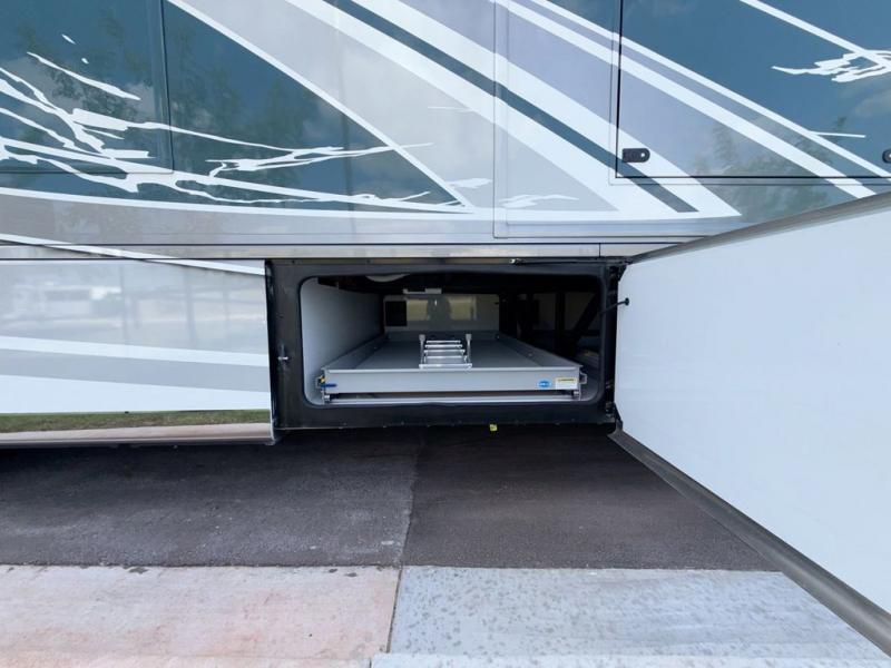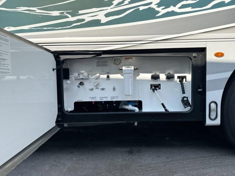 Head across the country or state in this spacious coach! The motion power lounge provides a comfy place to relax, and the sleeper sofa with a full-size mattress will be perfect for guests. You can also choose to add the optional Hide-A-Loft overhead bunk if you're needing more sleeping space. The full kitchen includes a two burner induction cooktop and stainless steel over-the-range convection microwave to cook meals, plus a dishwasher for easy clean-up and a residential refrigerator for food storage. You will love having a king bed slide out to sleep on, along with dual bedroom wardrobes and a dresser to keep your clothes tidy. The mid-coach half bath is easily accessible for everyone to use, and the full rear master bath is sure to be a big bonus. Here, you'll find dual bath sinks, a spacious shower, and a walk-in closet with tons of storage and a stackable washer and dryer. This coach also includes LED TVs to keep you entertained, including an exterior entertainment center with a Bluetooth soundbar!