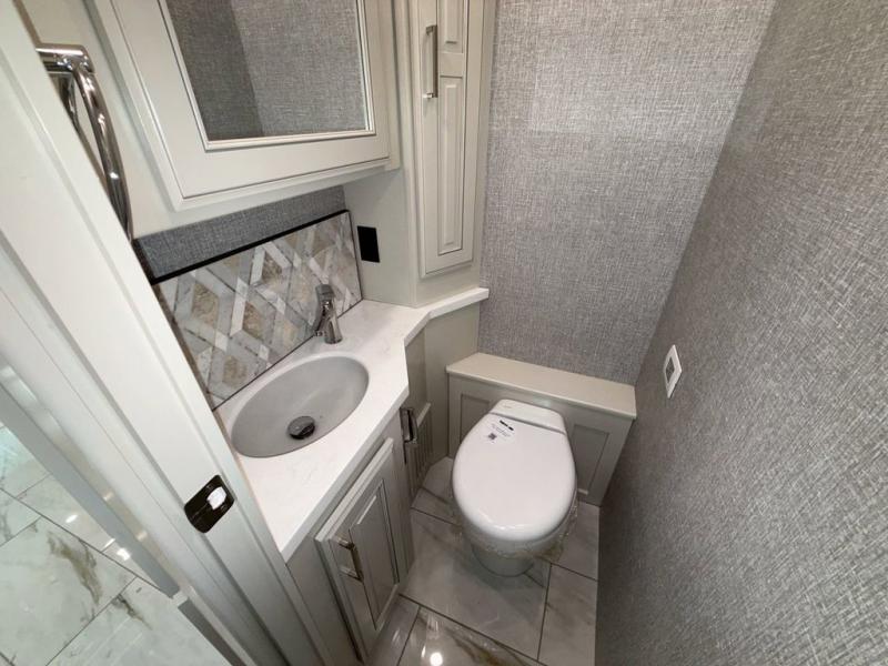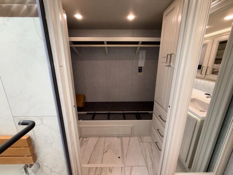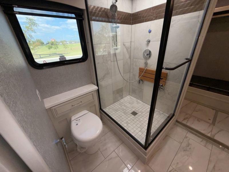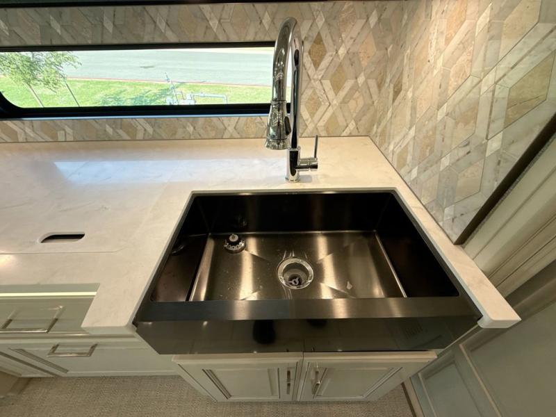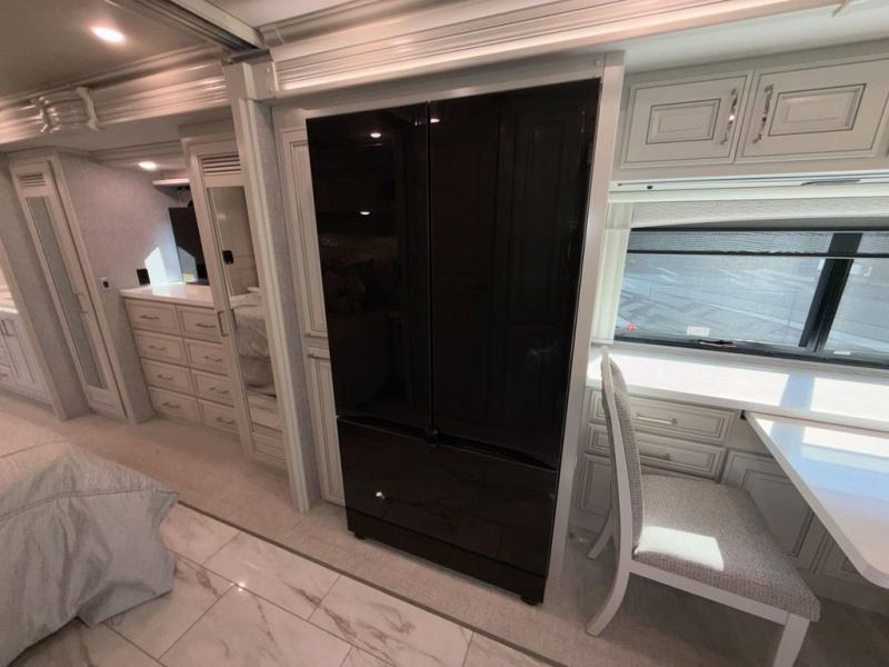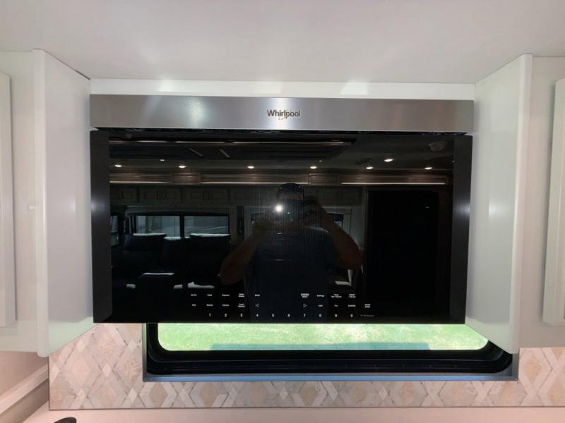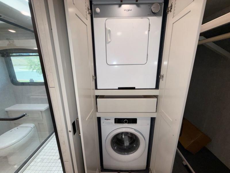 Head across the country or state in this spacious coach! The motion power lounge provides a comfy place to relax, and the sleeper sofa with a full-size mattress will be perfect for guests. You can also choose to add the optional Hide-A-Loft overhead bunk if you're needing more sleeping space. The full kitchen includes a two burner induction cooktop and stainless steel over-the-range convection microwave to cook meals, plus a dishwasher for easy clean-up and a residential refrigerator for food storage. You will love having a king bed slide out to sleep on, along with dual bedroom wardrobes and a dresser to keep your clothes tidy. The mid-coach half bath is easily accessible for everyone to use, and the full rear master bath is sure to be a big bonus. Here, you'll find dual bath sinks, a spacious shower, and a walk-in closet with tons of storage and a stackable washer and dryer. This coach also includes LED TVs to keep you entertained, including an exterior entertainment center with a Bluetooth soundbar!