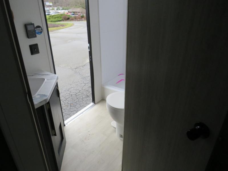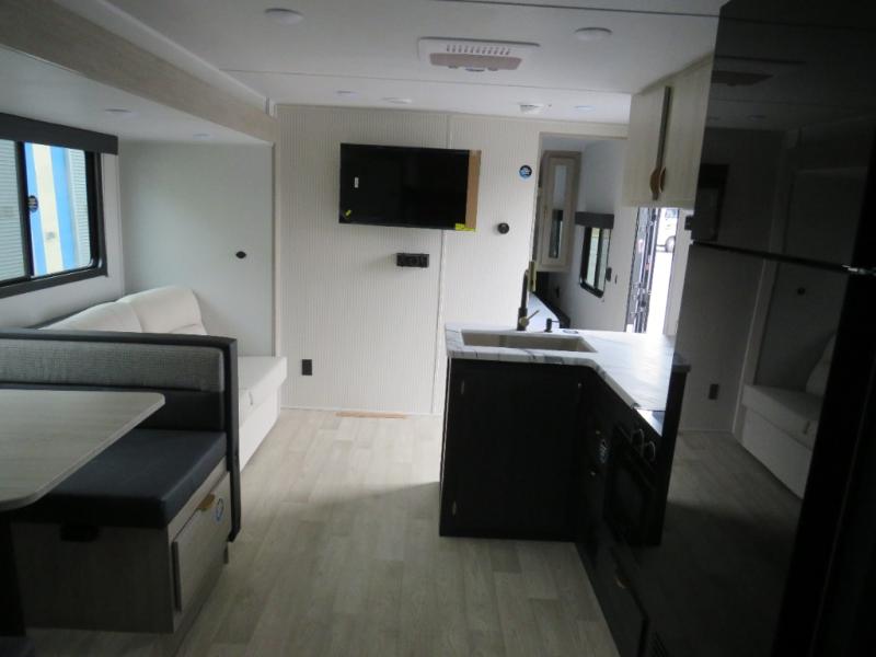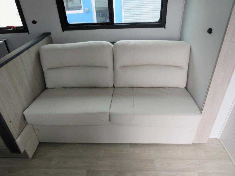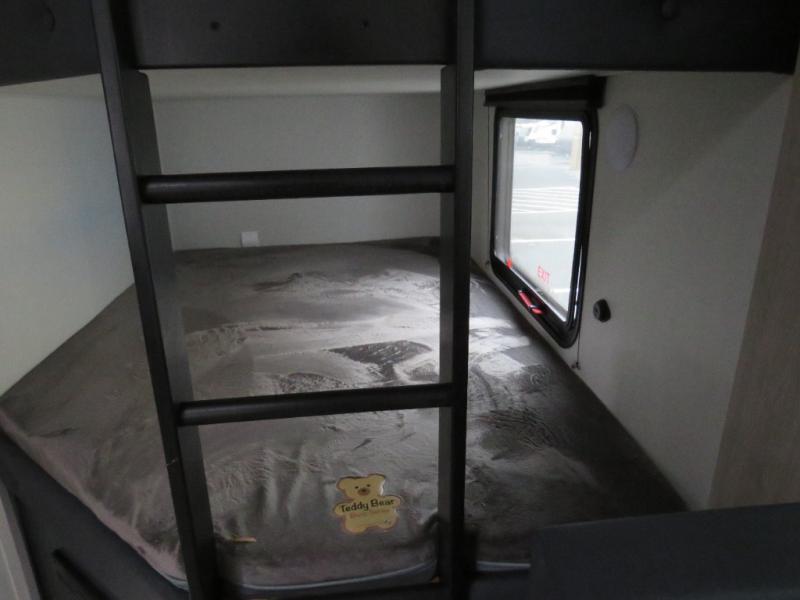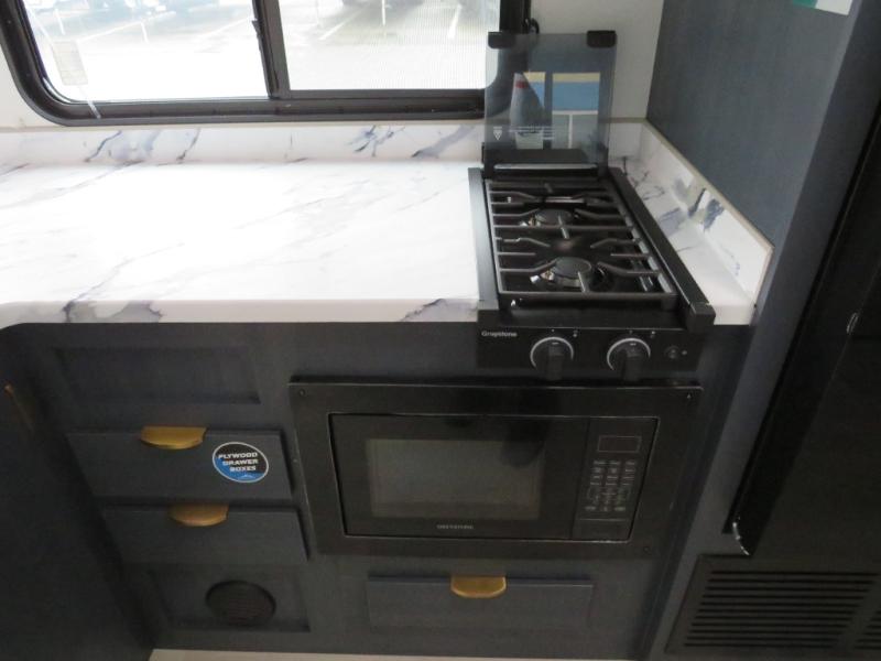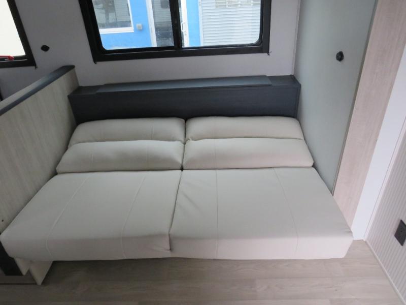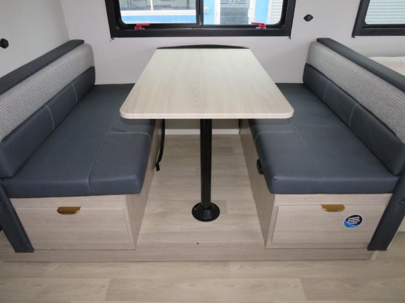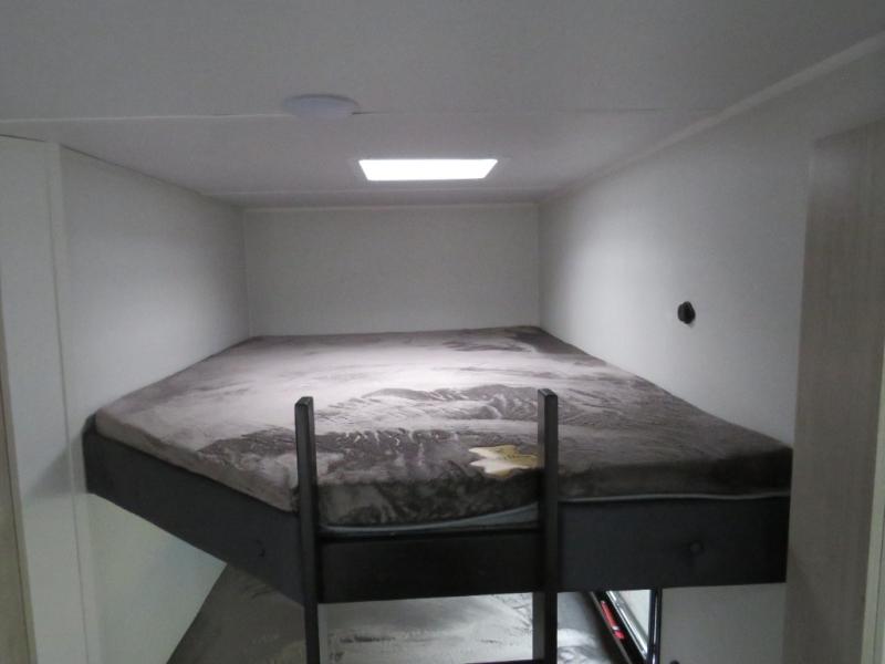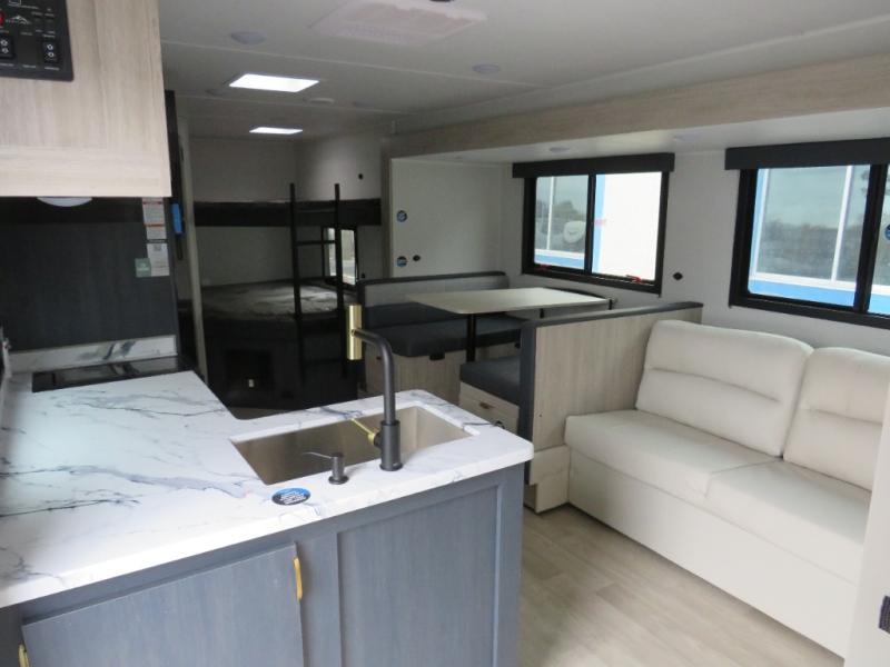 Bunk beds for the kiddos’ sleep! Front bedroom’s got a comfy king bed, wardrobes, and nightstands, perfect for grown-ups. The booth dinette is perfect for meals or games. Also, the jackknife sofa is ideal for extra chill space. Plus, the kitchen area adds a touch of feeling at home with its pantry, fridge, two-burner cooktop, microwave, and sink, ideal for preparing meals for the crew! And everyone will stay fresh with the full bathroom.