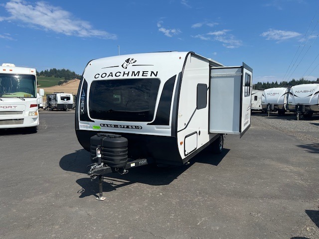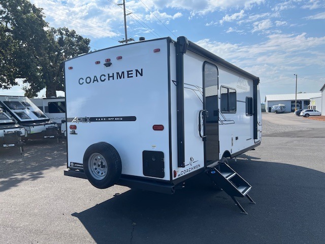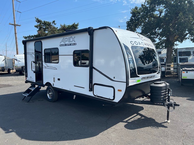 You will find comfort, convenience, and a sturdy construction with each of these Coachmen RV Apex Nano travel trailers! They are held together with an aluma-cage construction, an I-beam chassis, plus vacuum-bonded laminated dual Azdel fiberglass walls for double the protection against the elements. The 200-watt solar panel with a 30 amp control charger is included within the Off-Grid Package, along with two 20 lb. LP tanks, a high velocity power roof vent, plus 12V outlets to keep you powered up. More exterior feature include a hot/cold shower, four stabilizer jacks, a power awning with LED lighting, and magnetic baggage door catches to easily pack and unload your gear. You will love the interior of your Apex Nano with Congoleum residential flooring, one-piece seamless edge countertops, matte black hardware in the galley, and a hand-crafted wood medicine cabinet in the bath.