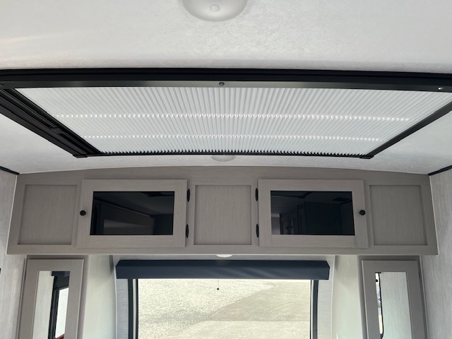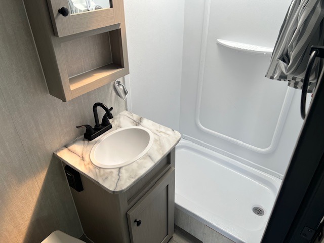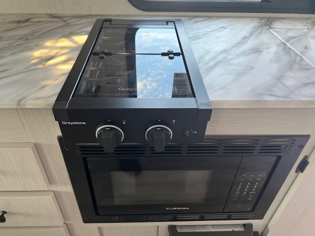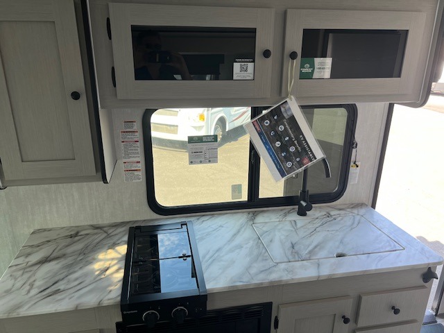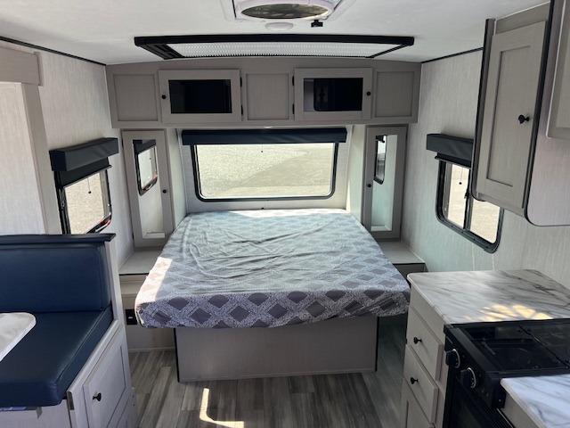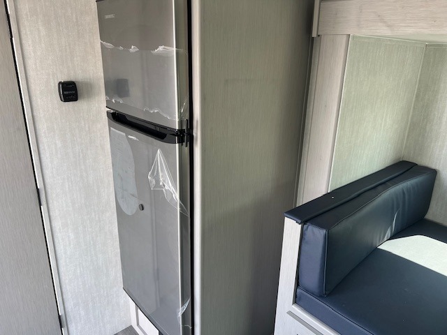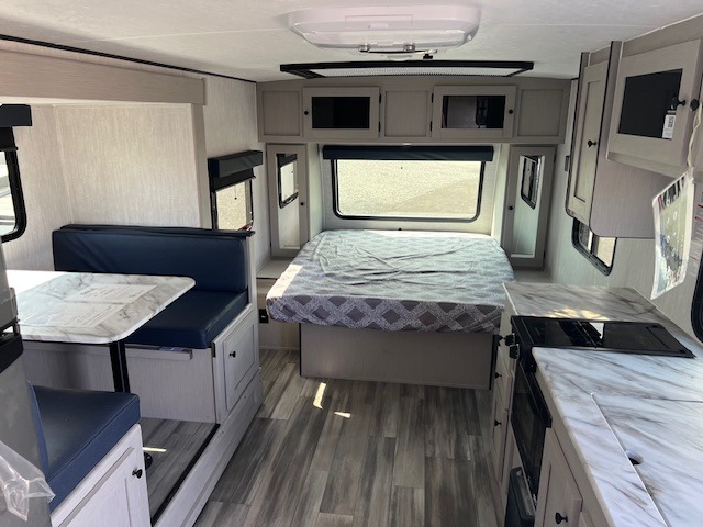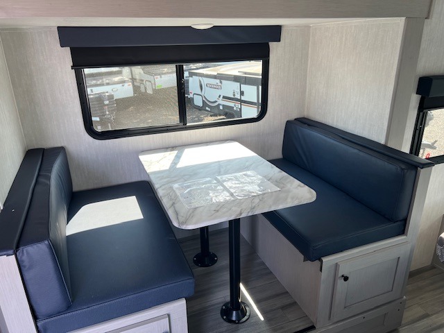 Whether you camp with friends, family or solo, this trailer gives you space for all with a spacious main living and kitchen area thanks to the booth dinette slide! The rear full bath offers a shower, sink, toilet and a wardrobe so you can get ready in privacy. A two burner cooktop and microwave underneath will let you make meals each day, and the 12V refrigerator will be perfect for perishables. The walk-around queen-size bed provides convenience when getting in and out of bed and there are two wardrobes and overhead cabinets to keep your belongings up and away. The power awning protects you from the elements when relaxing outside, and the exterior pass-through storage gives you a place to stow the outdoor equipment like camping chairs, tables, fishing poles and charcoal.