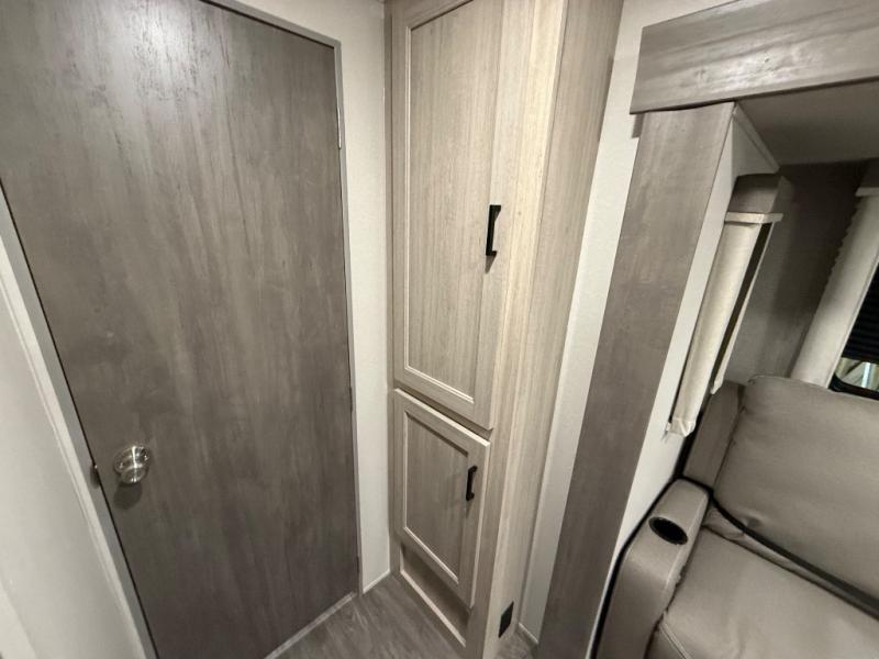 You're going to love every minute spent in this travel trailer with double slide outs and double entry doors. The front kitchen includes ample counter space to prep and cook meals, plus there are two pantries for storage space. Your crew can get comfortable on the 68" sofa or play a game at the 45" booth dinette. There is also an entertainment center with a LED TV for movie night, or you might head outdoors to relax under the 18' awning. The exterior camper kitchen here includes a griddle and a mini refrigerator the chef of your group is sure to love. When it's time to call it a night, head to the rear master bedroom that includes a 60" x 74" queen bed slide out, a large wardrobe, plus your own entrance into the dual entry bath!