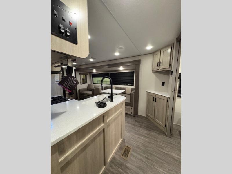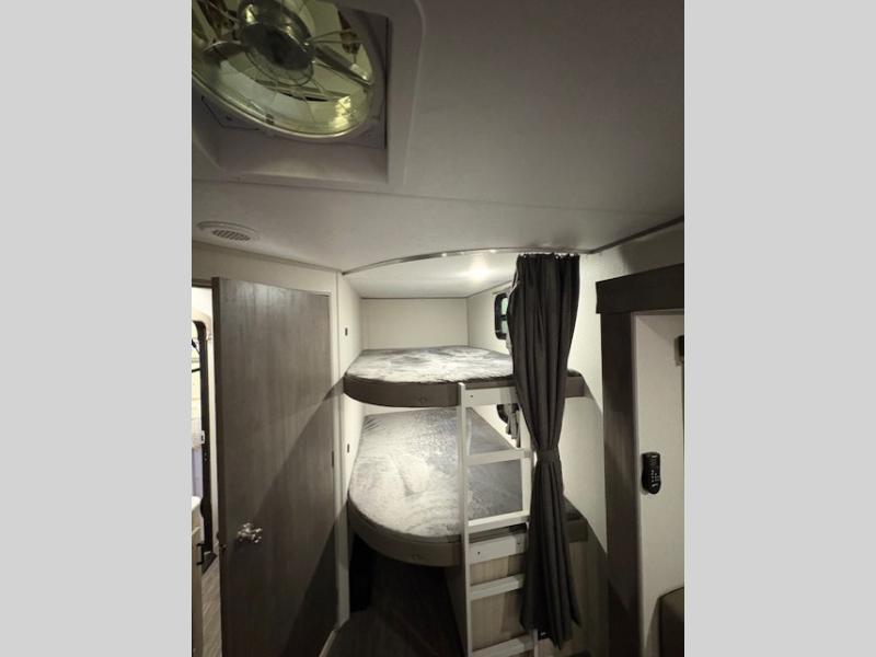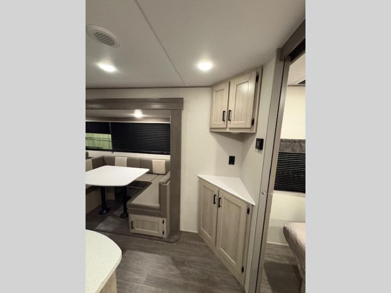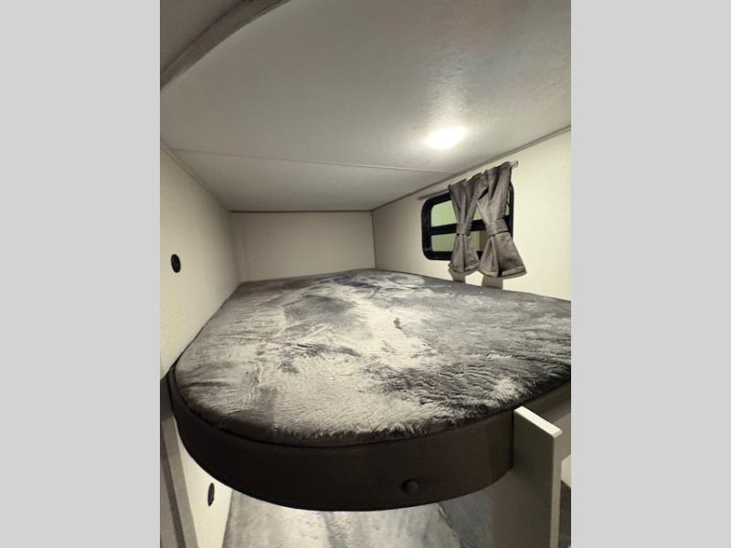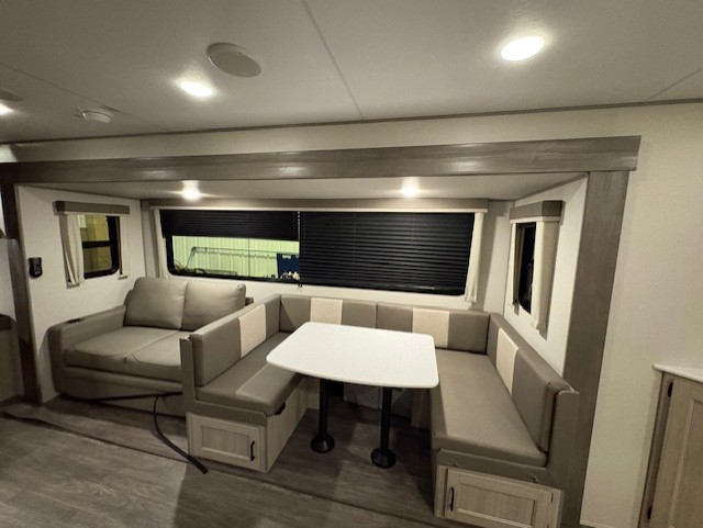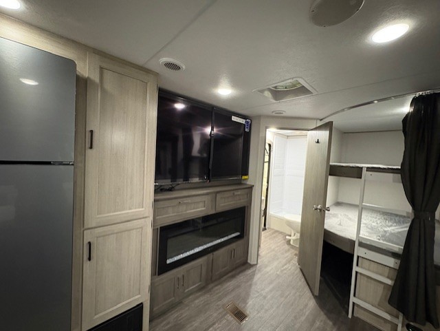 Life is easier in this travel trailer with dual entry doors! One of the entrances is right next to the front private bedroom which has a 60" x 74" queen bed with wardrobes on either side to keep your things tidy. The second entrance leads into the full bath, which also includes a full tub to make bathtime easier for little ones. The living area has everything you need for a cozy evening indoors between the 60" trundle sofa, U-shaped dinette, and entertainment center with a fireplace and 65" TV for cozy movie nights. Cook a sunrise breakfast at the outside camper kitchen with a griddle and mini refrigerator. There is also exterior storage with a fold-down table and a TV hookup if you plan to watch the big game outdoors!