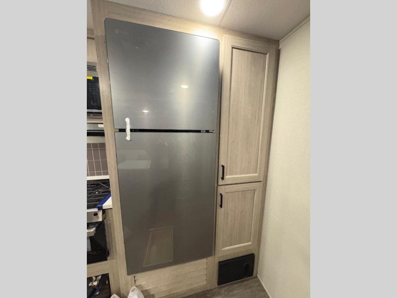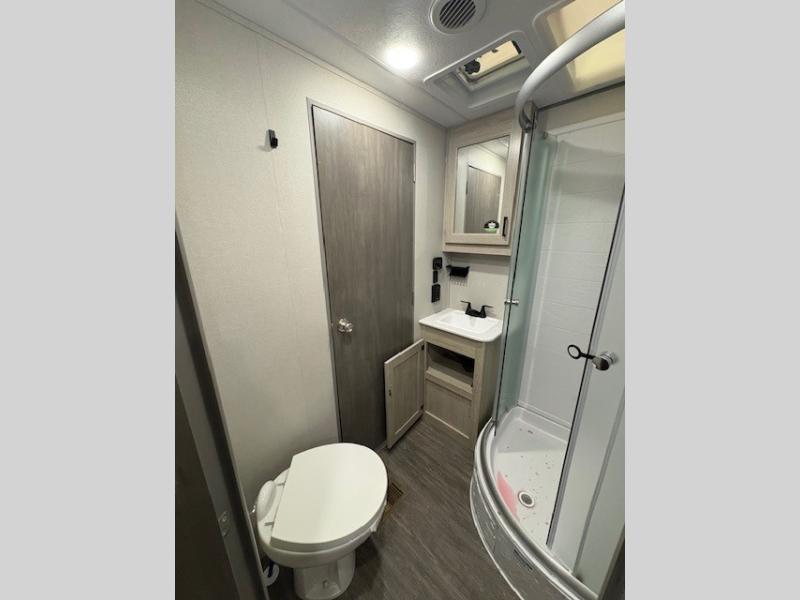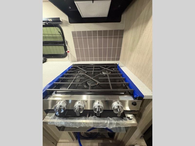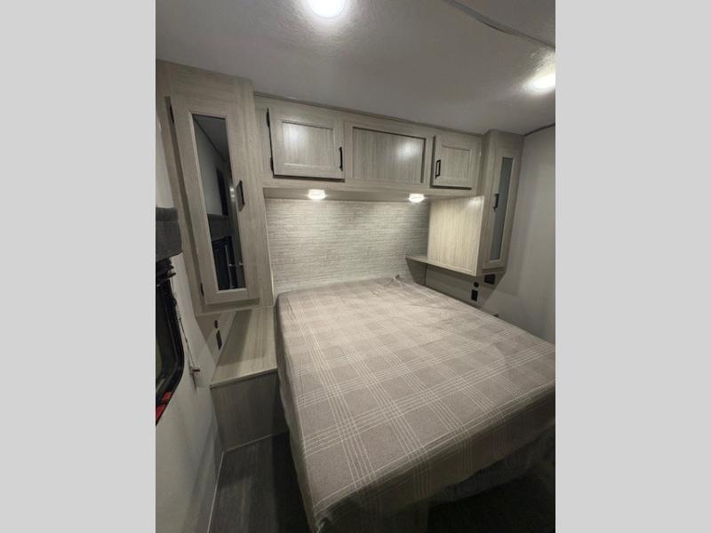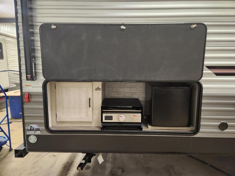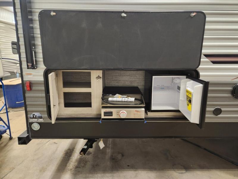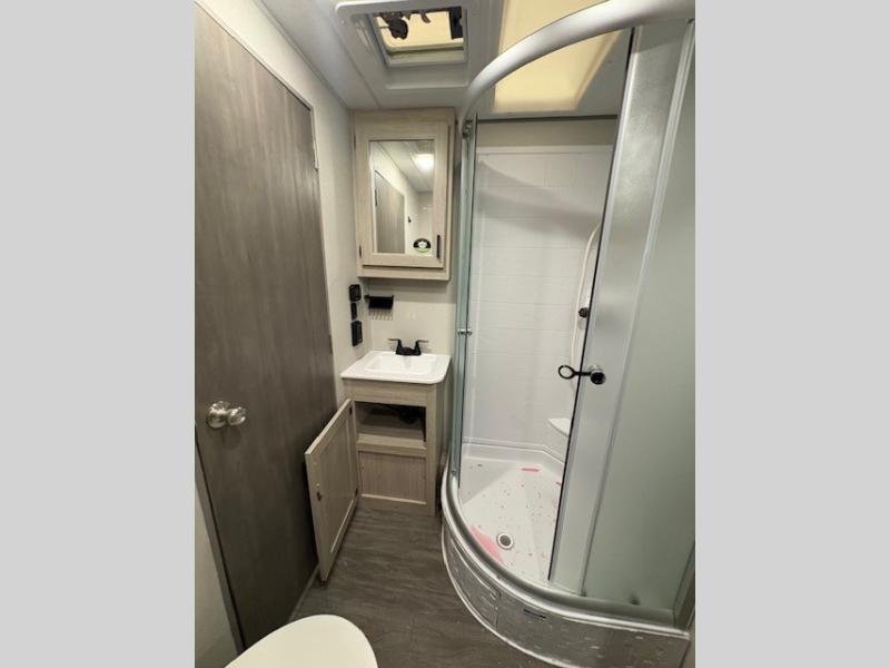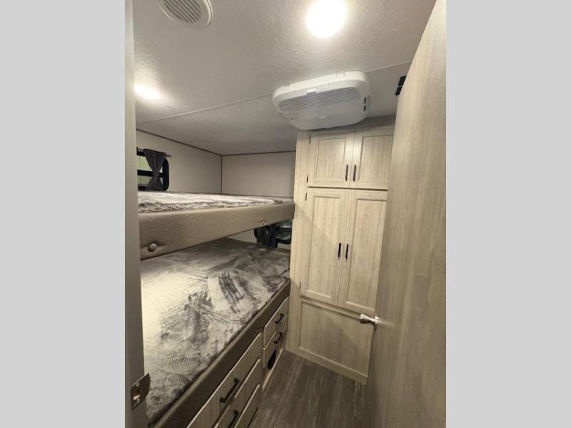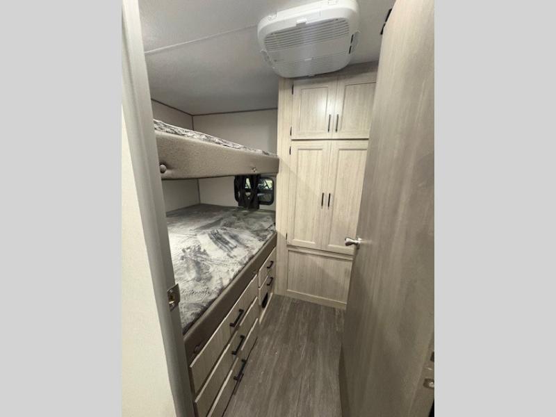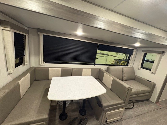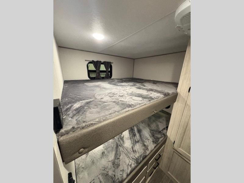 The rear private bunkhouse in this travel trailer is perfect for the kids or guests! It has a set of queen bunk beds with storage totes underneath and a linen closet. The dual entry bathroom is convenient for all to access it and has a 34" x 34" radius shower with a skylight above for natural lighting as you get ready. The chef can prepare their best meals with the three burner cooktop and everyone can enjoy them at the U-shaped dinette. The sofa is across from the entertainment center with an optional fireplace to add for extra comfort. The front private bedroom has a 60" x 74" queen bed to lay your head on at night and wardrobes on either side of it to keep your clothes out of the way and looking their best, plus an entrance into the dual entry bathroom!