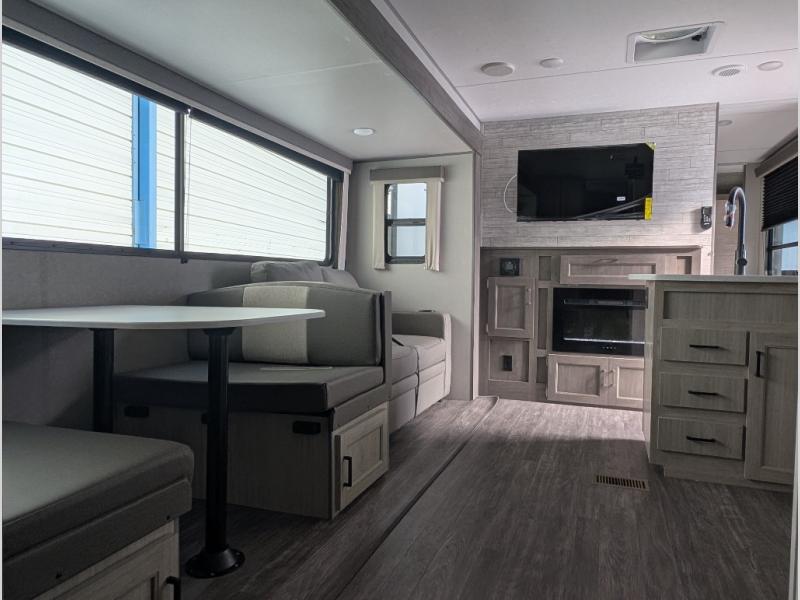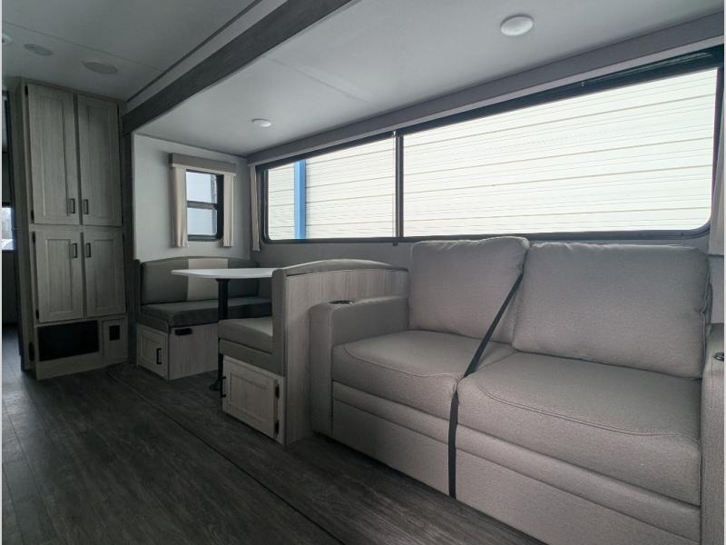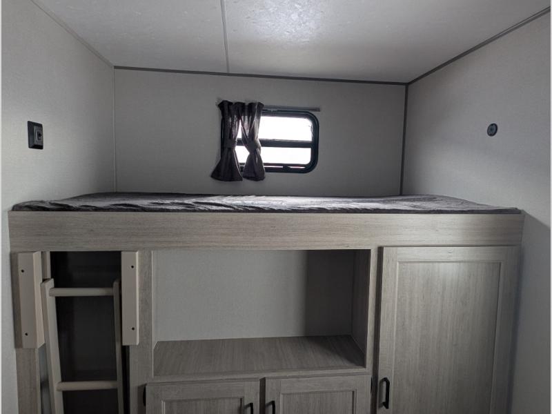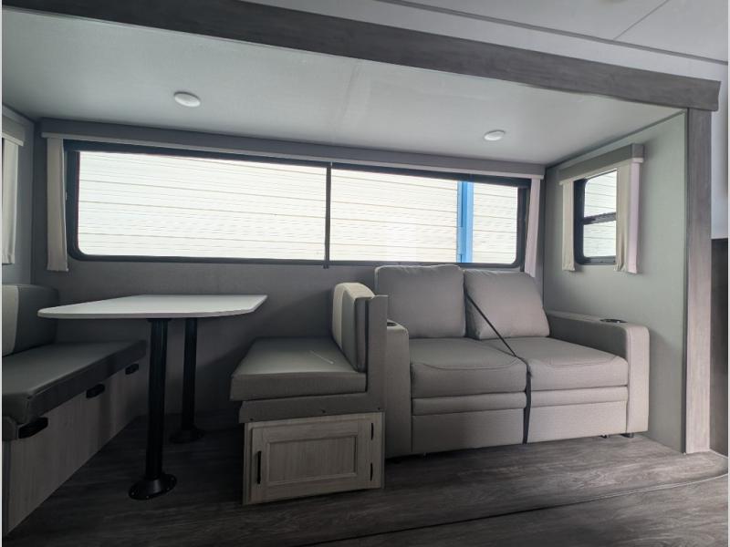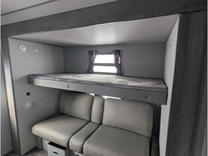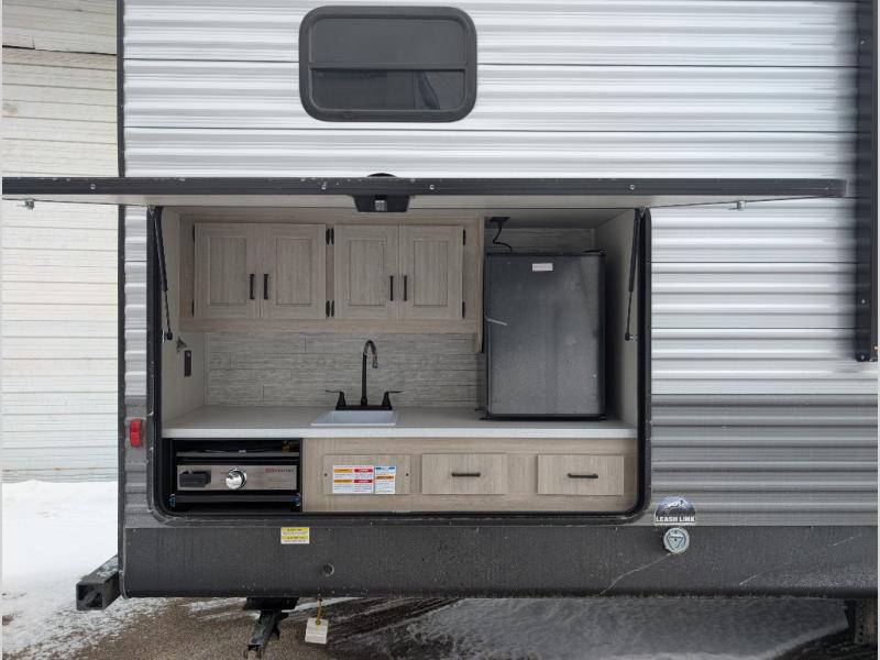 The whole gang will have a good time camping in this travel trailer! There is a place for everyone to sleep between the rear private bunkhouse with a 40" x 74" loft bed and a flip up bunk bed above a jackknife sofa, and the front private bedroom has a 60" x 74" queen bed slide, plus the booth dinette and 60" sofa in the main living area can provide extra sleeping spaces. You could even choose to switch out the bunk and sofa for an optional queen bed instead. The bedroom also has a dresser and a front closet that is big enough for your clothes and an area with washer and dryer prep. The chef can choose to either cook indoors with the three burner cooktop or breathe in some fresh air while cooking at the outside camp kitchen with a refrigerator, a sink, overhead cabinets, and a grill with drawers next to it for your cooking utensils!