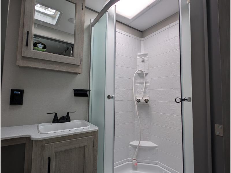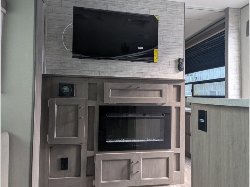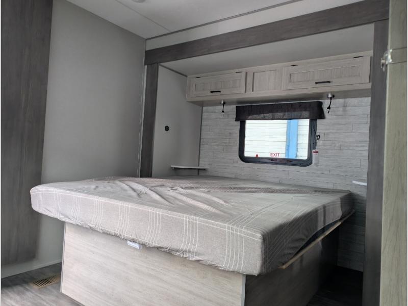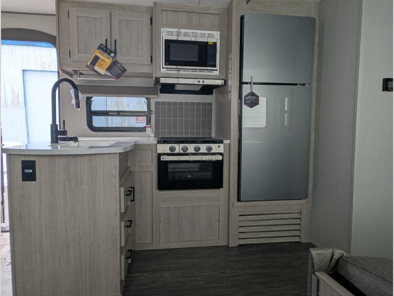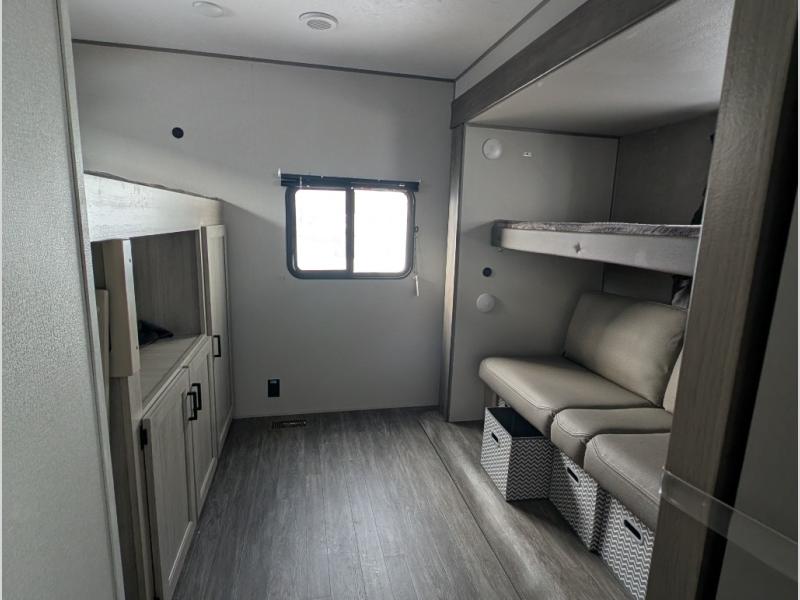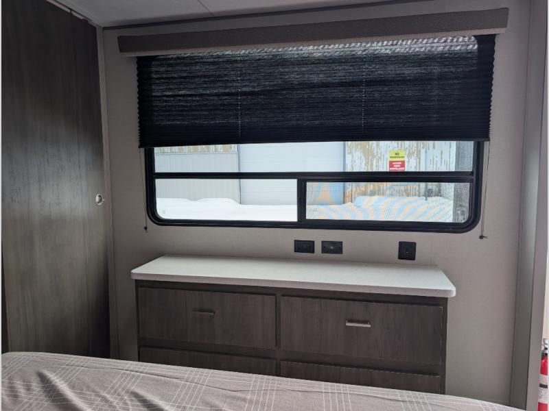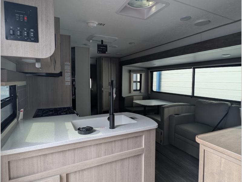 The whole gang will have a good time camping in this travel trailer! There is a place for everyone to sleep between the rear private bunkhouse with a 40" x 74" loft bed and a flip up bunk bed above a jackknife sofa, and the front private bedroom has a 60" x 74" queen bed slide, plus the booth dinette and 60" sofa in the main living area can provide extra sleeping spaces. You could even choose to switch out the bunk and sofa for an optional queen bed instead. The bedroom also has a dresser and a front closet that is big enough for your clothes and an area with washer and dryer prep. The chef can choose to either cook indoors with the three burner cooktop or breathe in some fresh air while cooking at the outside camp kitchen with a refrigerator, a sink, overhead cabinets, and a grill with drawers next to it for your cooking utensils!