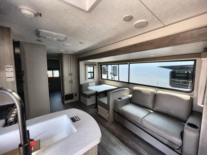 The whole gang will have a good time camping in this travel trailer! There is a place for everyone to sleep between the rear private bunkhouse with a 40" x 74" loft bed and a flip up bunk bed above a jackknife sofa, the 60" x 74" queen bed slide in the bedroom, plus the booth dinette and 60" trundle sofa in the main living area. The bedroom also has a dresser and a front closet that is big enough for your clothes and an area with washer and dryer prep. The chef can choose to either cook indoors with the three-burner cooktop or breathe in some fresh air while cooking at the outside camp kitchen with a refrigerator, a sink, overhead cabinets, and a grill with drawers next to it for your cooking utensils!