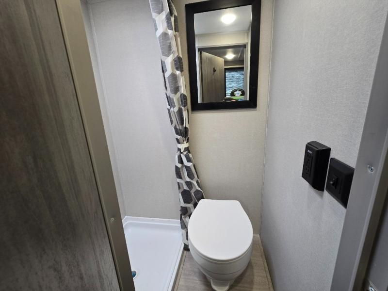 This lightweight travel trailer includes everything you need for comfortable camping trips at the lake. You can make your meals on the two burner cooktop or in the stainless steel microwave, and a 3.3 cu. ft. 12V refrigerator will keep leftovers fresh. A front queen bed provides a great night's rest, and there are 29" x 70" bunk beds for your guests or little ones. And a private bath with a 24" x 32" shower and toilet will let you easily freshen up without having to use the camp's facilities!