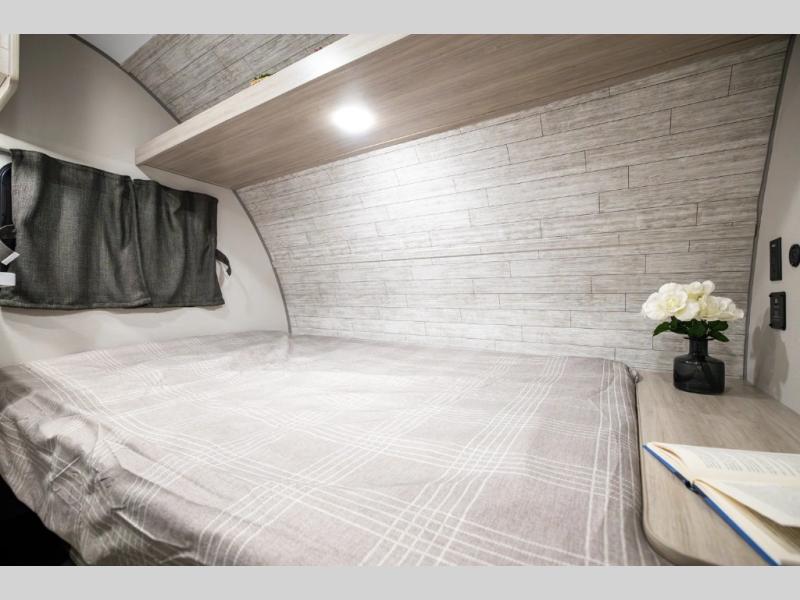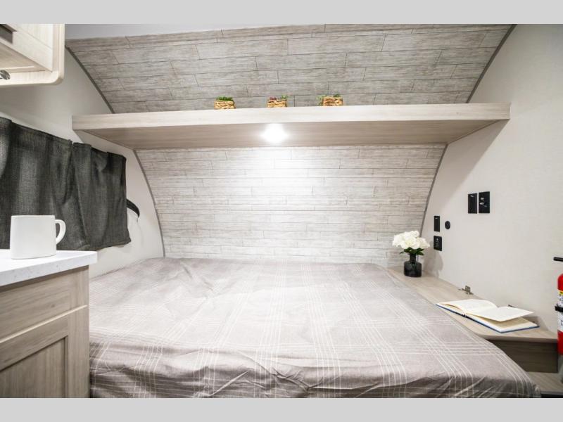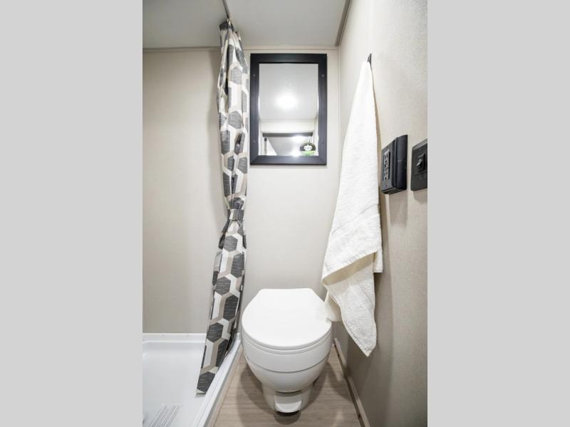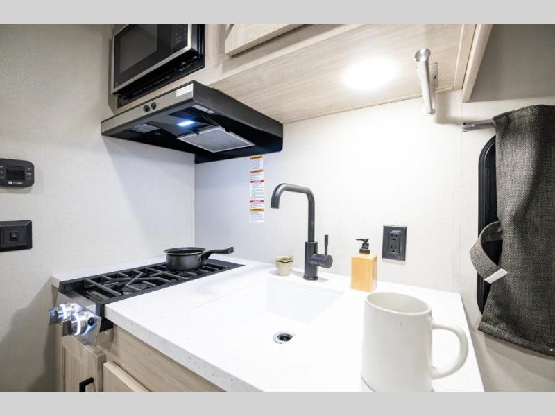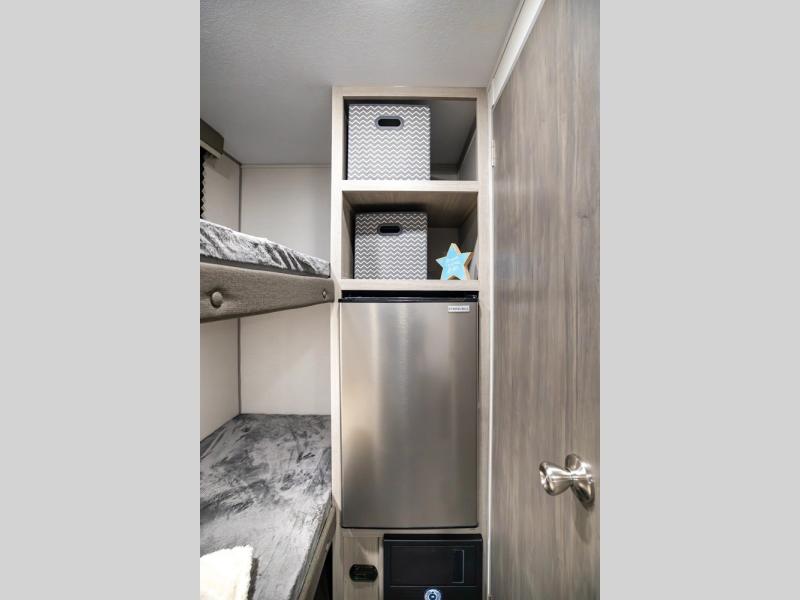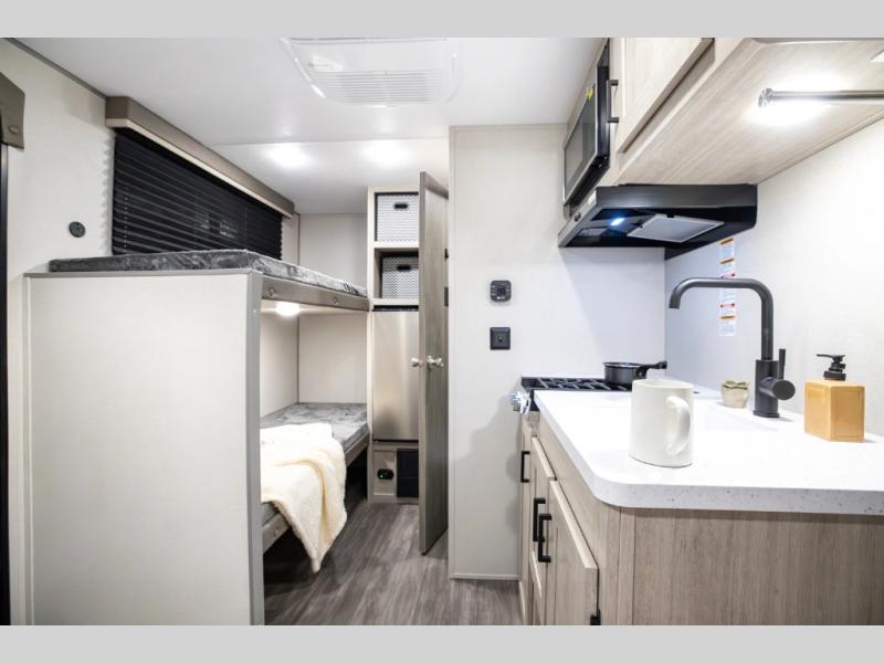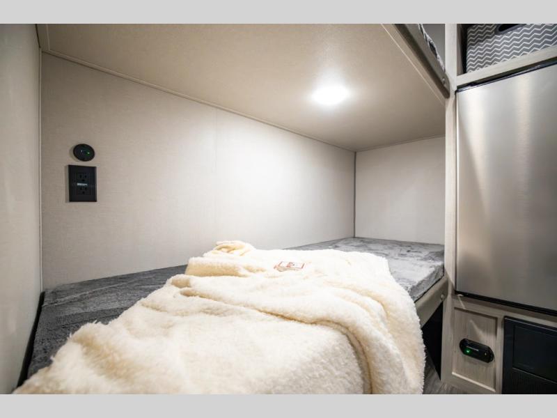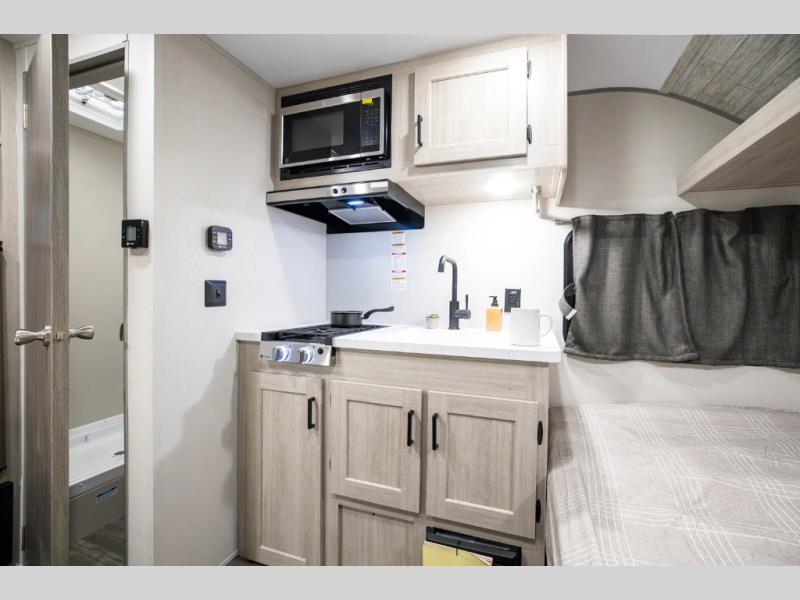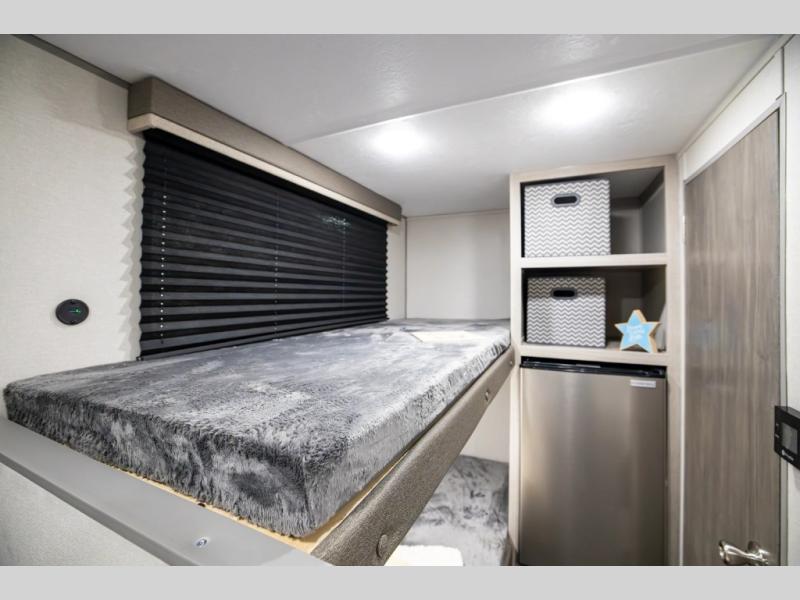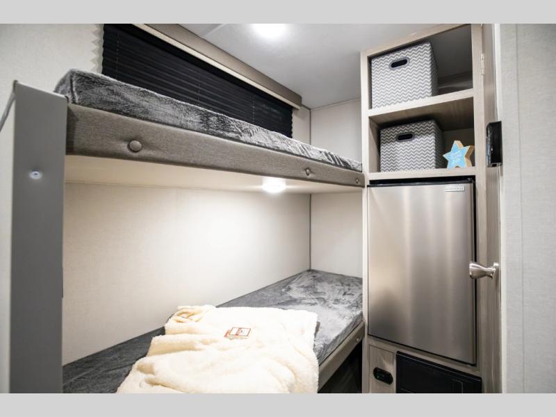 This lightweight travel trailer includes everything you need for comfortable camping trips at the lake. You can make your meals on the two burner cooktop or in the stainless steel microwave, and a 3.3 cu. ft. 12V refrigerator will keep leftovers fresh. A front queen bed provides a great night's rest, and there are 29" x 70" bunk beds for your guests or little ones. And a private bath with a 24" x 32" shower and toilet will let you easily freshen up without having to use the camp's facilities!