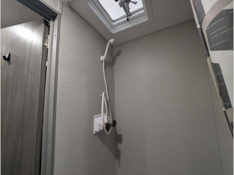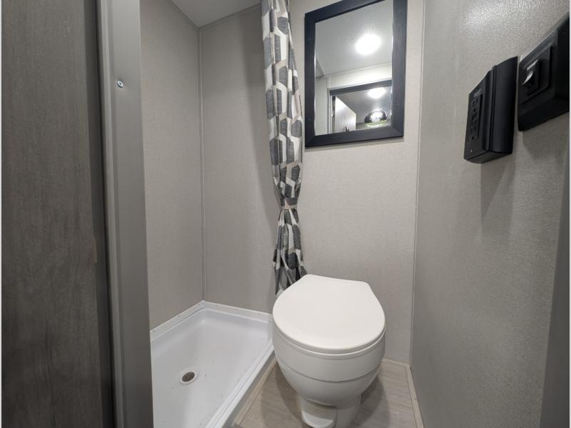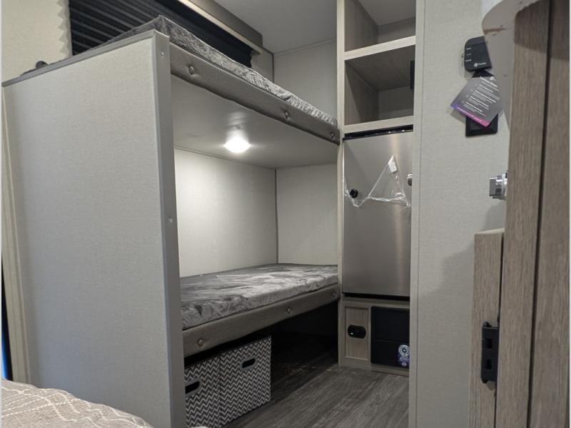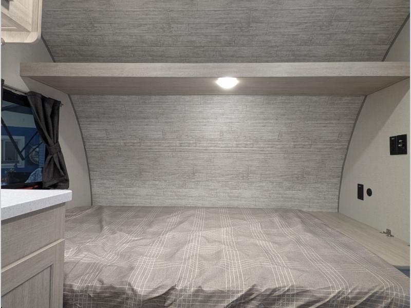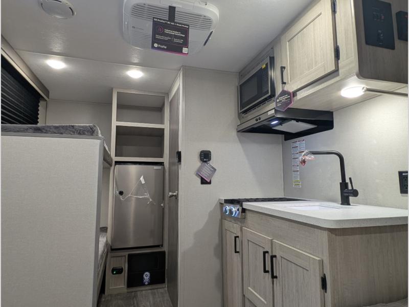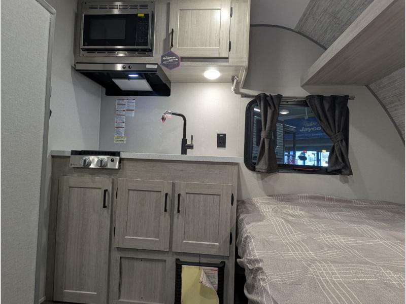 This lightweight travel trailer includes everything you need for comfortable camping trips at the lake. You can make your meals on the two burner cooktop or in the stainless steel microwave, and a 3.3 cu. ft. 12V refrigerator will keep leftovers fresh. A front queen bed provides a great night's rest, and there are 29" x 70" bunk beds for your guests or little ones. And a private bath with a 24" x 32" shower and toilet will let you easily freshen up without having to use the camp's facilities!