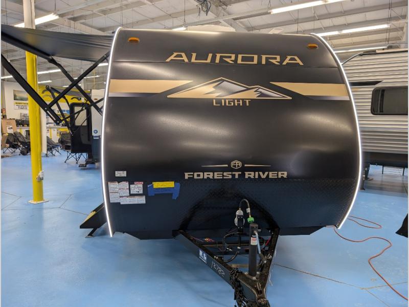 Comfortability, usability, and quality is what you will find in each one of these Forest River Aurora Light travel trailers! They are designed with a superior build and packed full with industry leading, functional, and distinctive standard features. The diamond plate rock guard will protect your unit from road debris and the nitrogen filled radial tires, which keep their pressure longer, offer better fuel economy. You will also find upgraded JBL Elite exterior speaker outside, an electric awning with multicolor lights and remote, plus flush mount baggage doors for easy packing. The interiors are beautifully designed with matte black kitchen and bath faucets, black nightshades in the living room, and GE kitchen appliances!