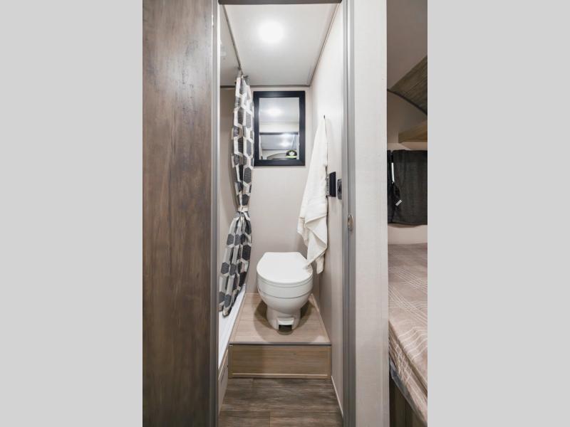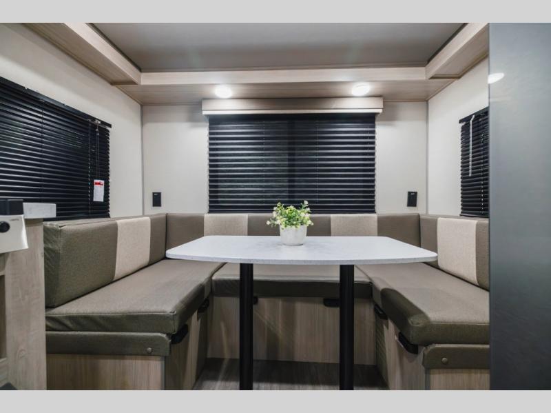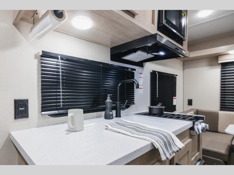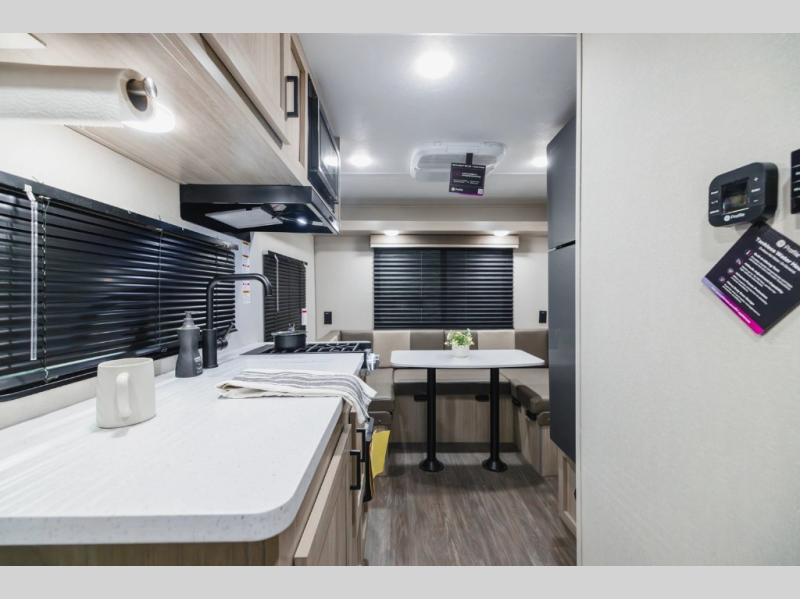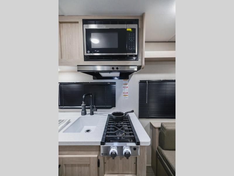 You will enjoy every adventure in this travel trailer for two to four! You will have a queen bed up front to sleep on each night, and the rear U-shaped dinette can easily be folded down to create additional sleeping for one or two more depending on size. Use the two burner cooktop and microwave oven to create meals inside. A centrally located bathroom is easily accessible from the entry and features a 36" x 30" shower, toilet, and mirror plus storage shelf. You also have an 11' electric awning on the outside with multi-colored lights with remote to select from depending on your mood, and exterior storage in front for all of your camp chairs and outdoor gear, plus more!