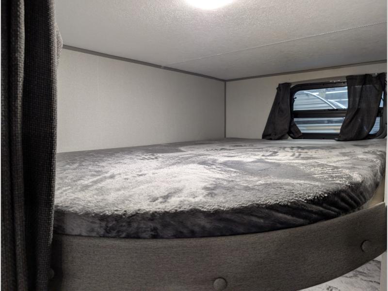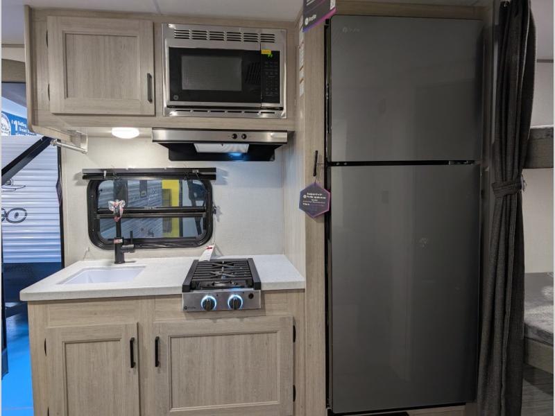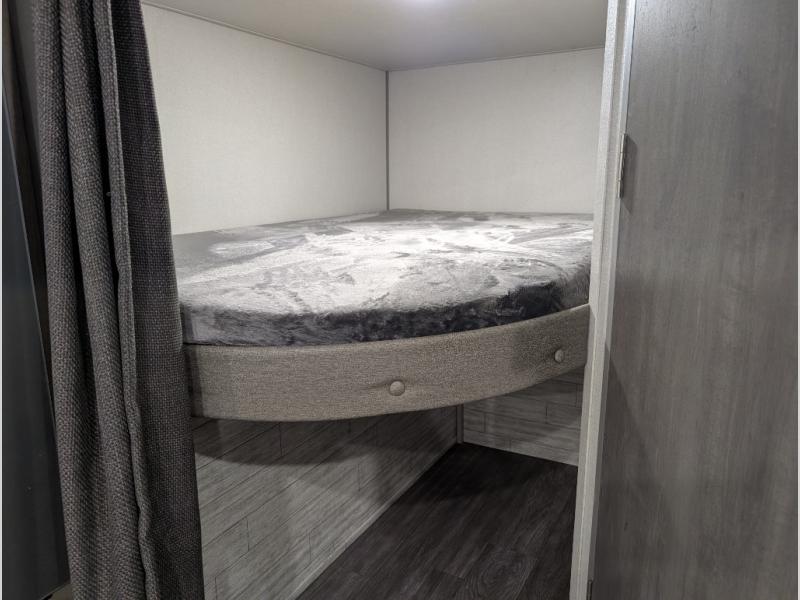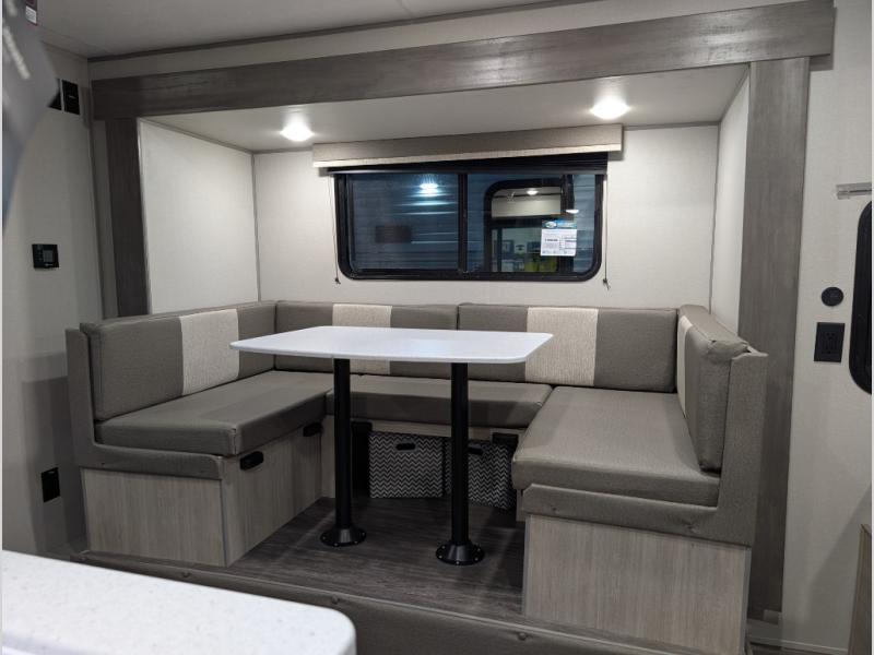 Your family or group will have a fun time camping in this travel trailer! The front Murphy bed provides versatility with a sofa to sit on during the day and a 60" x 74" bed to sleep on at night. The U-shaped dinette slide creates more interior space, a comfortable place to eat, and even an extra sleeping space for a guest or two depending on their sizes. The 46" x 74" double-size bunk beds are also a comfortable place to rest, and they are conveniently next to the rear corner bathroom. If you wish to cook out in the great outdoors then add the optional camper kitchen which comes with a cabinet, a refrigerator, and a pull out griddle!