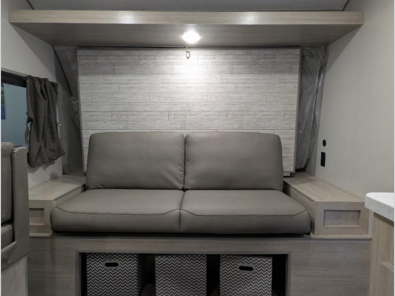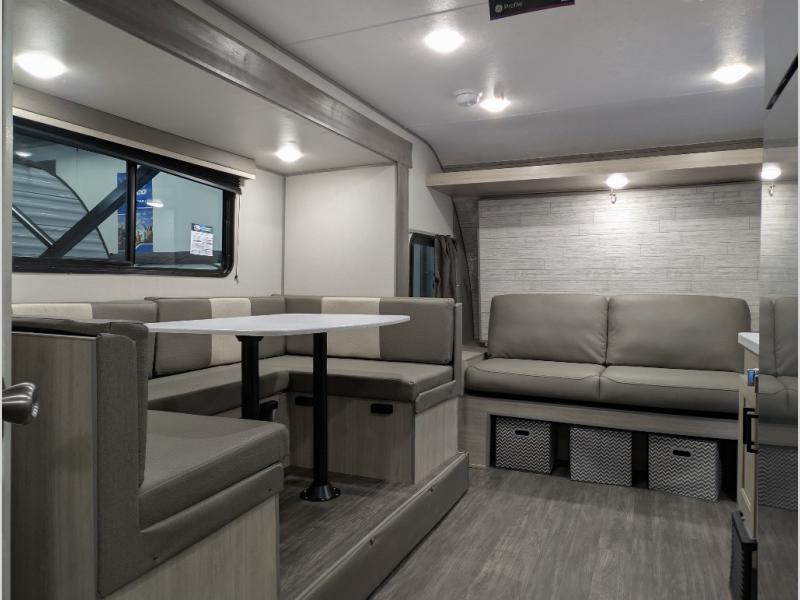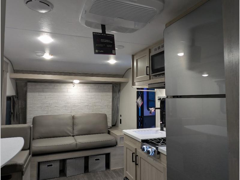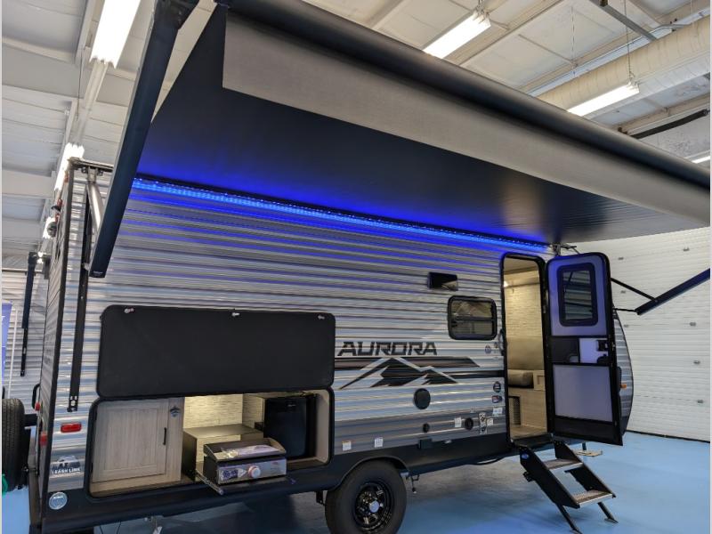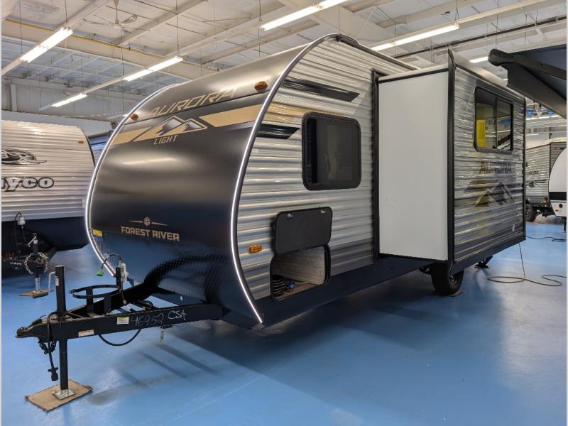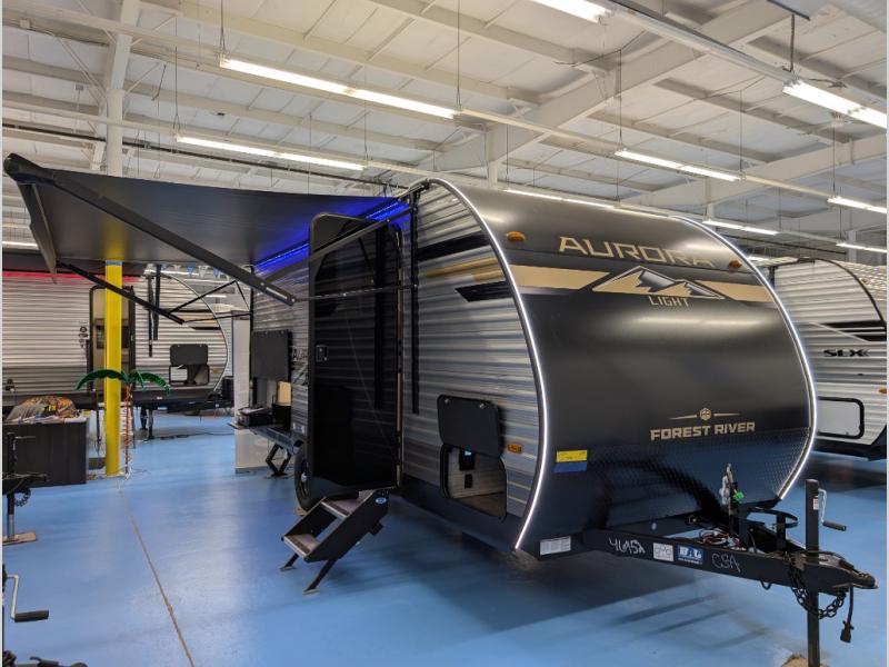 Comfortability, usability, and quality is what you will find in each one of these Forest River Aurora Light travel trailers! They are designed with a superior build and packed full with industry leading, functional, and distinctive standard features. The diamond plate rock guard will protect your unit from road debris and the nitrogen filled radial tires, which keep their pressure longer, offer better fuel economy. You will also find upgraded JBL Elite exterior speaker outside, an electric awning with multicolor lights and remote, plus flush mount baggage doors for easy packing. The interiors are beautifully designed with matte black kitchen and bath faucets, black nightshades in the living room, and GE kitchen appliances!