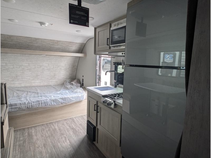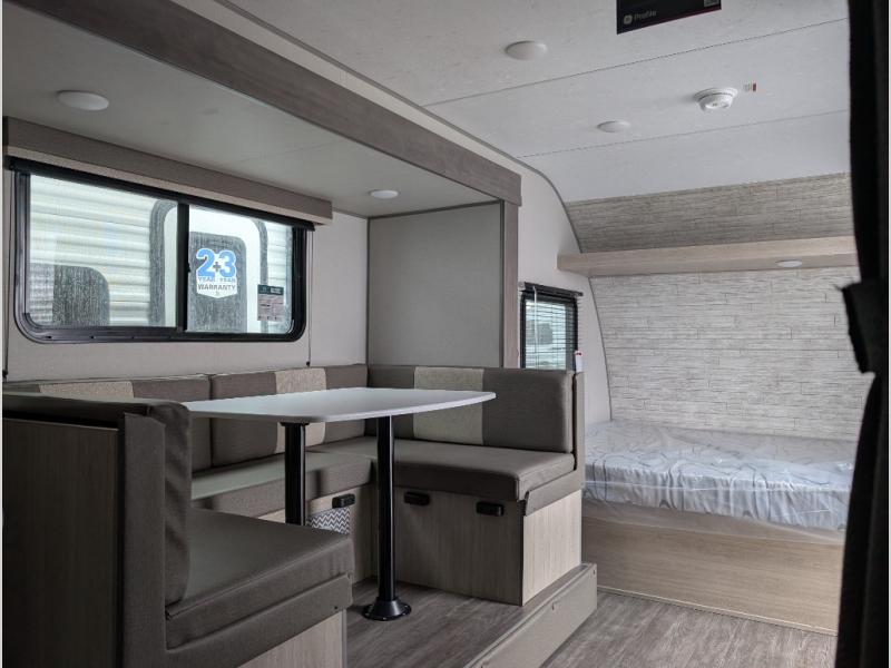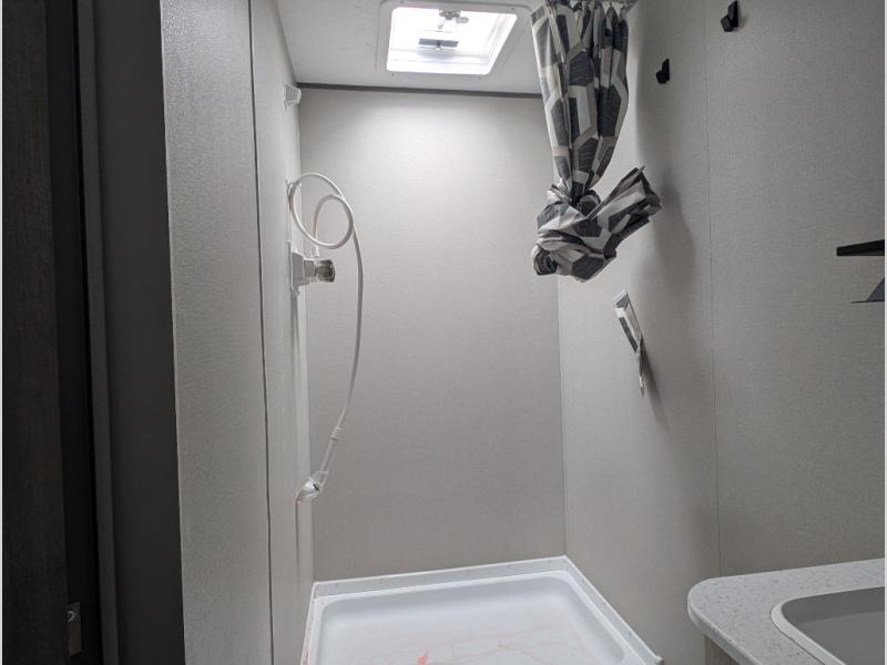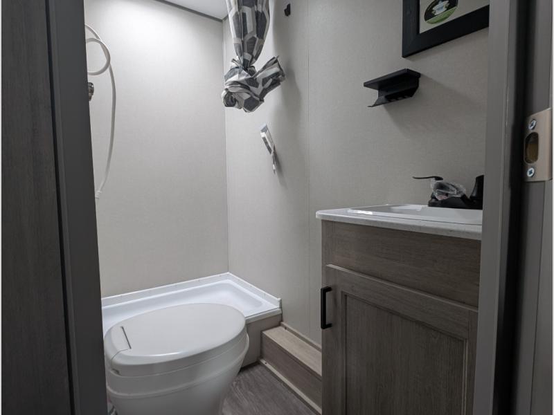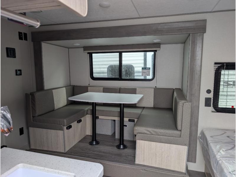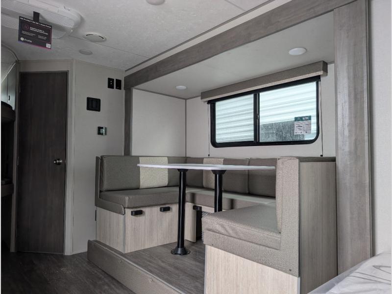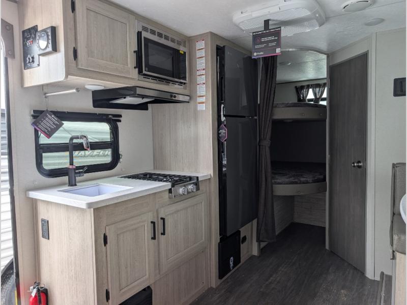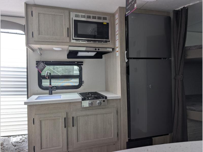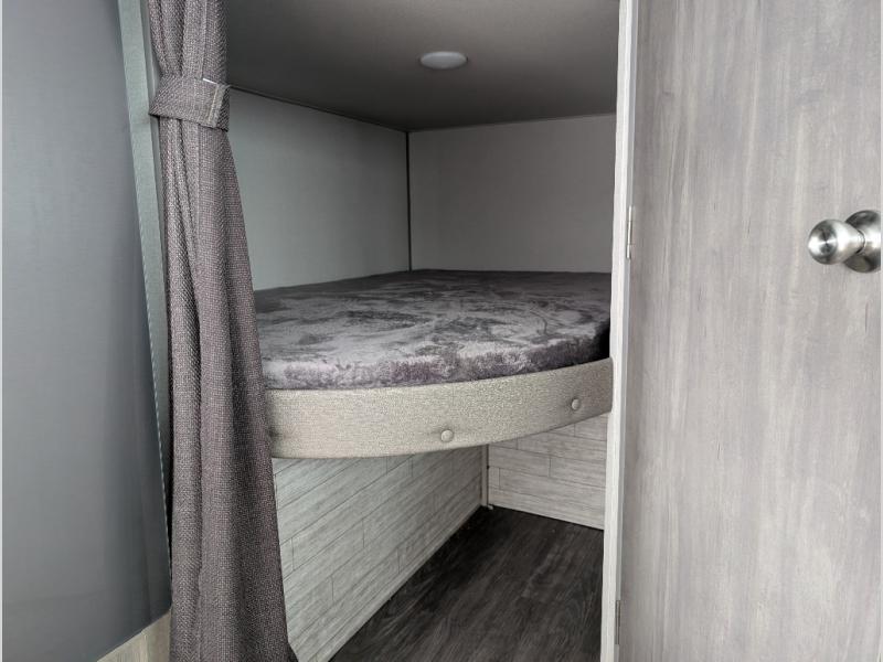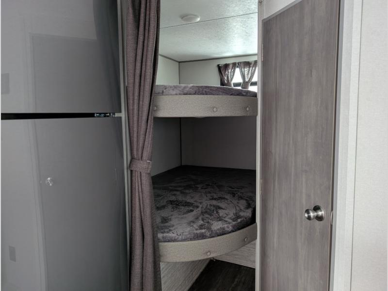 This travel trailer is ideal for anyone seeking a comfortable, stress-free getaway. Gather around the U-shaped dinette for meals, games, or movie nights – it's the perfect spot to make memories with loved ones. You can unwind in the full bathroom, complete with a tub/shower combo, or catch some Z's on the double-size bunk beds, perfect for kids or guests. The kitchen is equipped with a refrigerator, microwave, and sink, making it easy to whip up meals on the go. Overhead cabinets provide ample storage for your culinary needs. Finally, drift off to sleep under the stars, feeling refreshed and rejuvenated in the comfy queen bed surrounded by storage galore for your belongings.