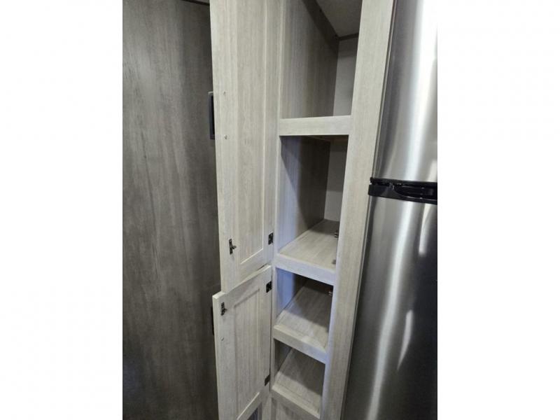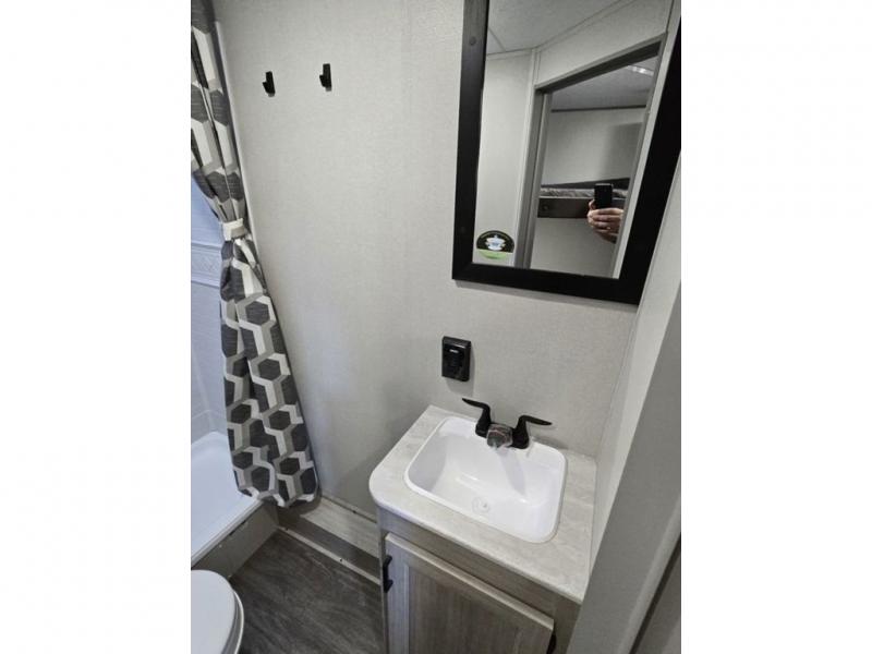 Invite the whole crew along in this bunkhouse travel trailer! There is lower interior storage under the bunks, plus exterior storage and a pass-thru storage so nothing gets left behind. You'll have the front queen bed all to yourselves, and there is a privacy curtain here when you need to get dressed in the morning. The chef will be able to make breakfast on the three burner cooktop or in the microwave oven, and there is a booth dinette where you can dine at. Don't overlook the full bath to freshen up after a day of hiking or biking!